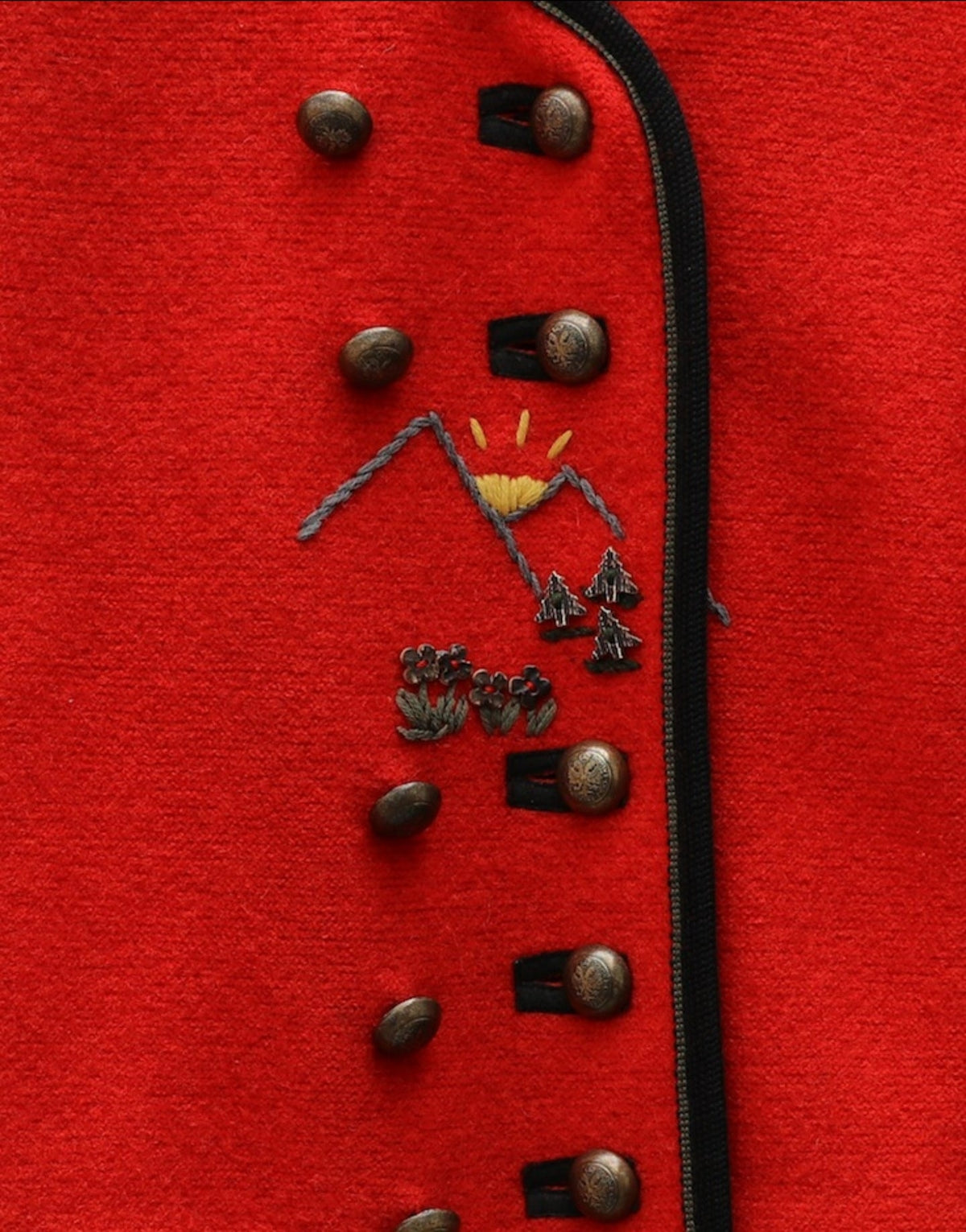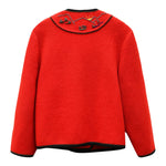 Prix unitaire parVeste autrichienne rouge en laine, imprimé brodé, fermeture boutons croisés, poches sur les côtés, manches longues, col rond. Pièce unique vintage des années 70, un essentiel de la garde robe.