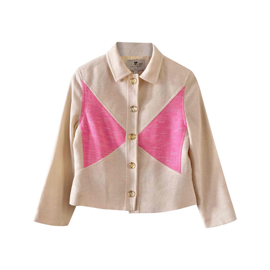 Veste Courrèges, en laine blanc écru, découpes géométriques roses fluo en patchwork, boutons boules transparents, forme soencer court, fabriqué en France, taille 34 et 36 porté ici sur un mannequin T36, pièce rare des années 90’s.