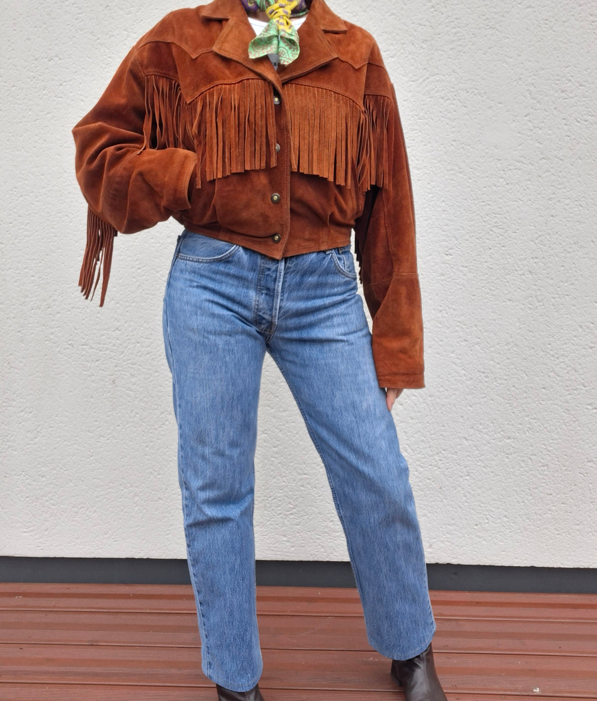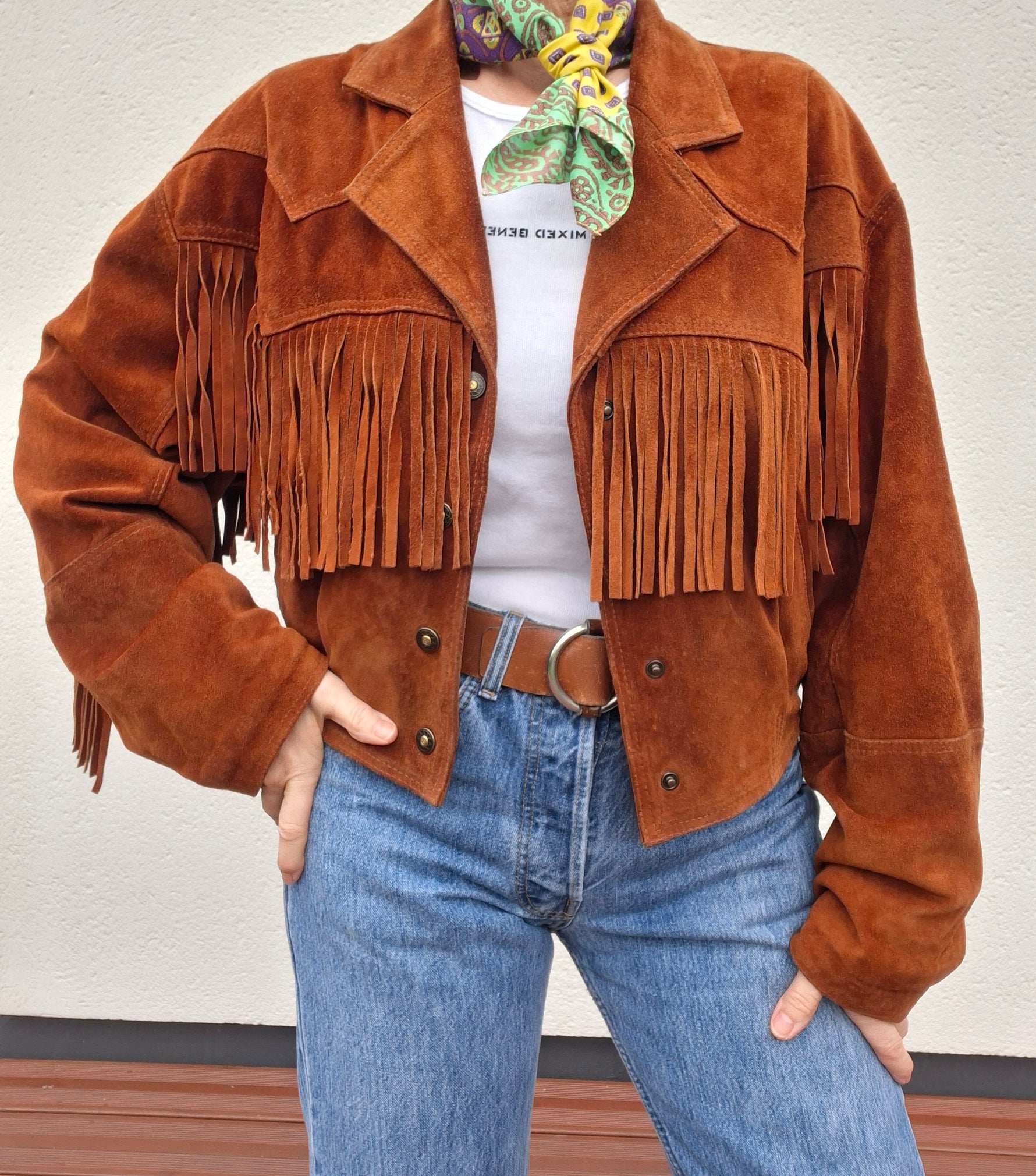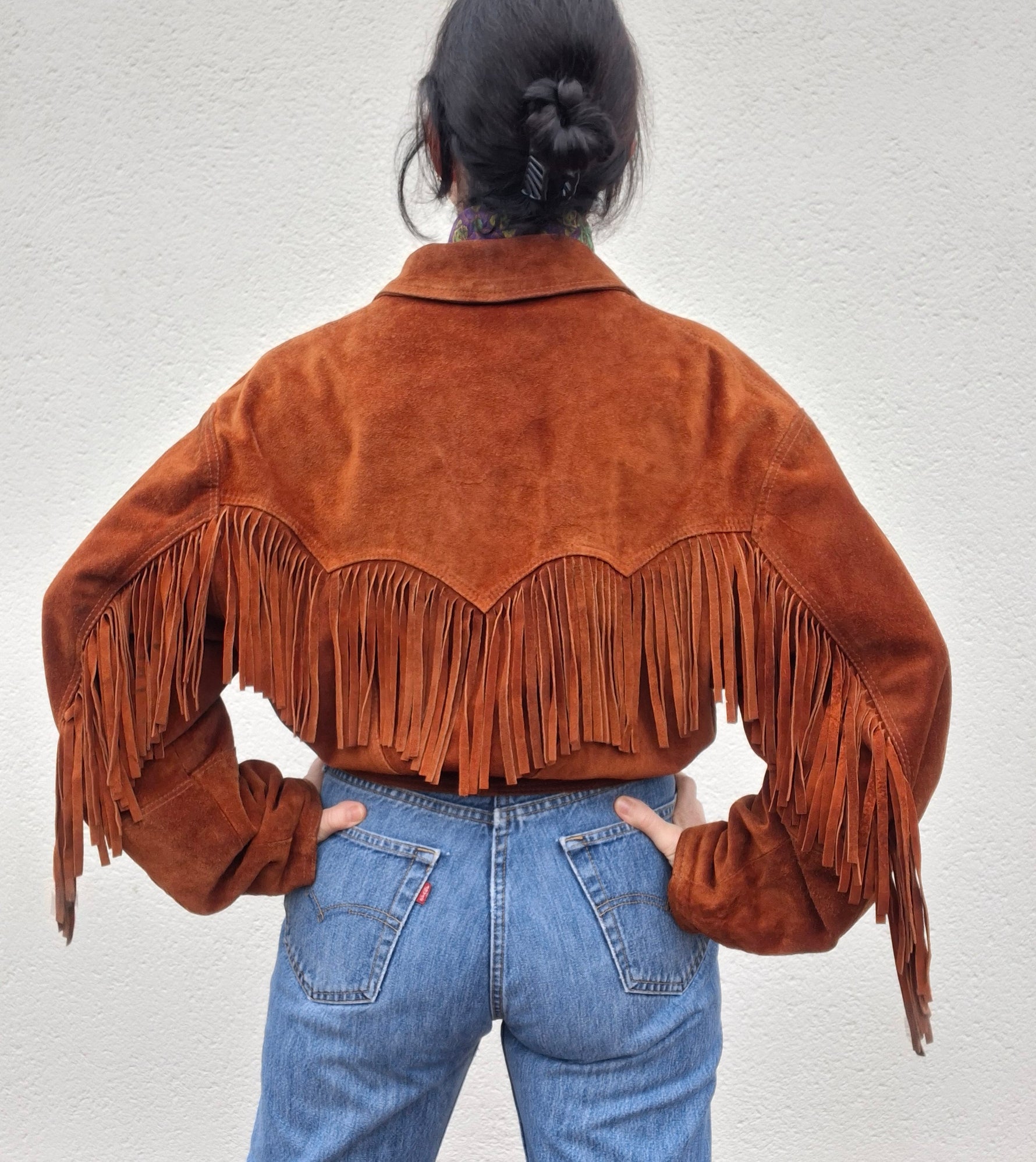 Veste courte à franges en daim années 80. Empiècements sur les épaules et dans le dos. 2 poches.Martingale dans le bas du dos. Doublure satinée avec une poche intérieure. Fermeture par pressions. Portée par Patricia qui fait une taille 40.Longueur 48cm.Convient à une taille 38 et 40