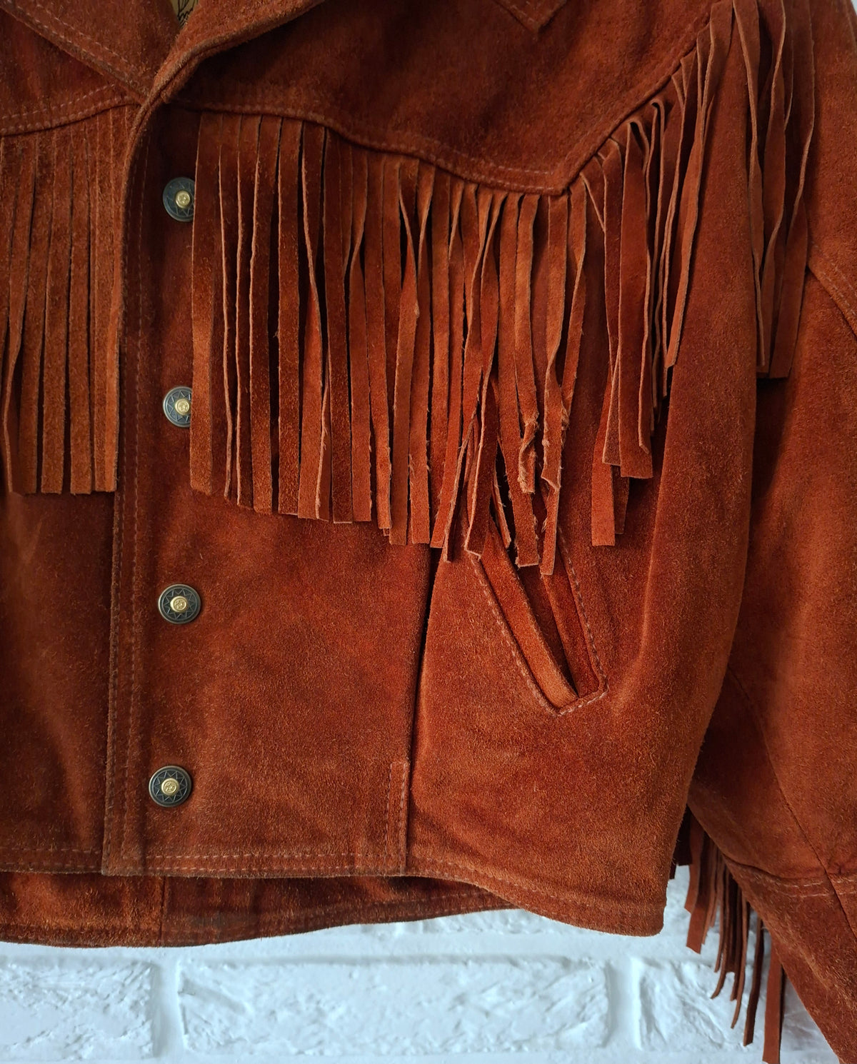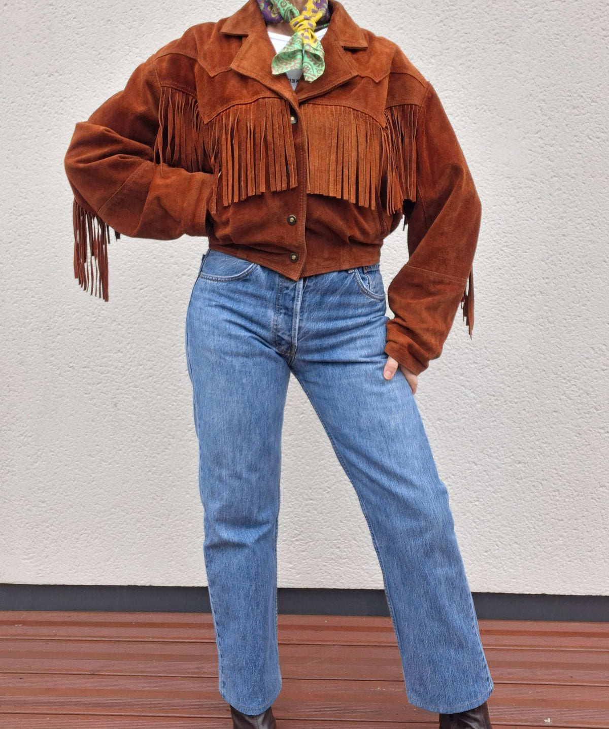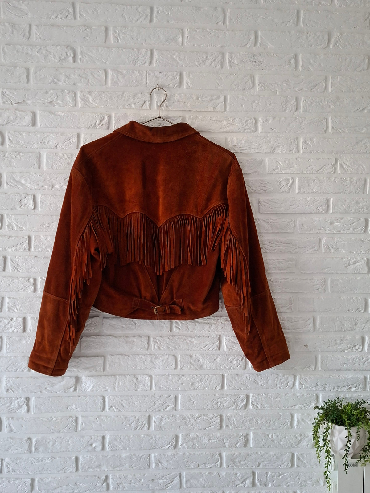 Veste courte à franges en daim années 80. Empiècements sur les épaules et dans le dos. 2 poches.Martingale dans le bas du dos. Doublure satinée avec une poche intérieure. Fermeture par pressions. Portée par Patricia qui fait une taille 40.Longueur 48cm.Convient à une taille 38 et 40