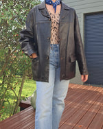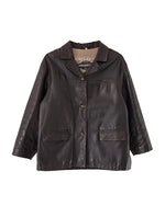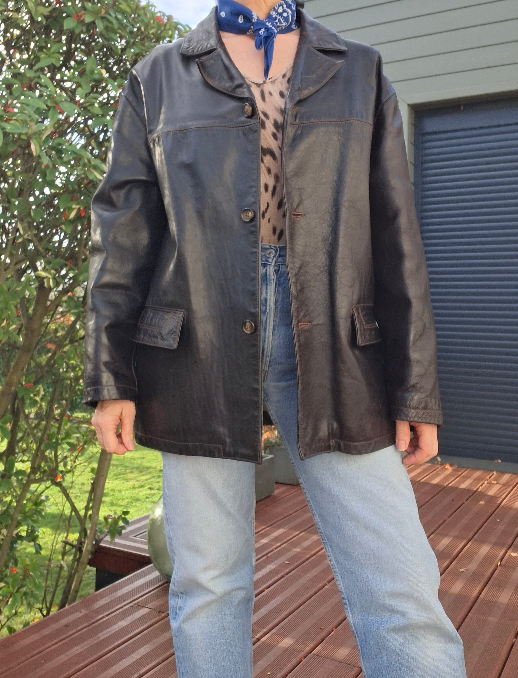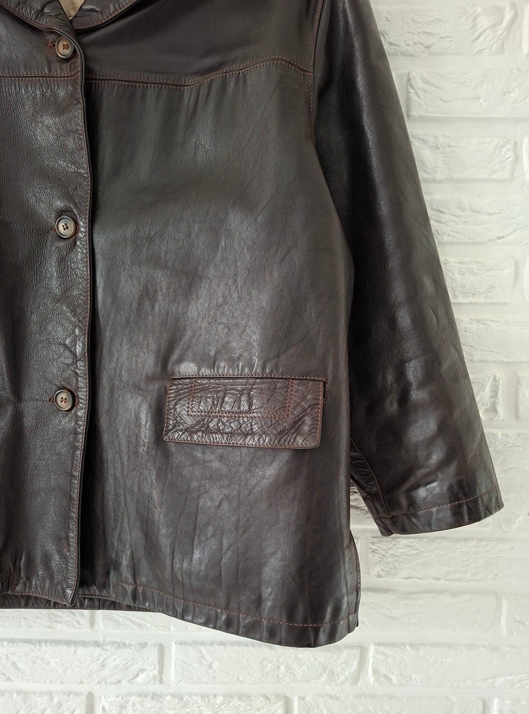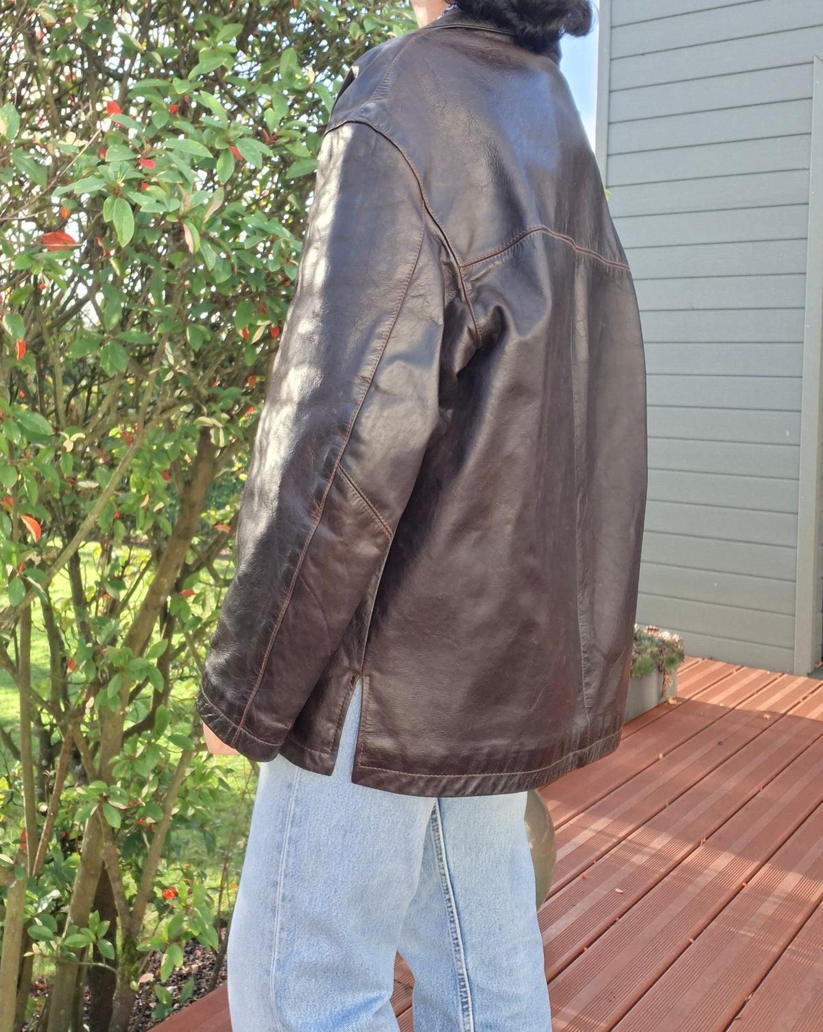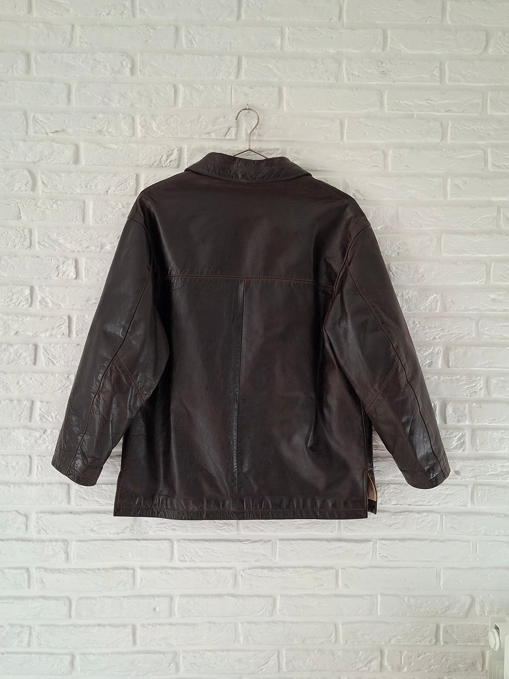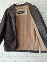Veste en cuir marron. Forme droite avec fentes sur les côtés. 2 poches à rabat. Doublure chaude. Fermeture boutonnée. Cuir robuste. Veste notée taille M.Poitrine 60cm.Longueur 69cm.Taille 40