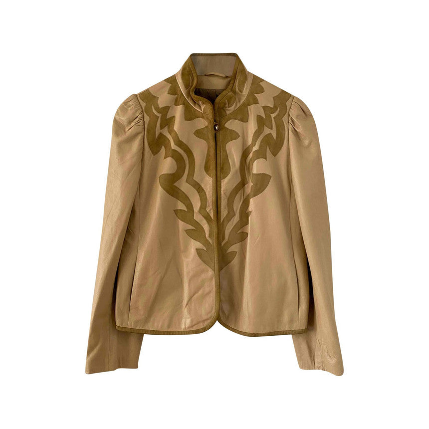 Veste en cuir Louis Féraud, en cuir d’agneau beige camel et brodé patchwork motifs western en daim camel, col montant, manches ballons gigots, fermeture par un bouton bijoux, taille 36 porté ici sur un mannequin T36 et ouvert sur une personne T40.
