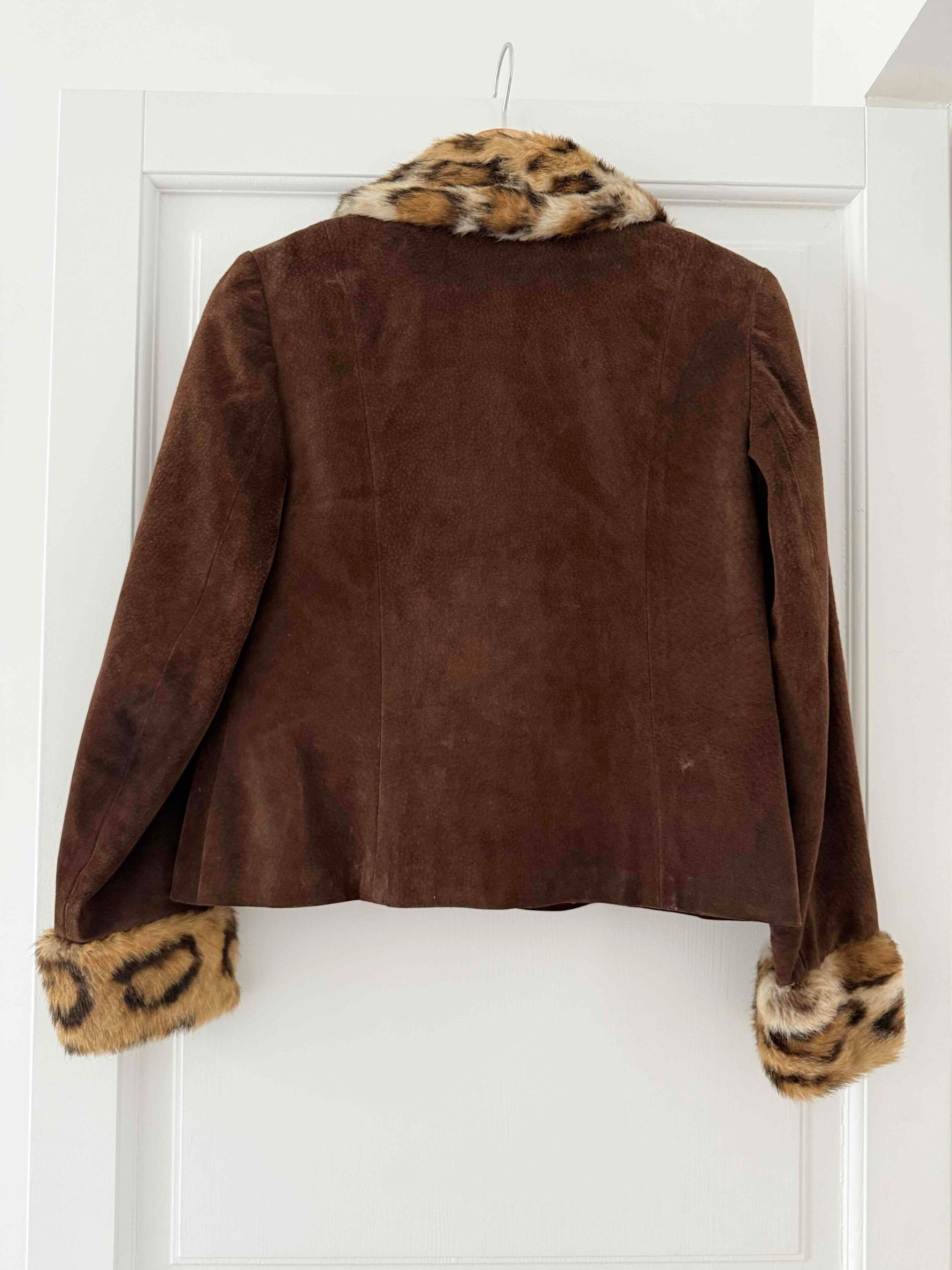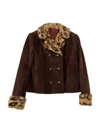 Prix unitaire parVeste en daim marron, avec col et poignets en fausse fourrure léopard. Fermeture à l’avant par 6 boutons. Doublure intérieure intacte. Portée ici sur une taille 36 pour 1m64