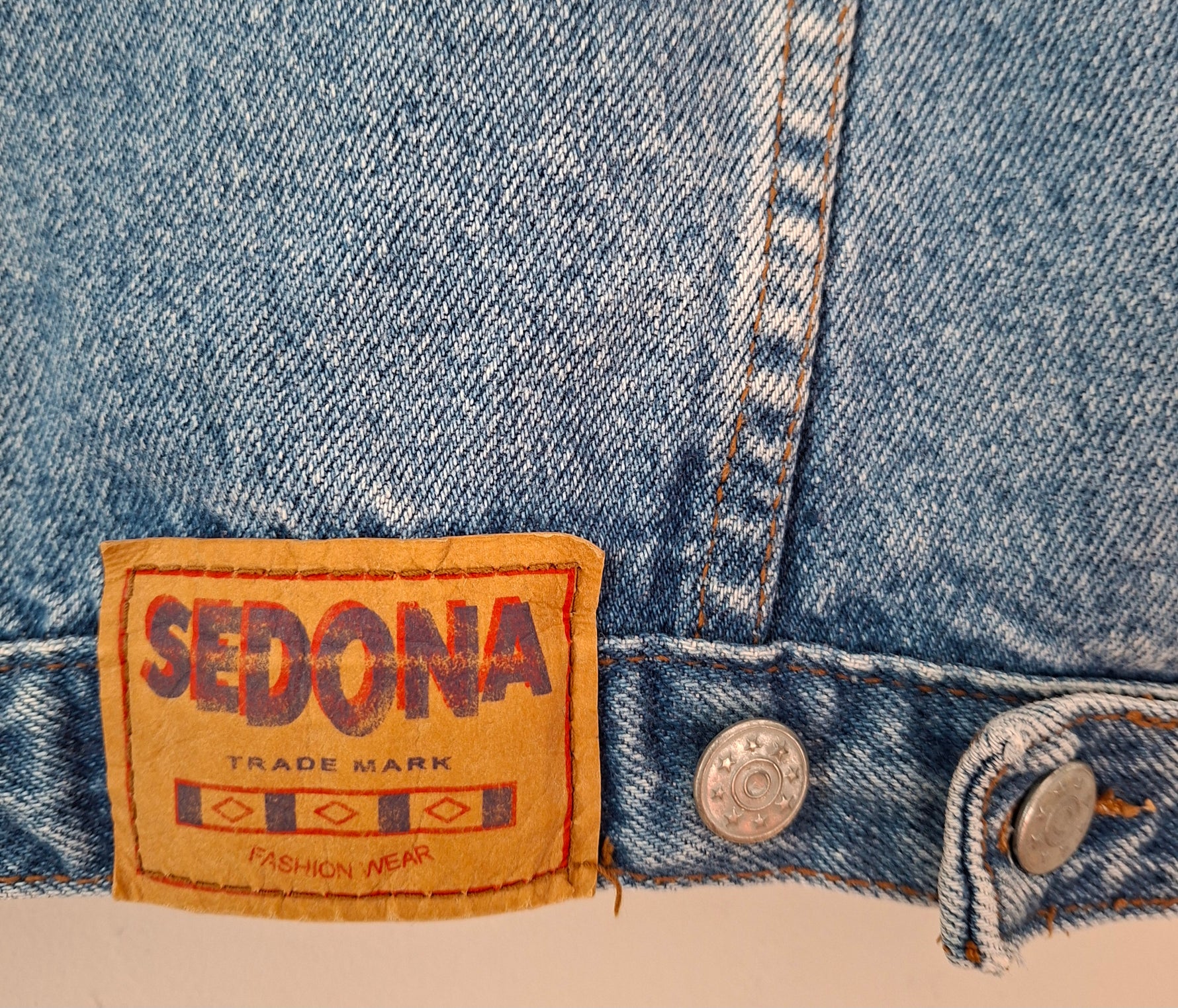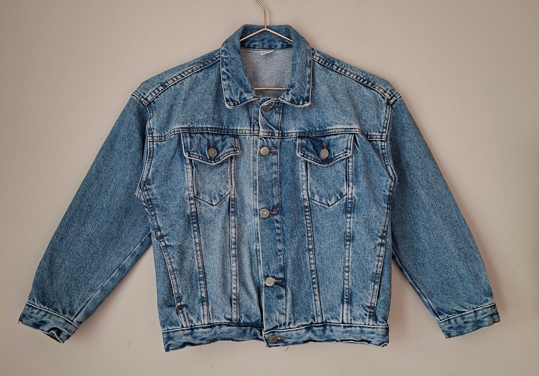 Veste en denim bleu .2 poches à rabats sur la poitrine. 2 poches latérales. Vintage 80's. Portée ici sur un mannequin taille 38.Les mesures à plat Épaules 50cm Aisselles 48cm.Longueur 50cm (PAT30)