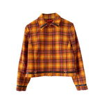 Veste courte Manoukian en laine, à carreaux tartans jaunes, oranges, roses et bruns, gansé de similicuir avec détails de boucles étriers dorés, Alain Manoukian, y2k, taille 36 portée ici sur un mannequin T36.