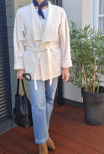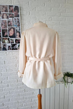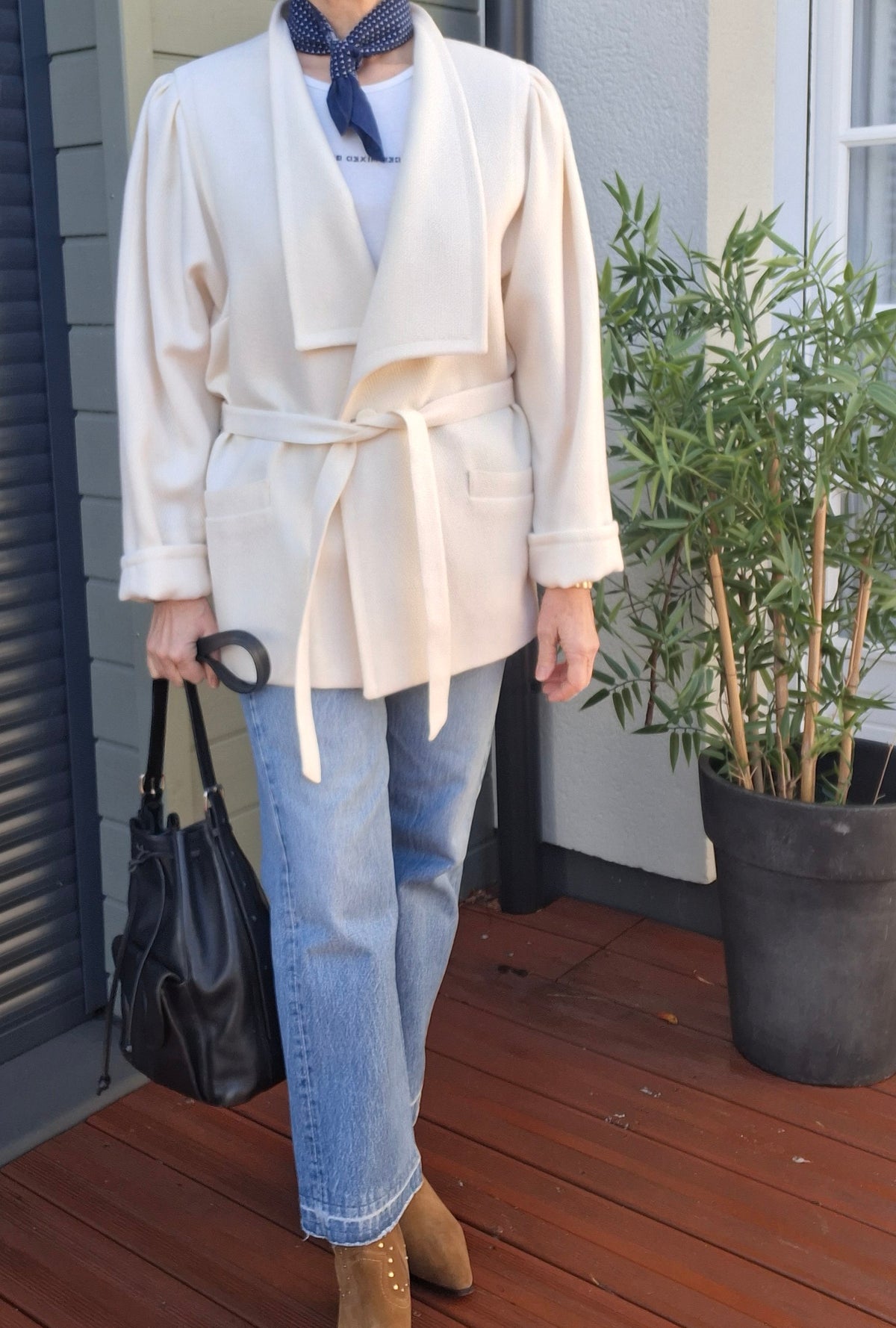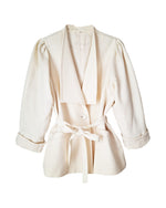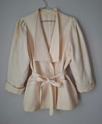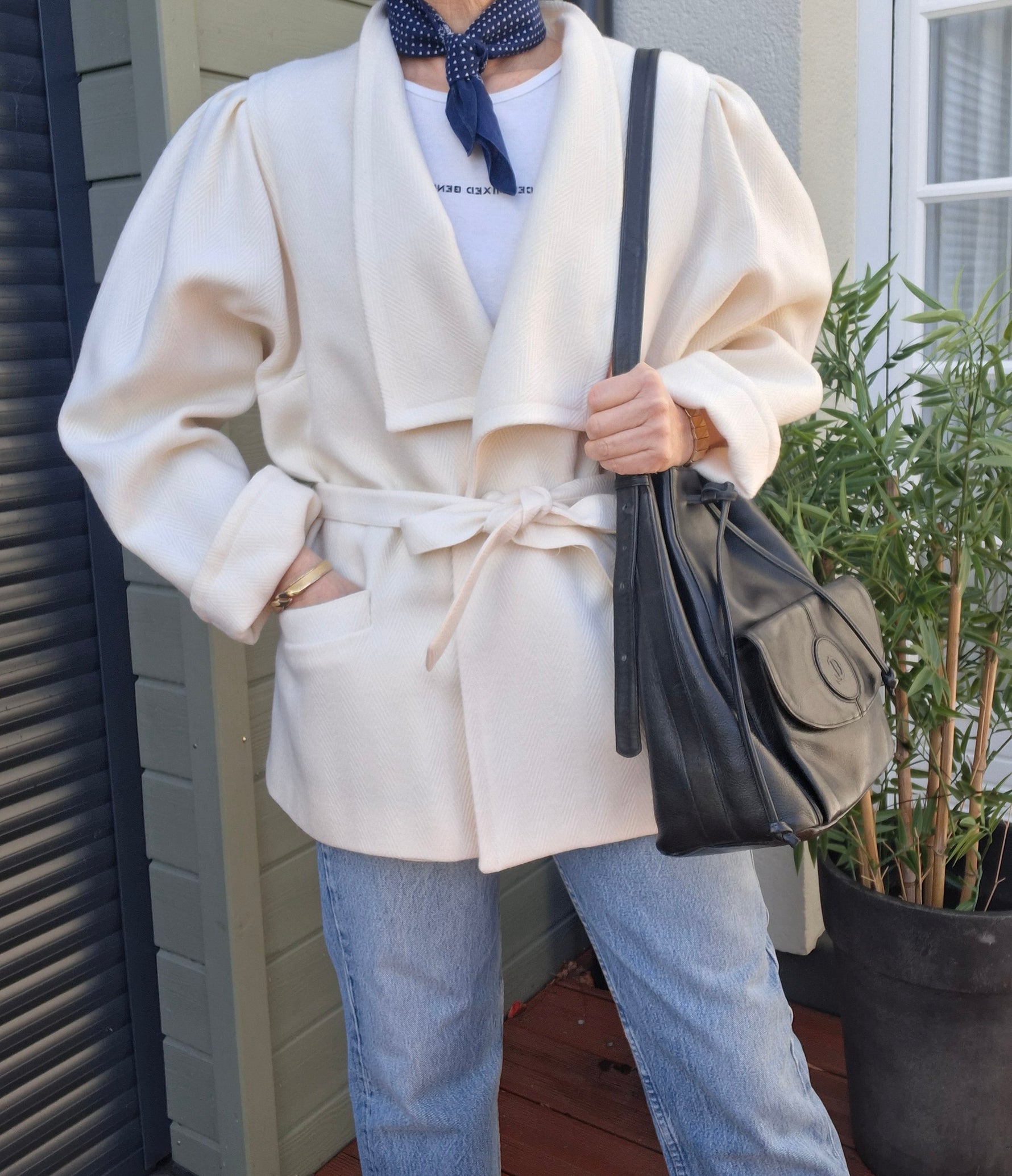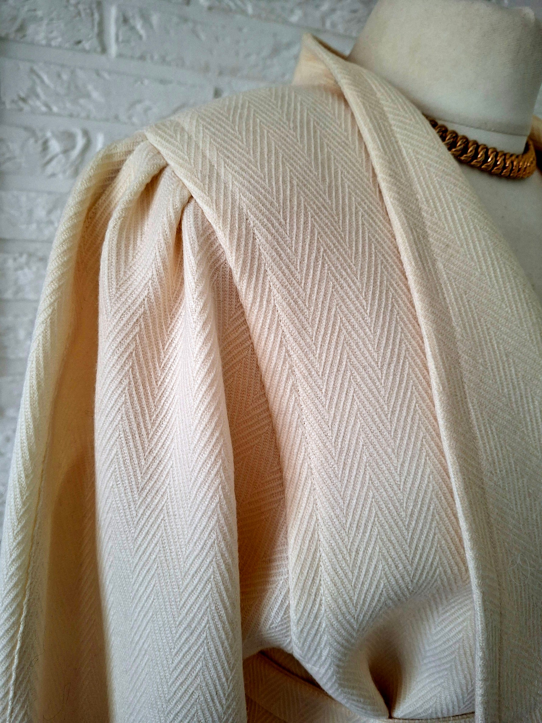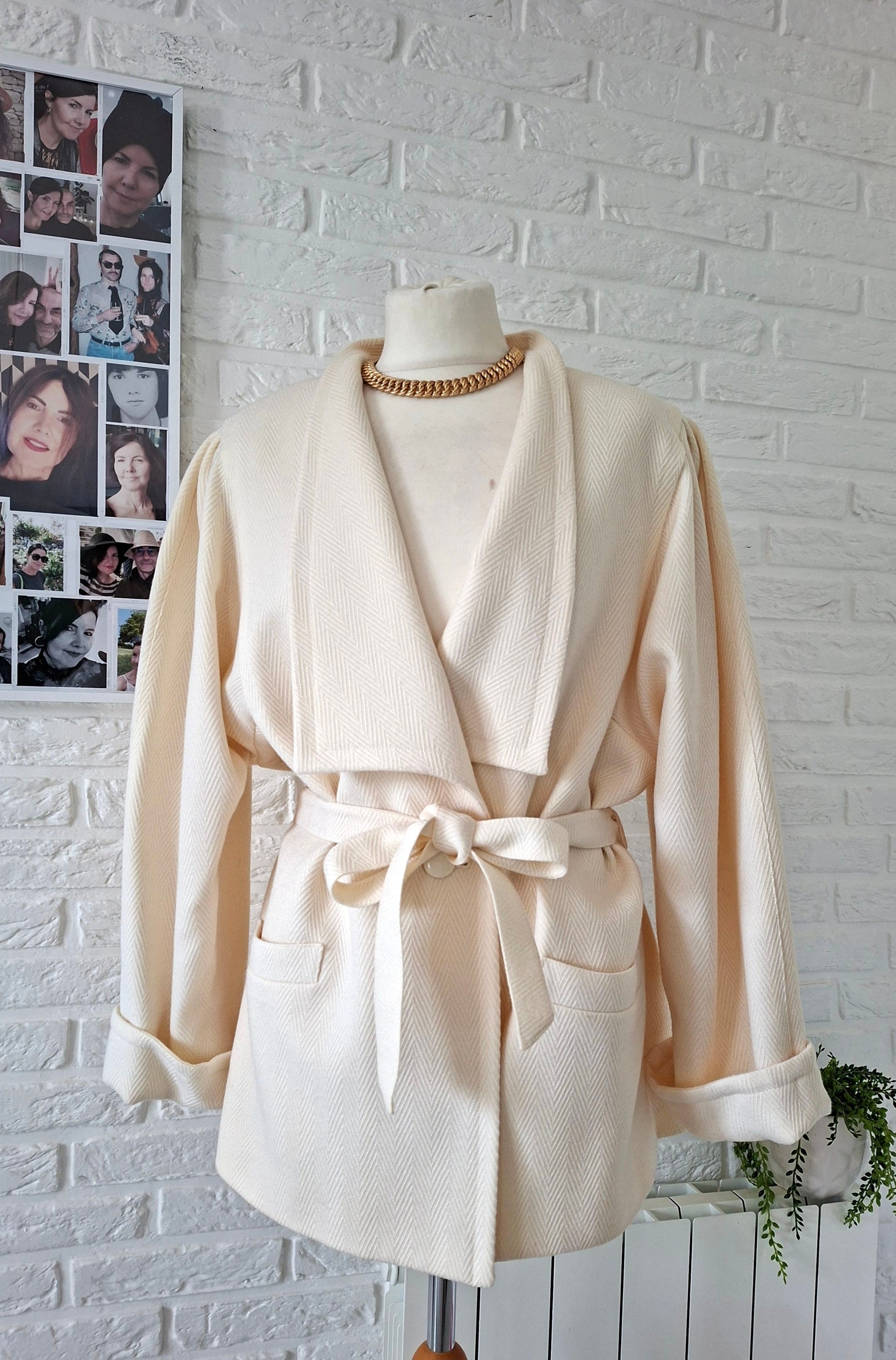 Prix unitaire parVeste en pure laine écrue motif chevrons Vintage 80's.Manches ballons à revers. Col châle structuré. 2 poches. Doublée. Fermeture boutonnée et ceinture assortie à nouer. Les mesures à plat Épaules 40cm Aisselles 57cm Longueur 73cm. Portée par Patricia qui fait une taille 40(PAT21)