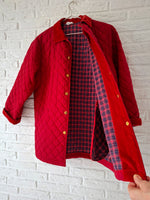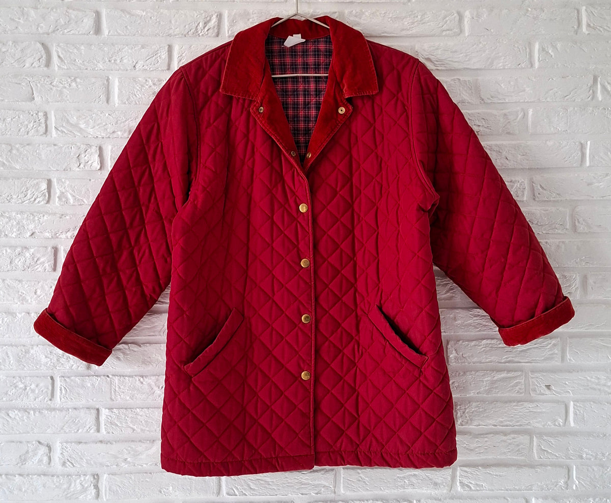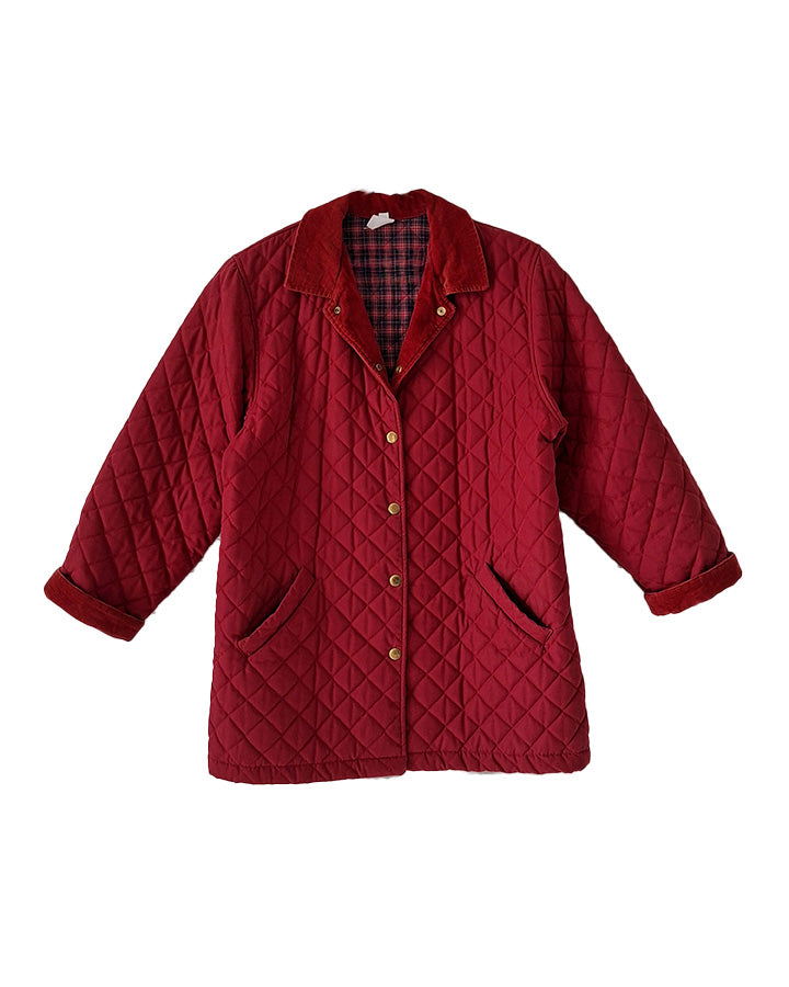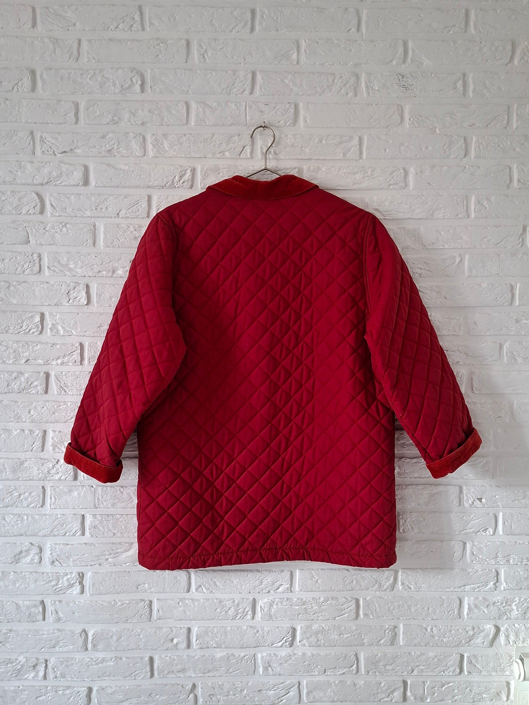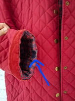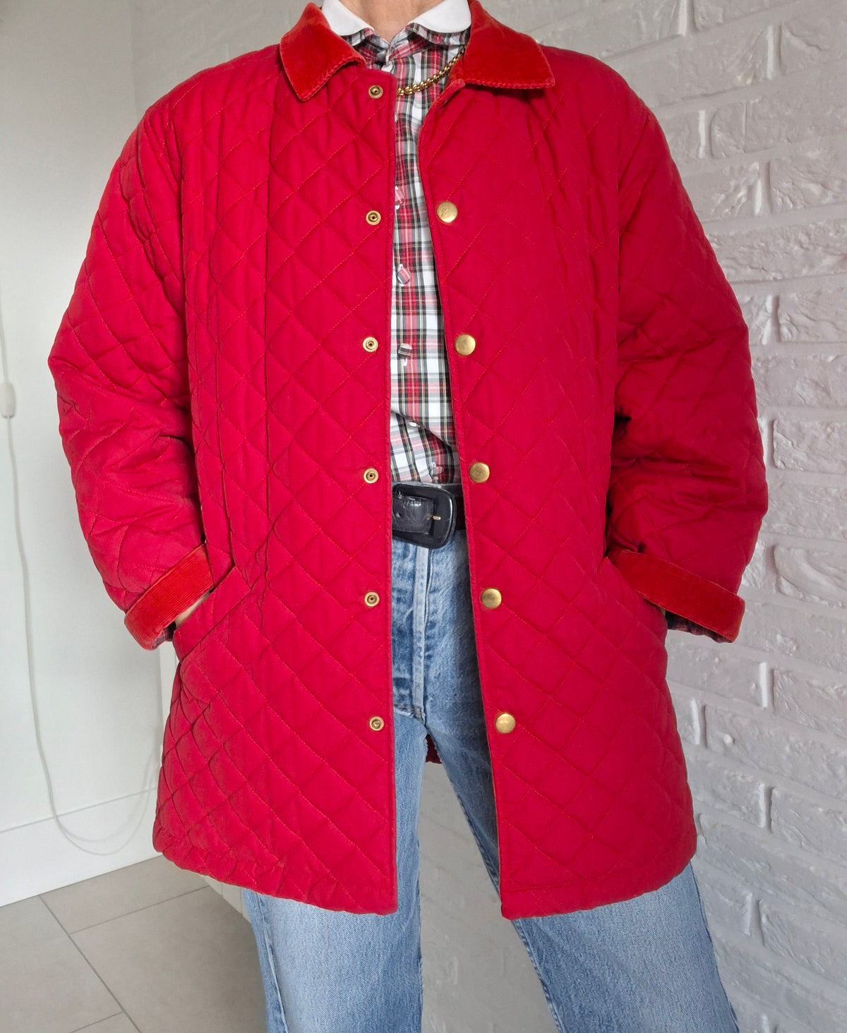 Prix unitaire parVeste matelassée à doublure tartan. Col et poignets en velours côtelé. 2 poches. Fermeture par pressions dorés. Les mesures à plat Épaules 44cm Aisselles 58cm Longueur 75cm Portée par Patricia qui fait une taille 40. Réparation sur la doublure des poignets invisible porté (PAT3)