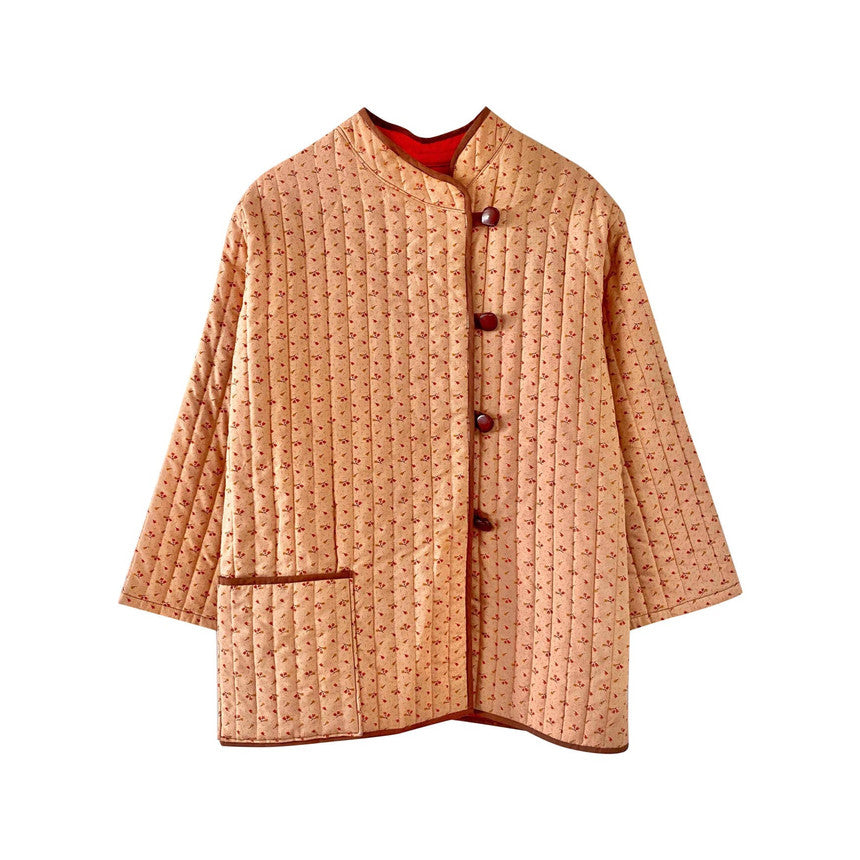 Prix unitaire parVeste matelassée à fleurs, en 100% coton rose orangé pêche, imprimée petites fleurs liberty roses et jaunes, doublure orange, gansé d’un liseré marron, boutons cuir, col mao et boutonnage asymétrique sur un côté, manches kimono, fait mains années 70’s, taille 36 et 38 portée ici sur un mannequin T36 et serrée sur une personne T40.