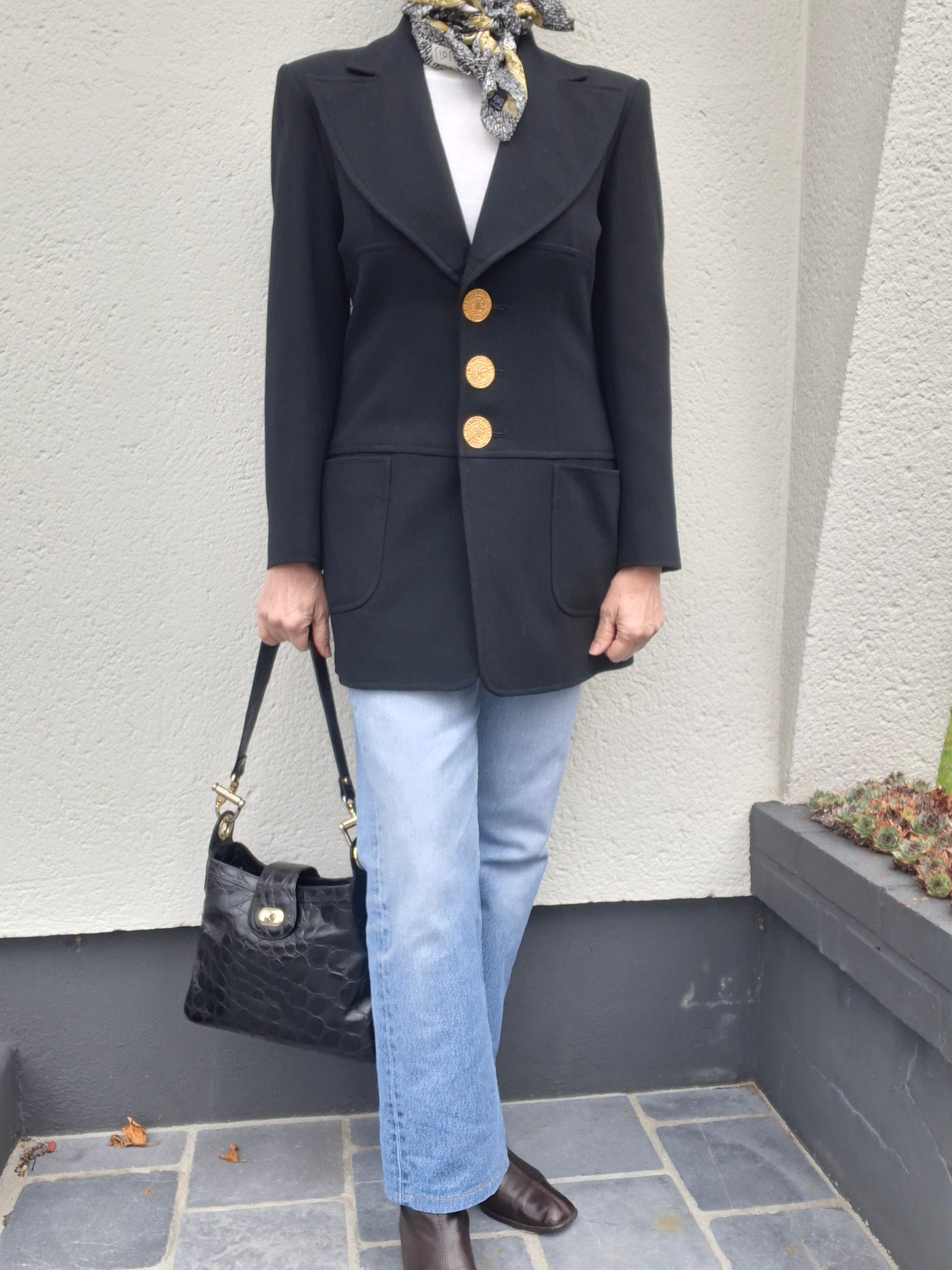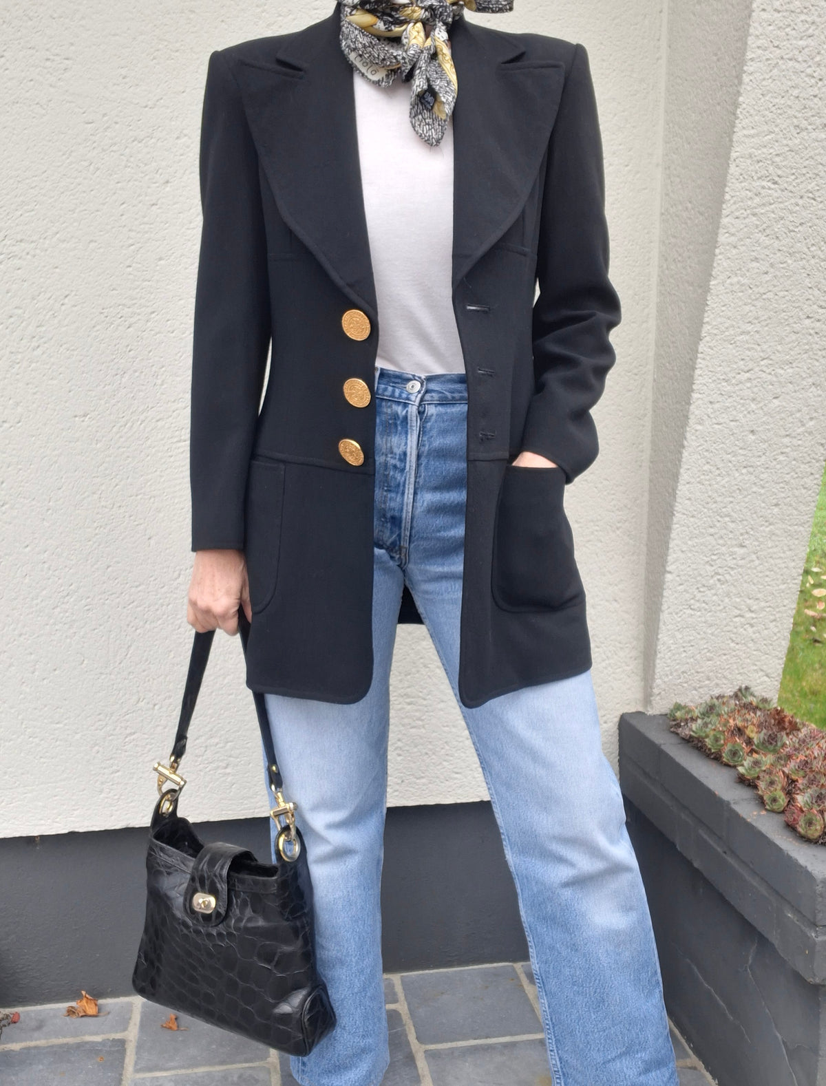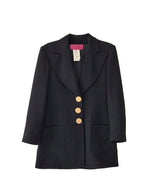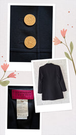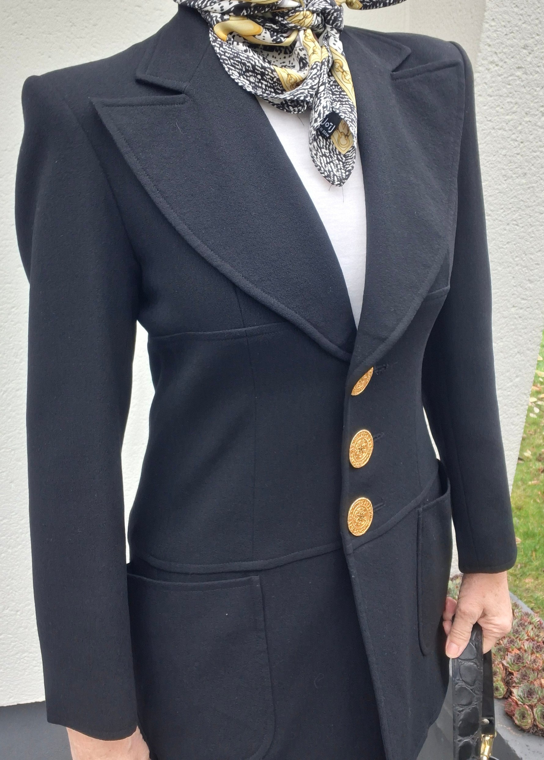 Veste Christian Lacroix en pure laine noire. Col châle. Taille cintrée. 2 poches plaquées Doublée. Boutons médaillons en métal doré embossé. Épaules 43cm.Poitrine 47cm.Longueur 75 cm.Taille 38/40