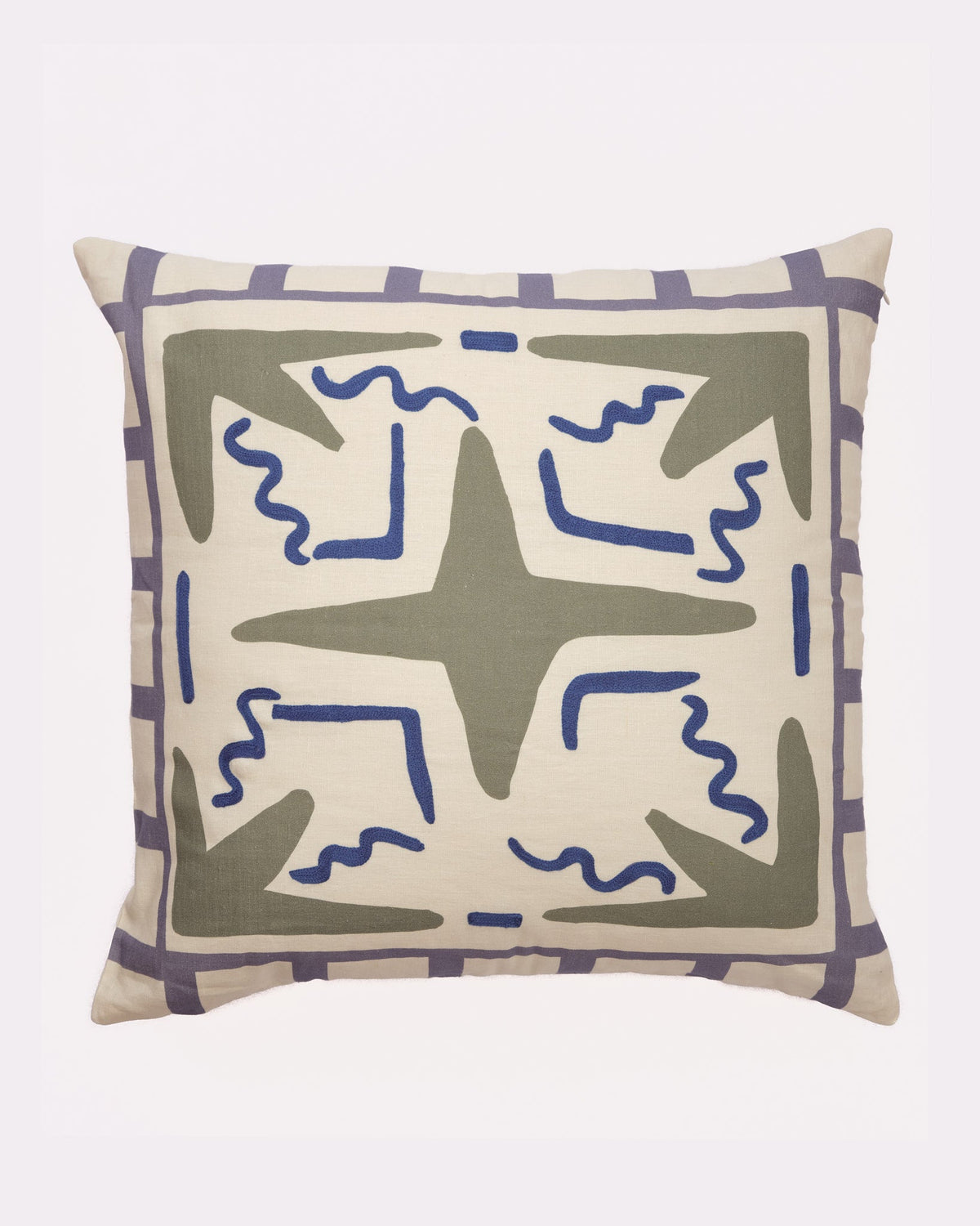 Crafted from premium European linen, this cushion cover is digitally printed with eco-friendly dyes, featuring crewel work embroidery details. Each piece is 60 x 60 cm.
