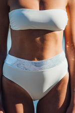 La mannequin porte le bandeau Louise écru taille M et la culotte Louise écrue taille M.