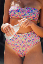 La mannequin porte le bandeau Louise rose fleurs taille M et la culotte Louise rose fleurs taille S.