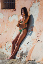 La mannequin porte la culotte Léna verte taille S et le bandeau Léna vert taille M.