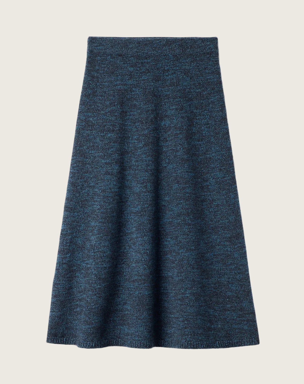 Jupe longue évasée en cachemire. Teinte moulinée obtenue en tricotant plusieurs fils de couleur différente.