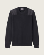 Ce ras de cou en cachemire présente un jeu de côtes discret sur toute la surface qui lui apporte une discrète originalité. Inspiré du vestiaire militaire, il se distingue également par des patchs épaules en daim ton-sur-ton.