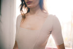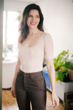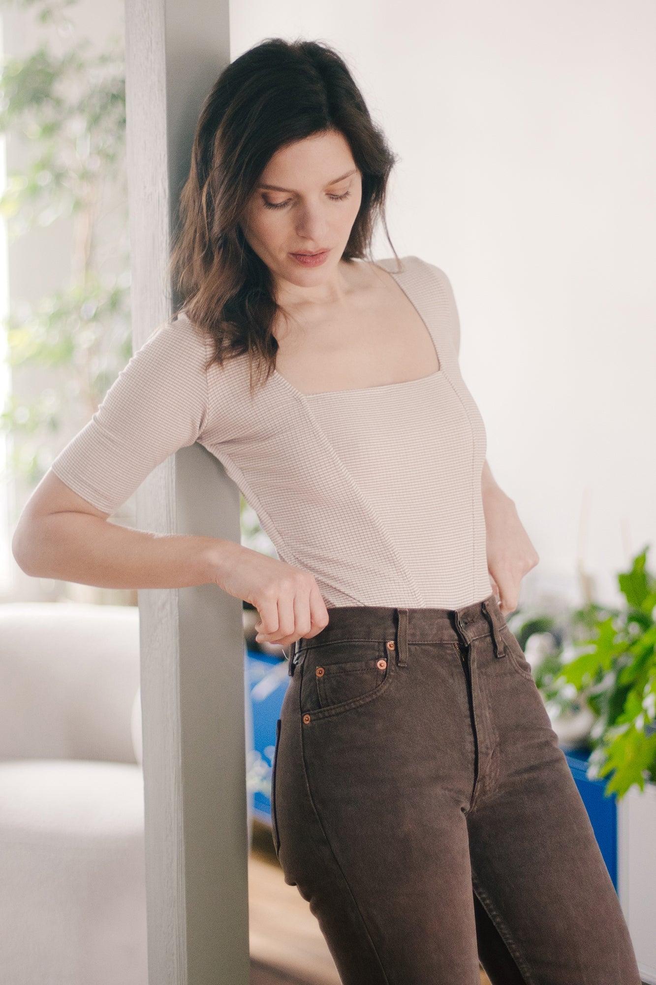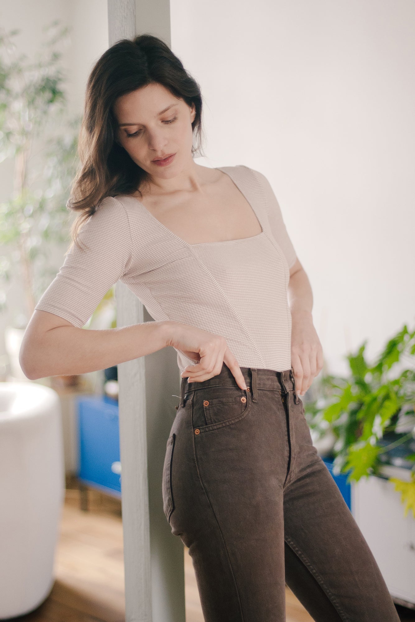 Ava, c'est la petite sœur de notre body Alma. Une encolure carrée ultra féminine, un jeu de découpes pour prolonger le décolleté, une viscose rayée seconde peau et des manches au-dessus du coude, élégantes et parfaites pour les beaux jours. Et comme sur tous nos bodys, la partie culotte est en microfibre et sans couture : invisibilité garantie sous tous vos bas !