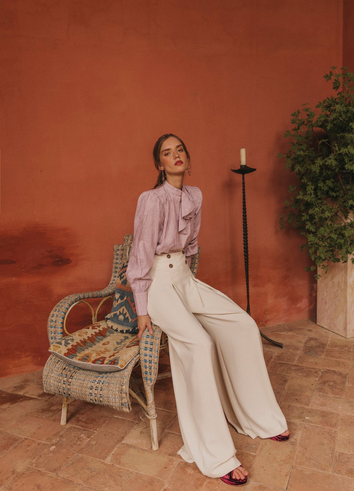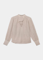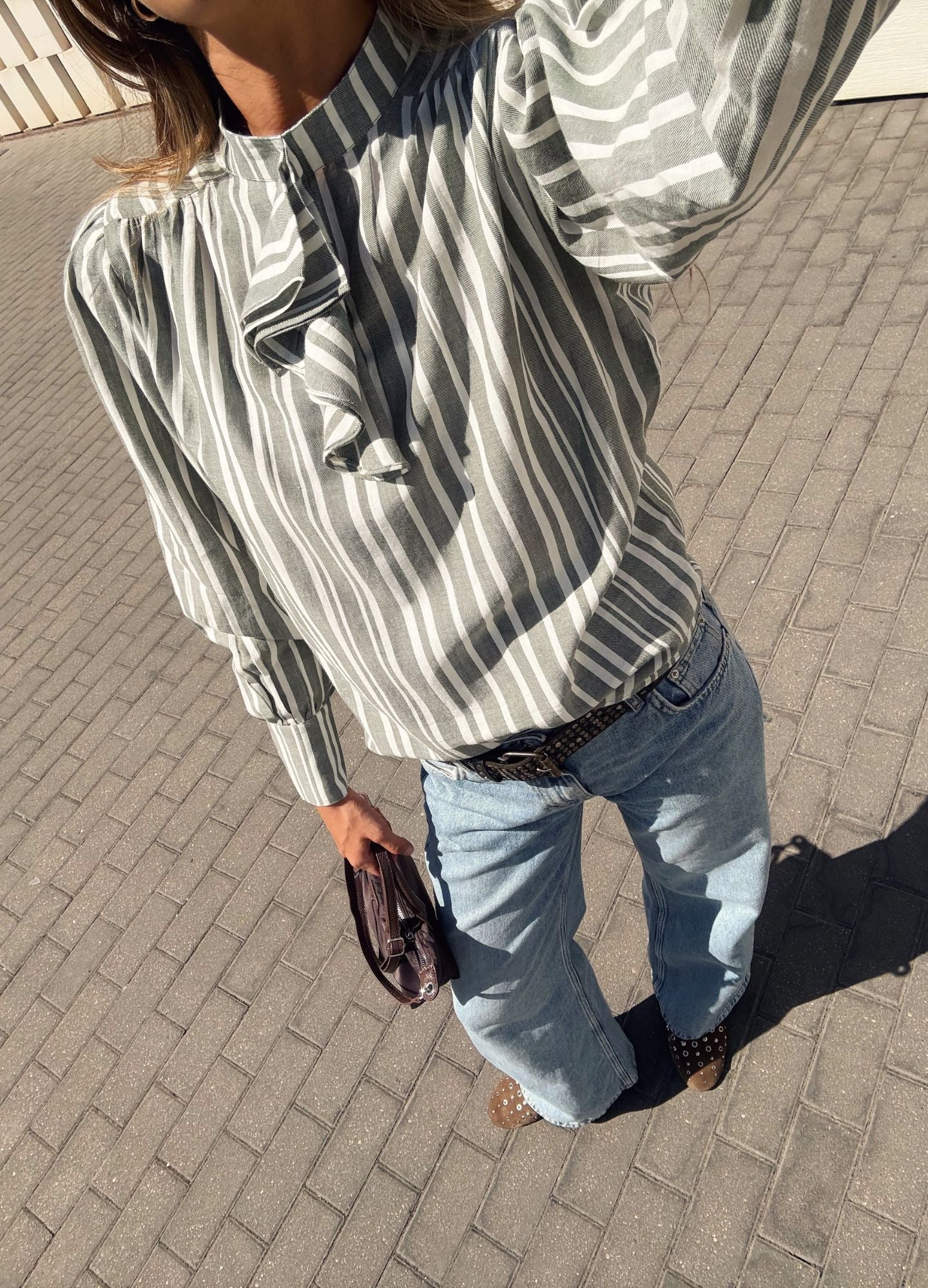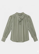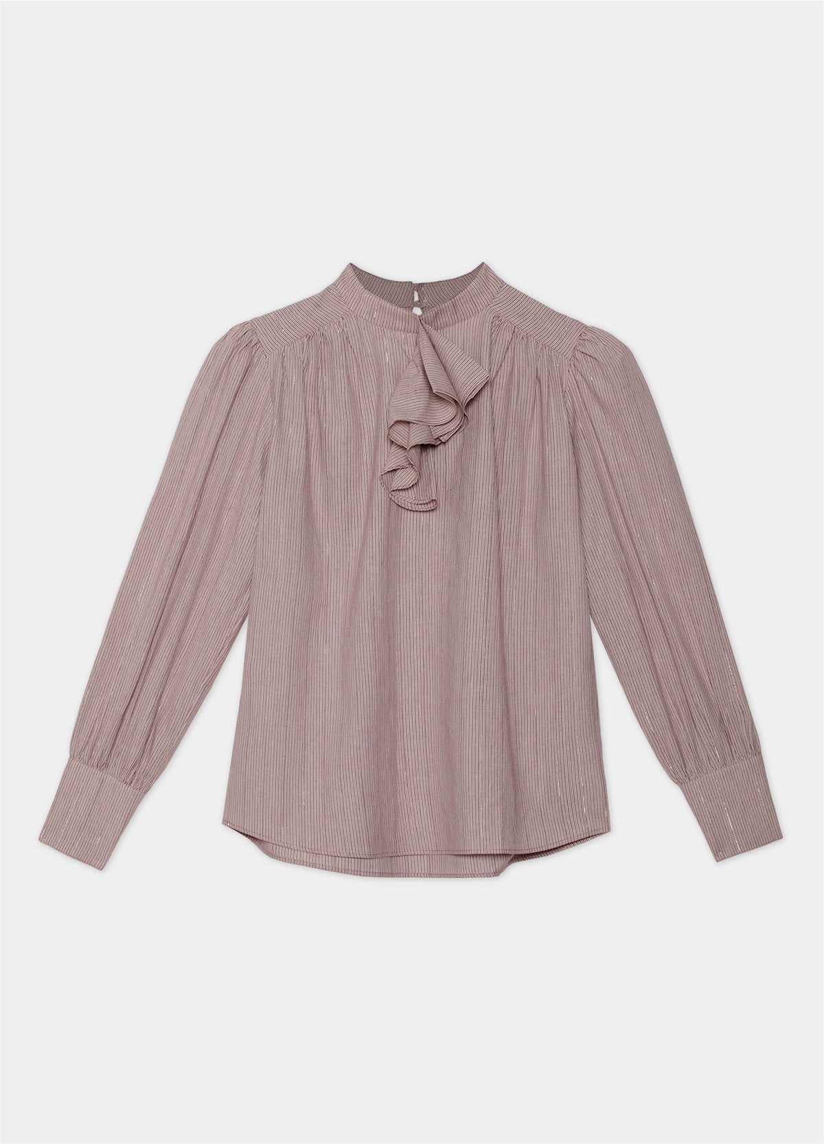 Blusa estampada de rayas, de corte recto con cuello alzado y volante central delantero. Manga larga con puños abotonados en nácar. Cierre trasero con abertura en lágrima y botón.