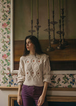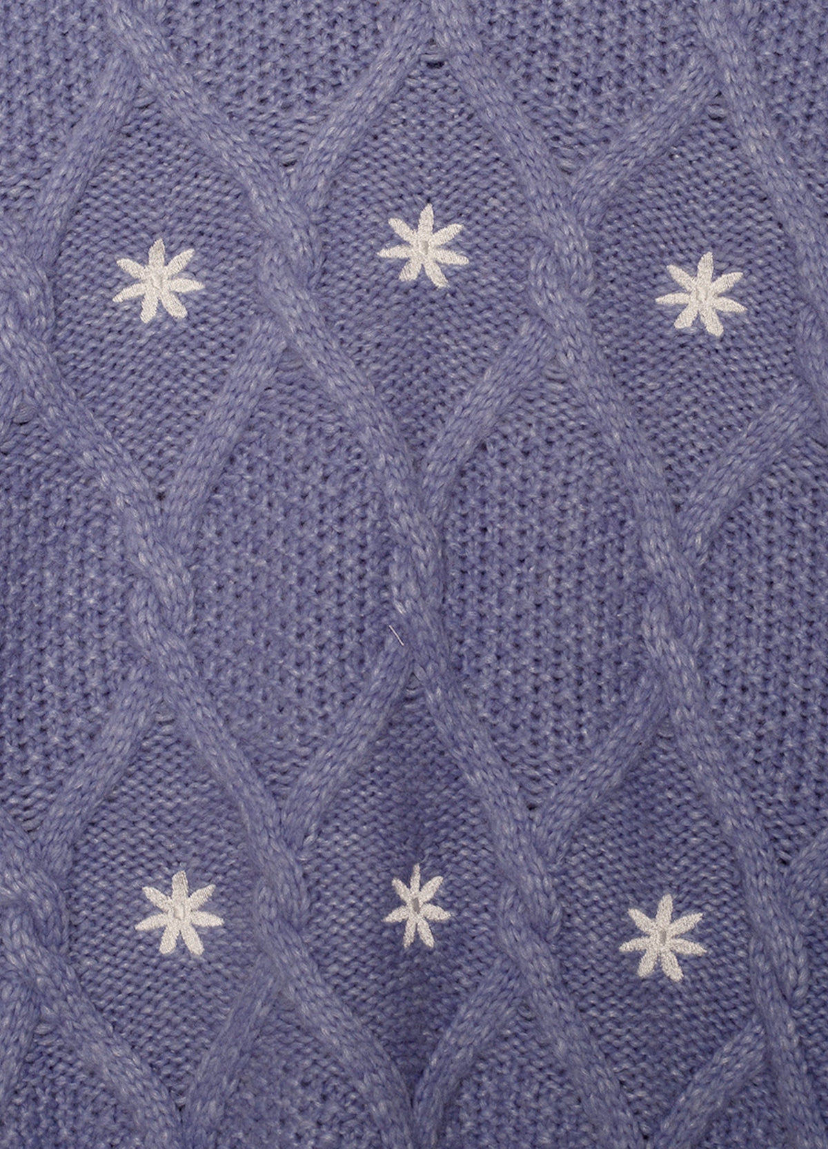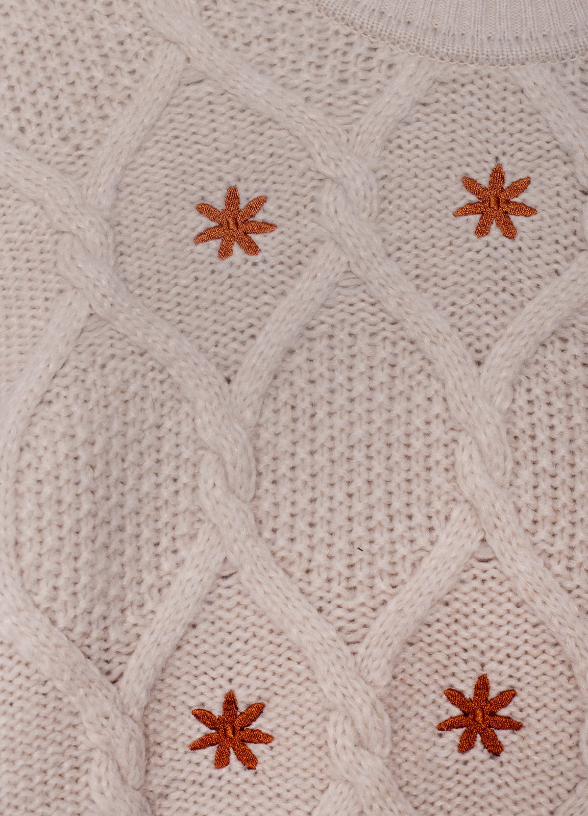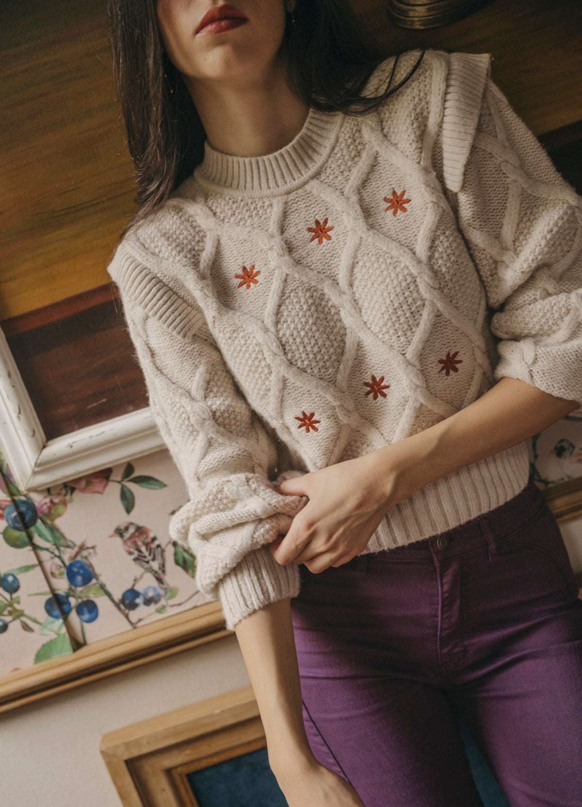 Jersey cuello caja con punto de fantasía en forma de rombos enlazados, con hilatura italiana suave. En en centro de algunos de ellos tienen un bordado de una flor en contraste. Mangas con adorno de canalé en el hombro, terminando en un puño con canalé, al igual que el cuello.