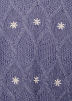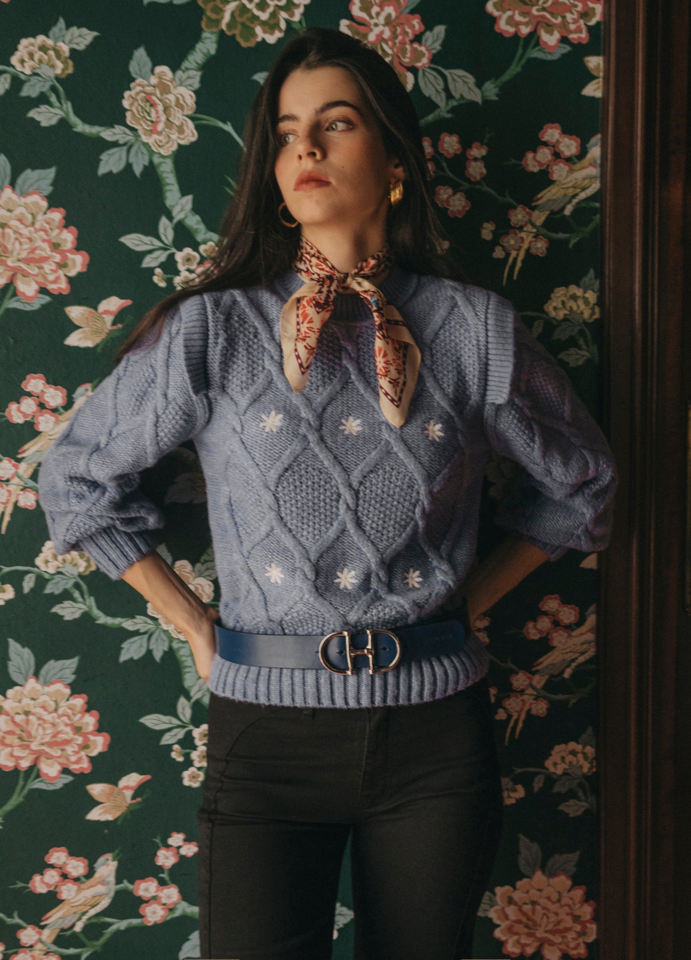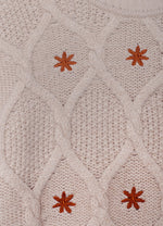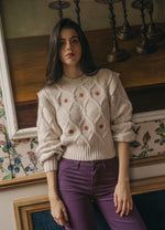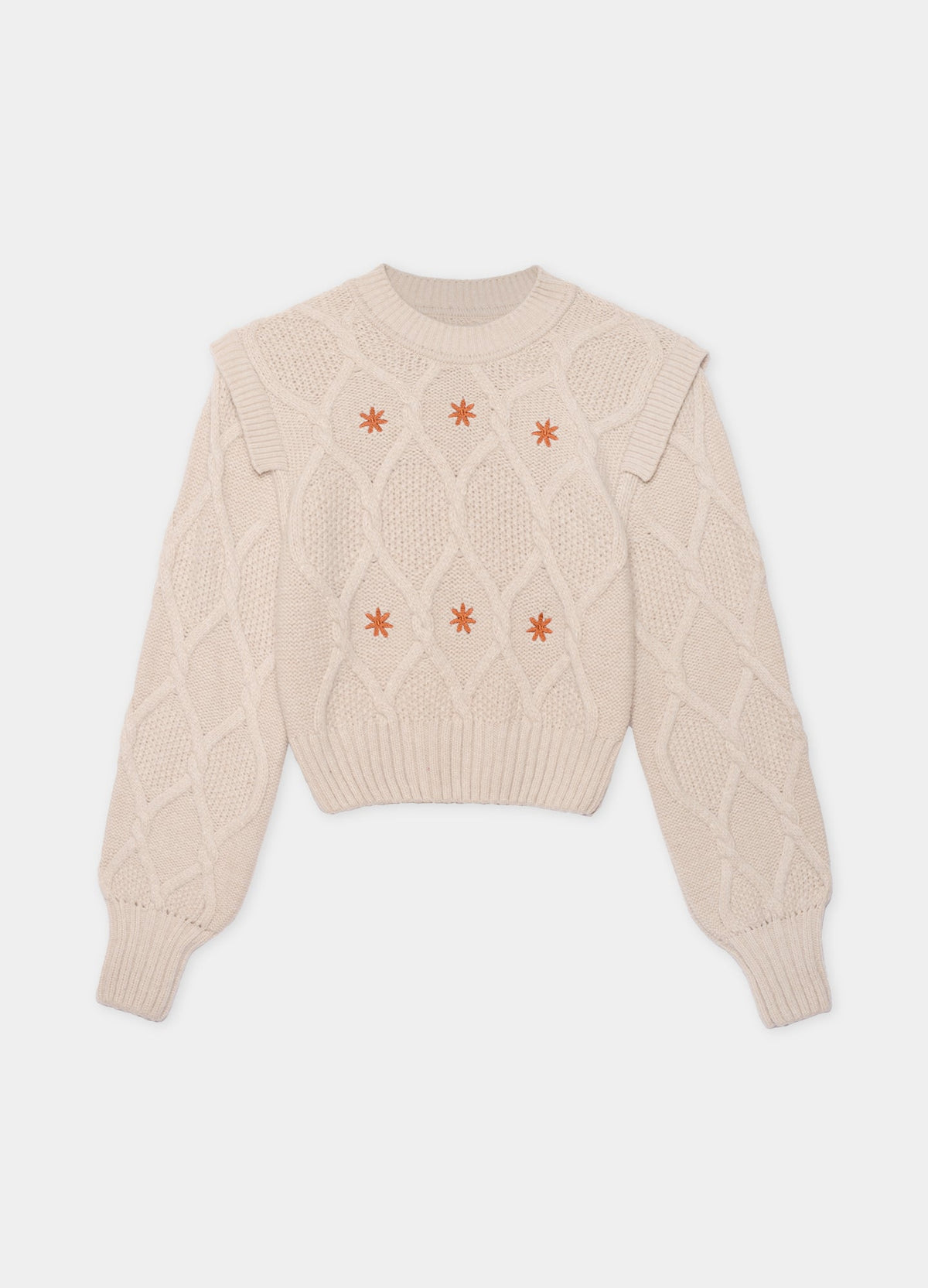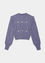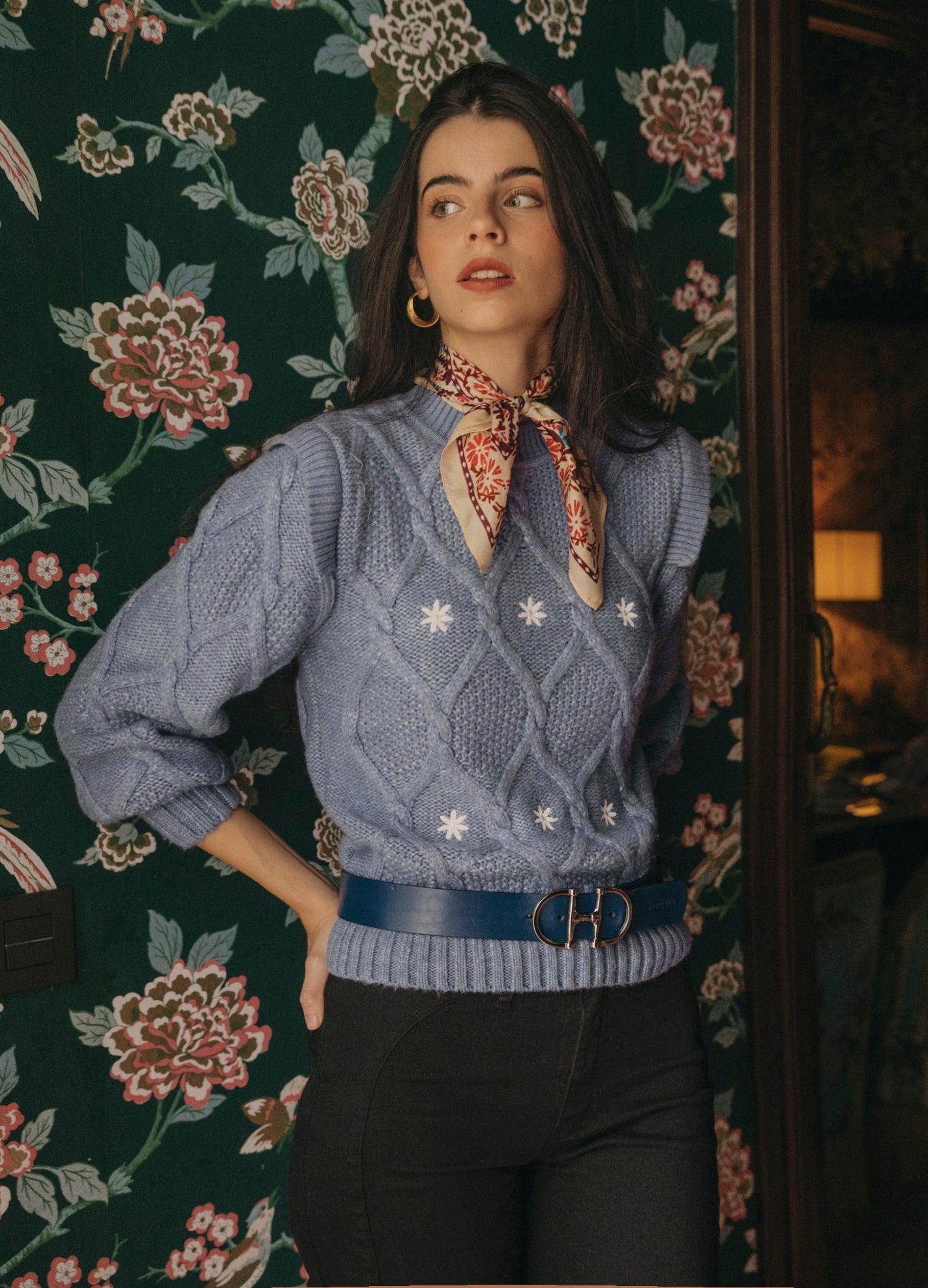 Jersey cuello caja con punto de fantasía en forma de rombos enlazados, con hilatura italiana suave. En en centro de algunos de ellos tienen un bordado de una flor en contraste. Mangas con adorno de canalé en el hombro, terminando en un puño con canalé, al igual que el cuello.