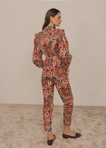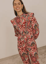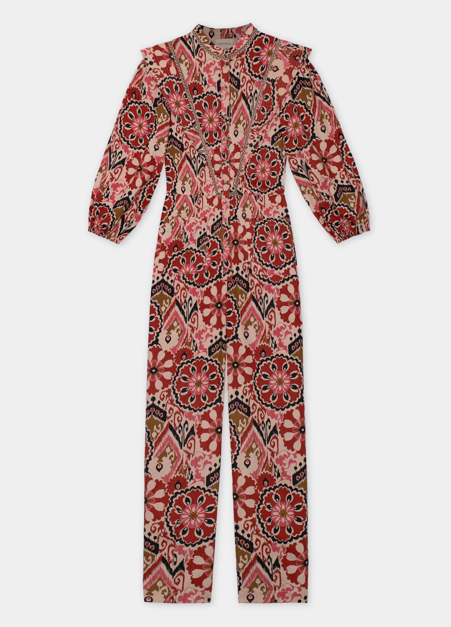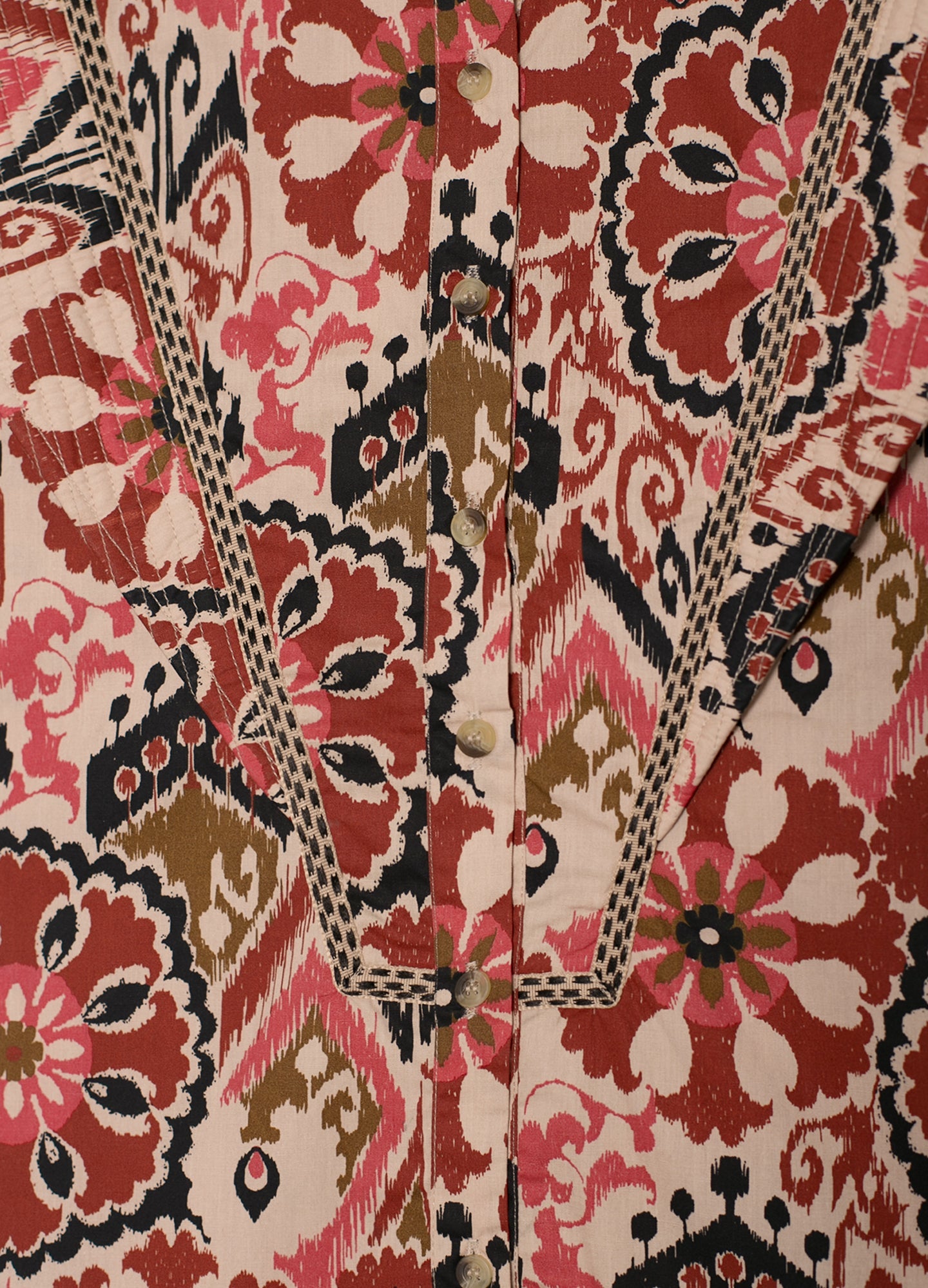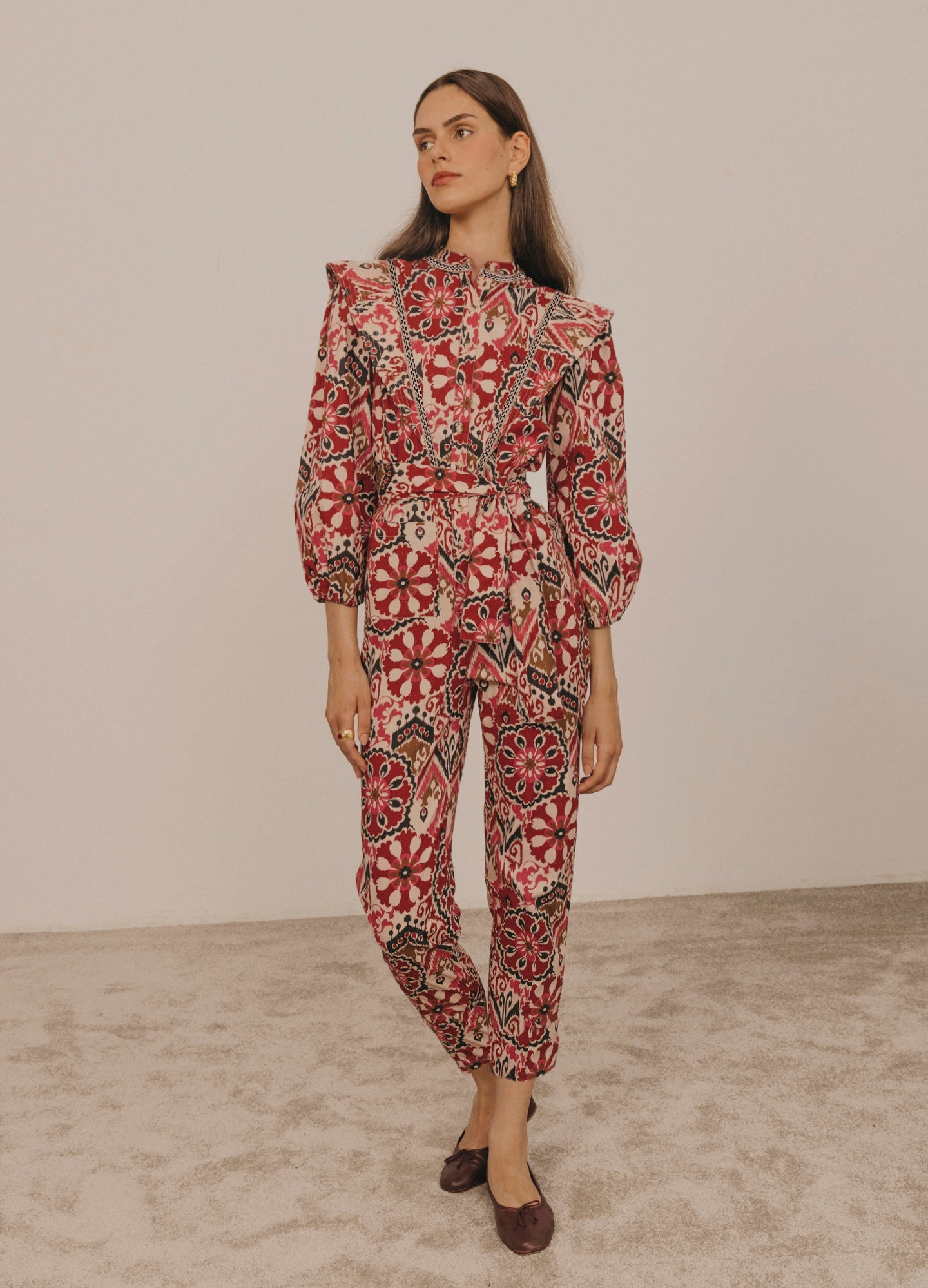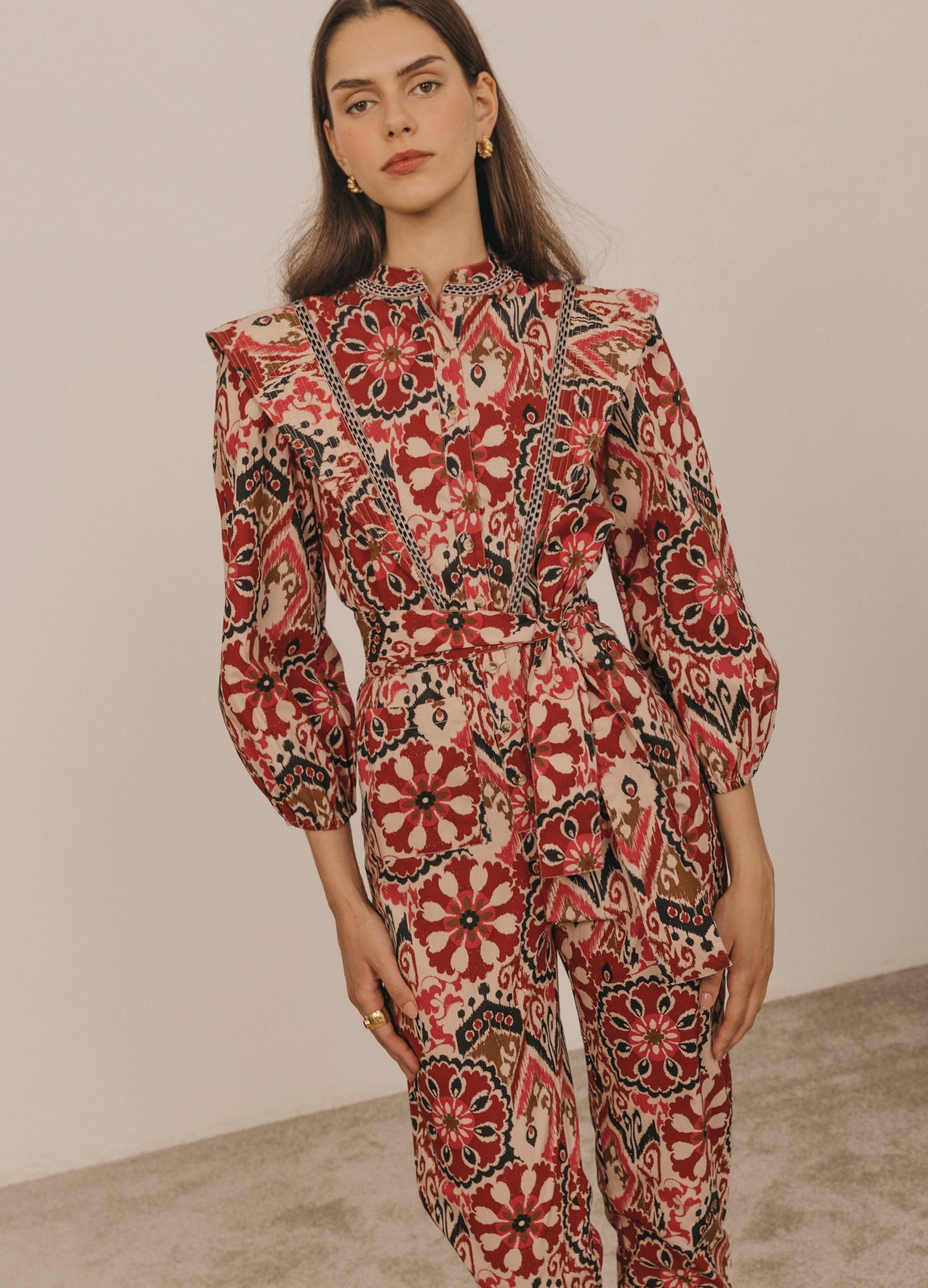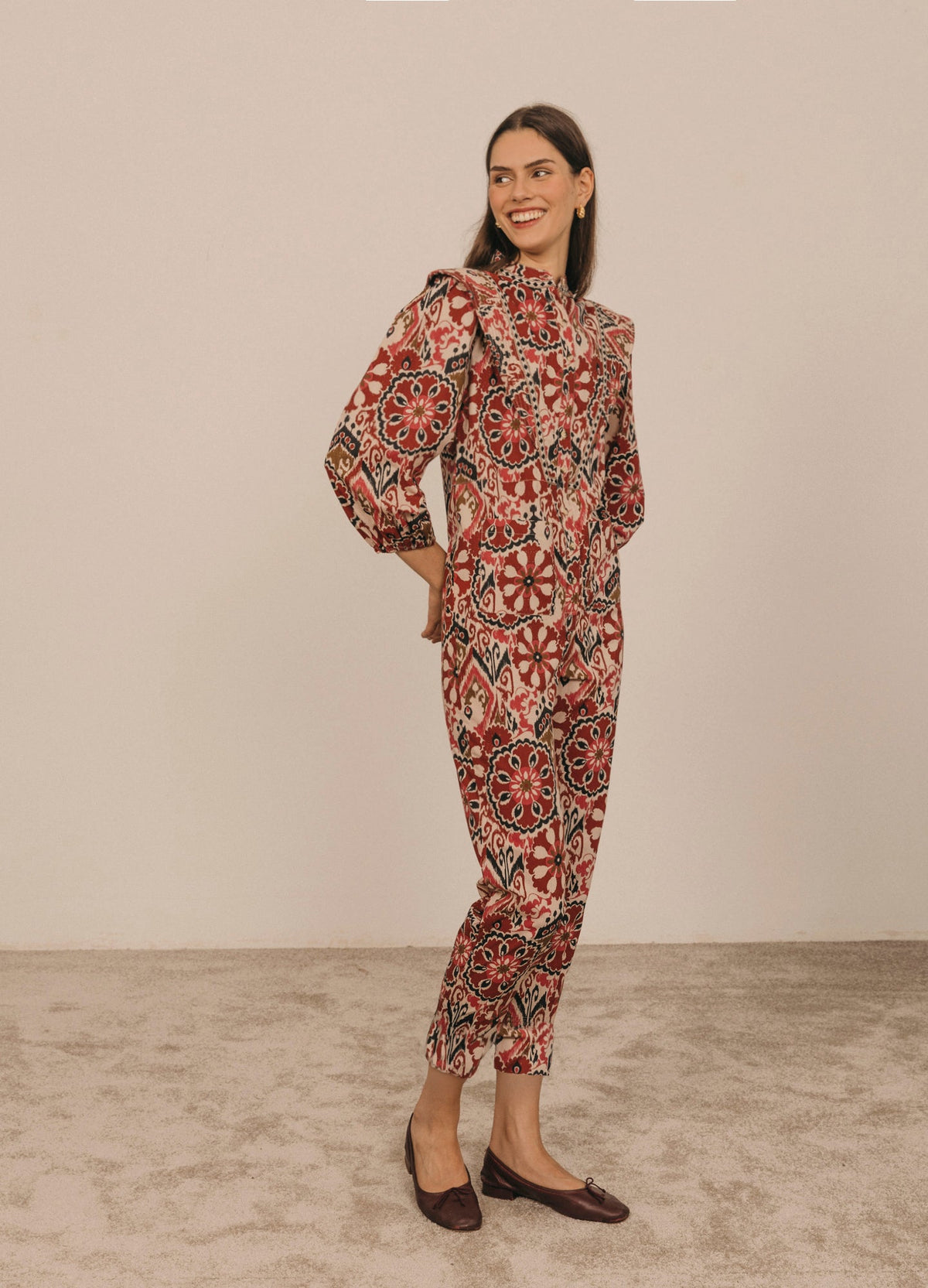 Mono largo estampado de corte recto con cierre frontal de botones. Cuello mao y mangas farol 3/4 con puños elásticos. Detalle geométrico en los hombros, bolsillos delanteros y pasamanería artesanal en cuello y pecho. Cinturón a juego incluido.