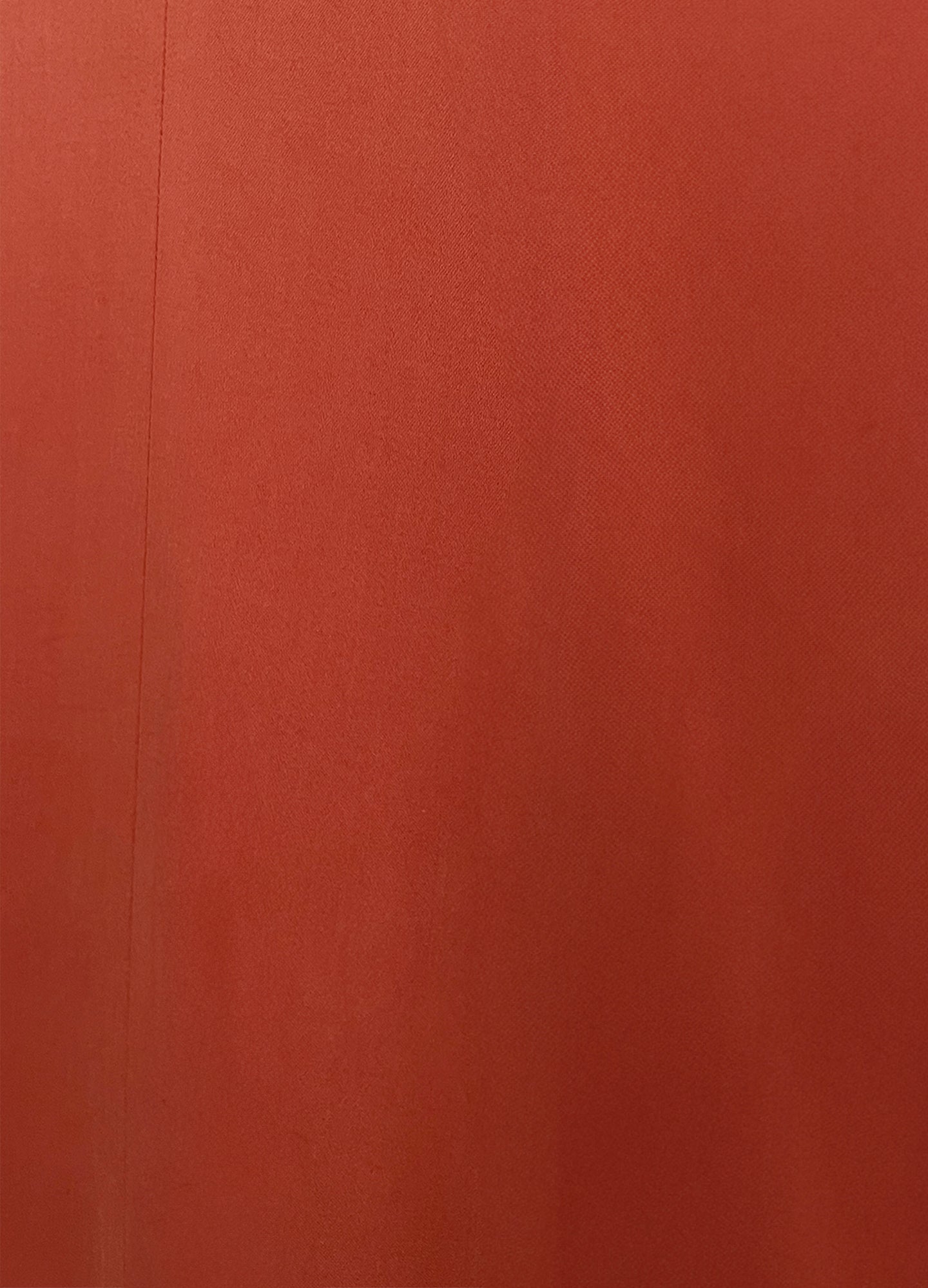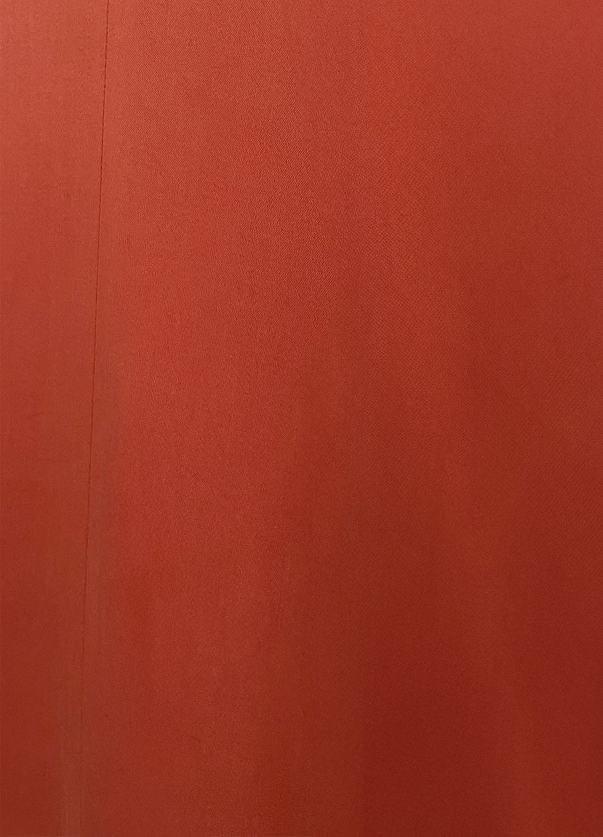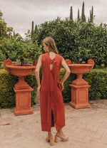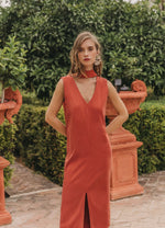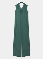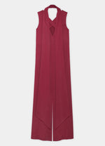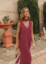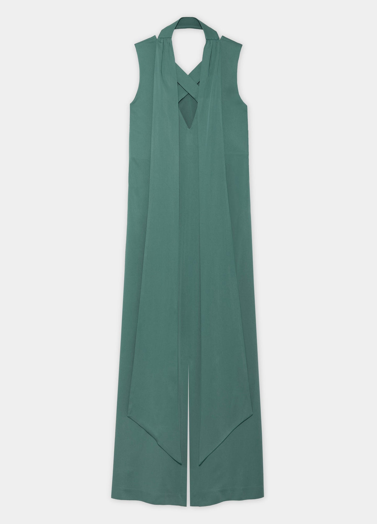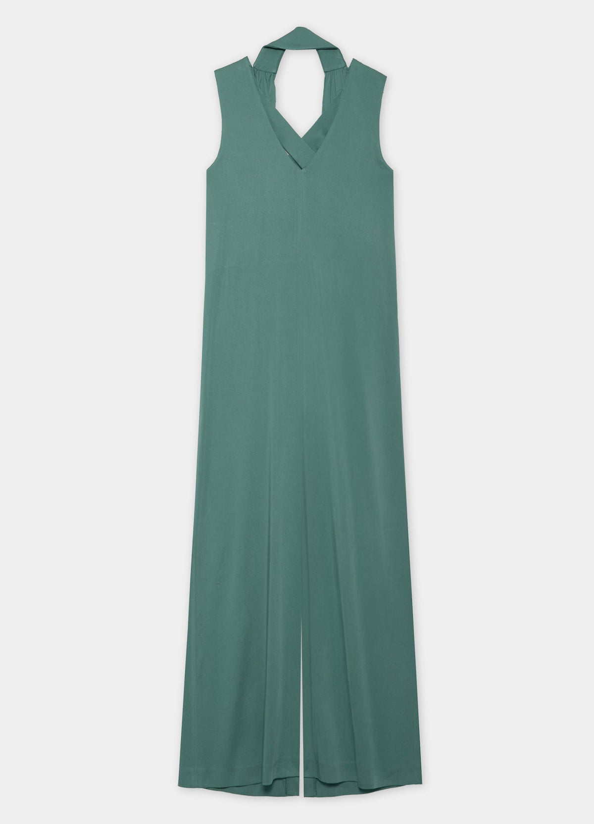 Vestido midi de corte recto, con escote en pico y espalda cruzada. Los tirantes rodean el cuello a modo de foulard, dejando una caída del mismo tejido en la espalda. Diseño sin mangas, con líneas depuradas.
