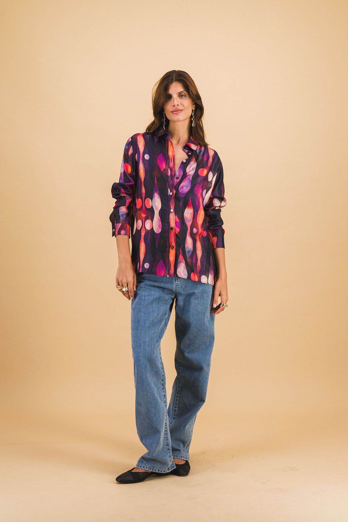 Chemise fluide et élégante à manches longues confectionnée en 100% soie. Son imprimé graphique exclusif, aux teintes vibrantes, a été dessiné à la main pour offrir une pièce forte et singulière. Coupe droite légèrement ample, col chemise classique, boutonnage devant ton sur ton.