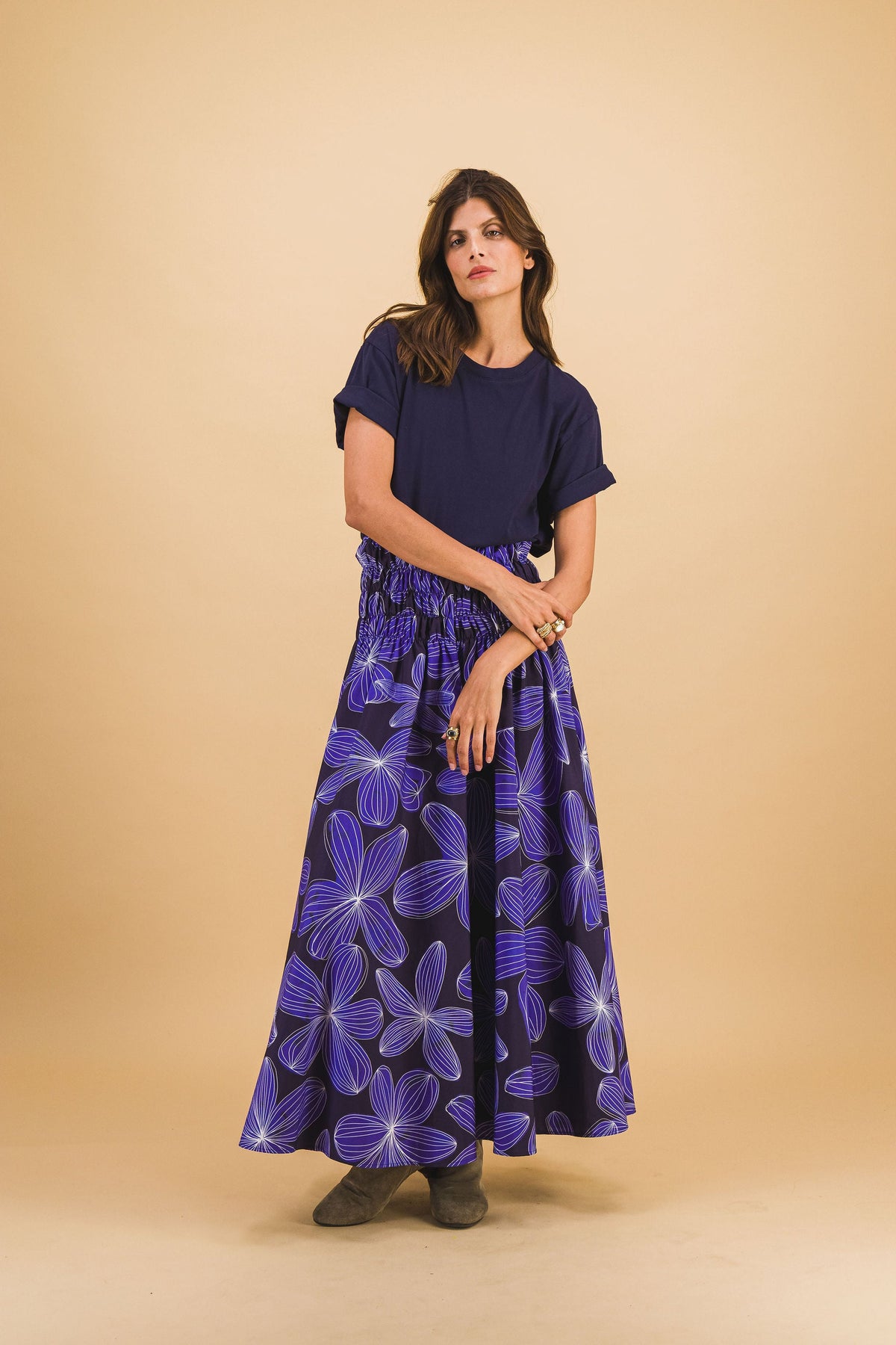 La jupe Mila est entièrement à élastiques sur le haut de celle-ci, pas de question de taille pour ce modèle, vous pouvez prendre votre taille habituelle.