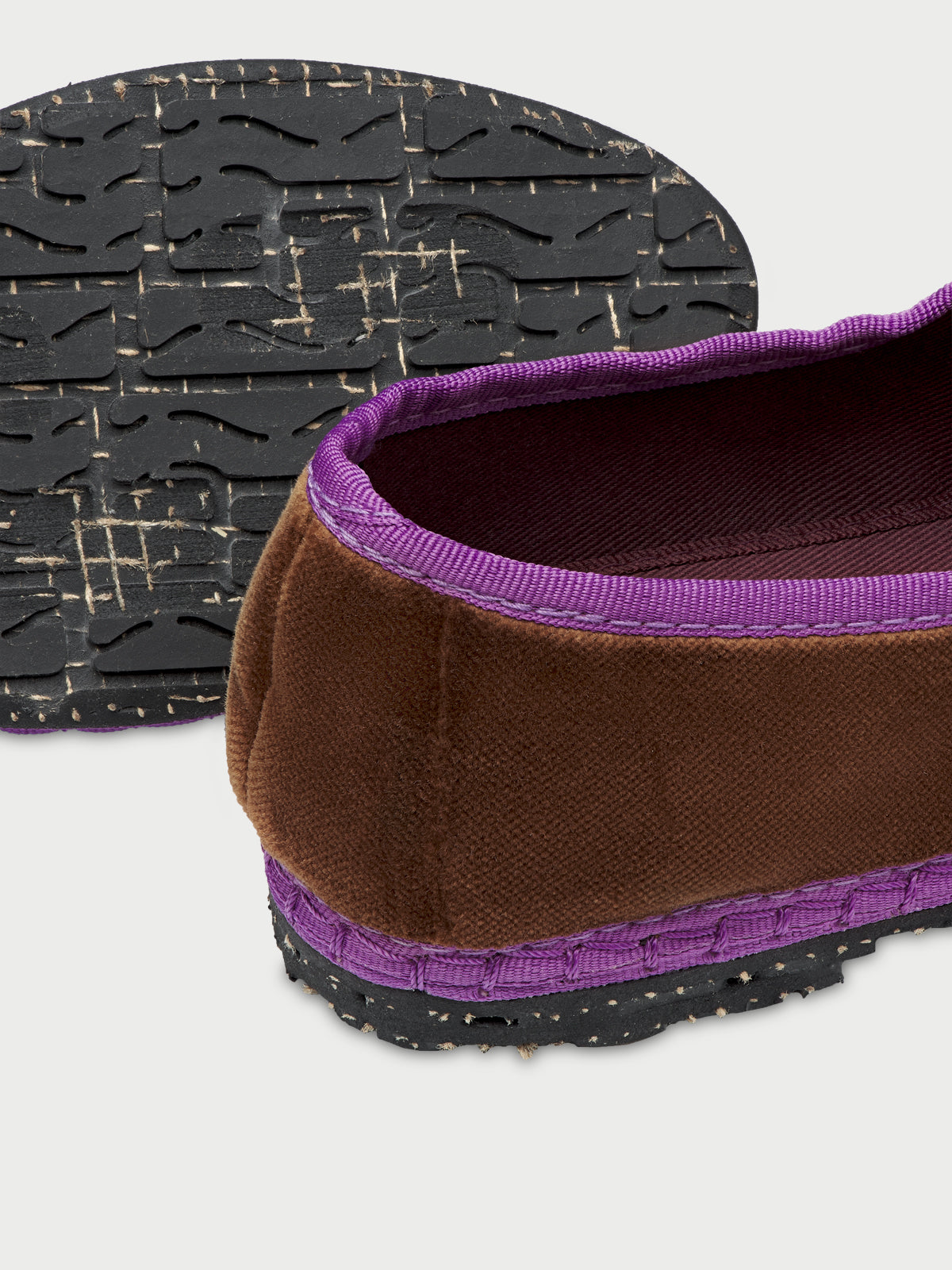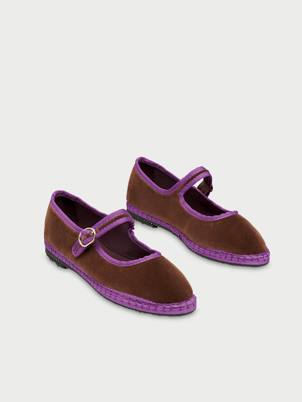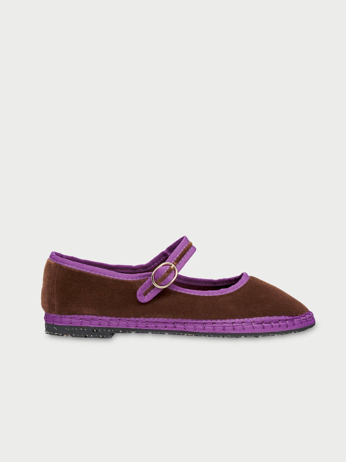 - Velvet mary jane in brown with purple piping and buckle closure.
