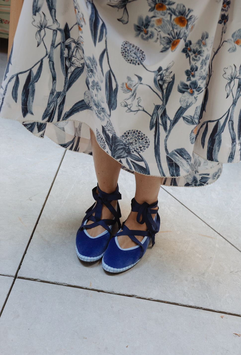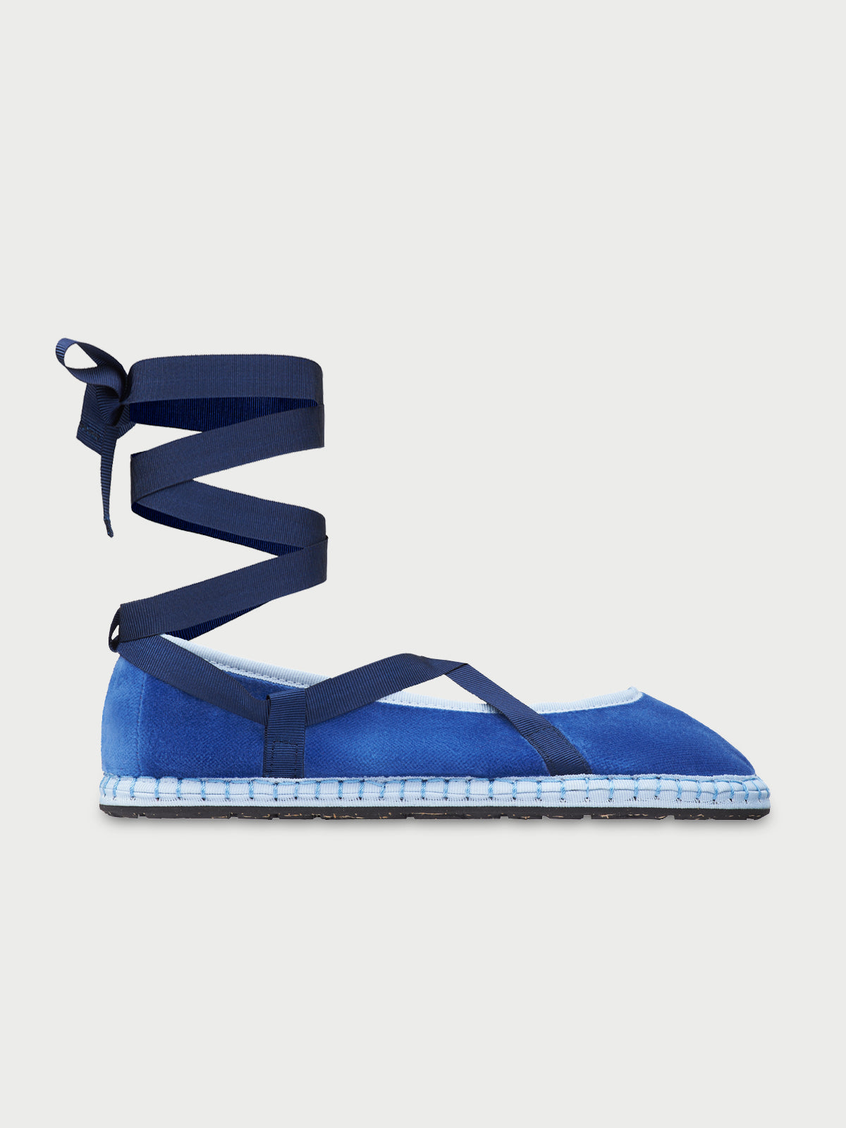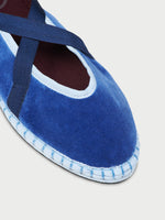 • Velvet slipper in blue with light blue piping and dark blue laces.