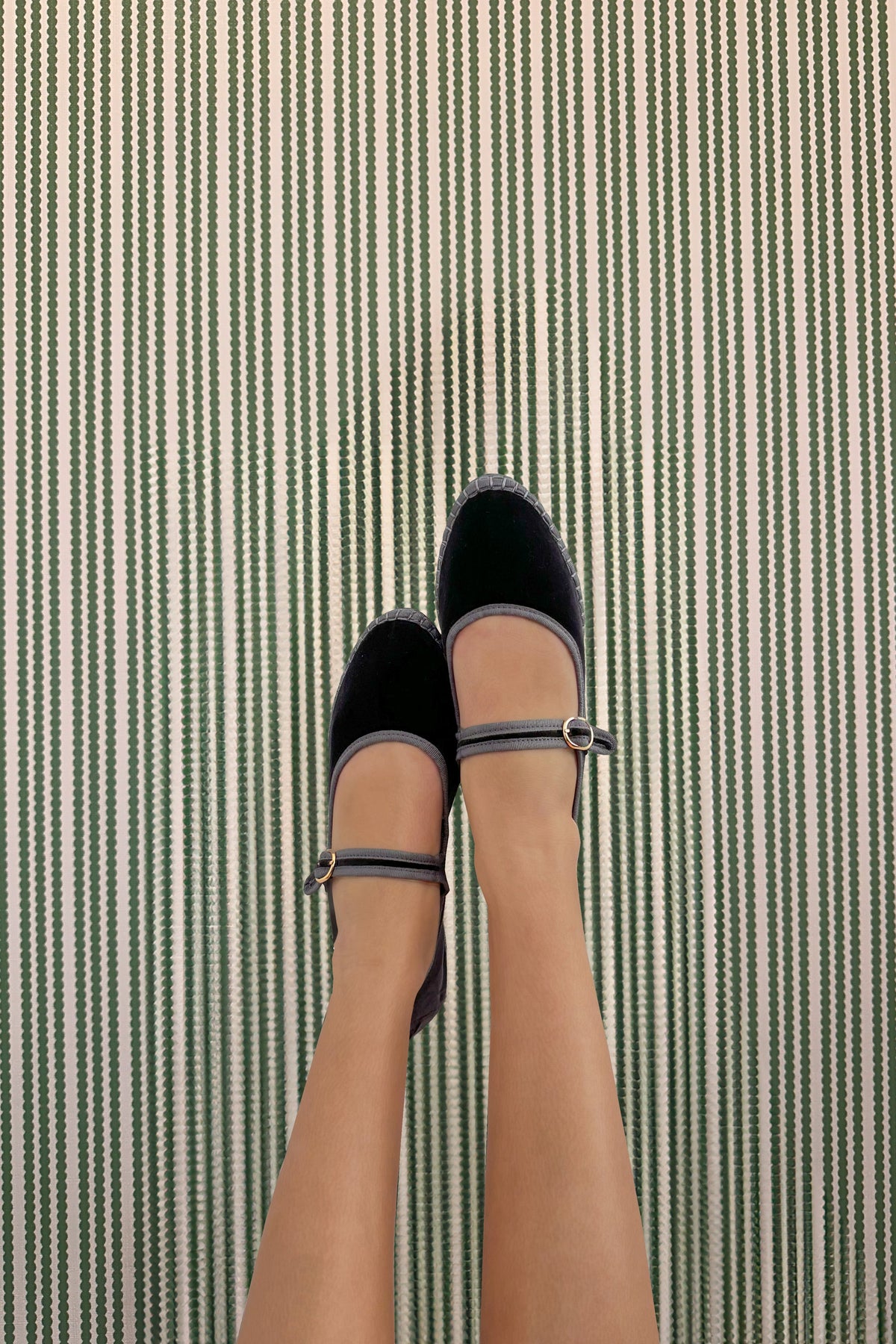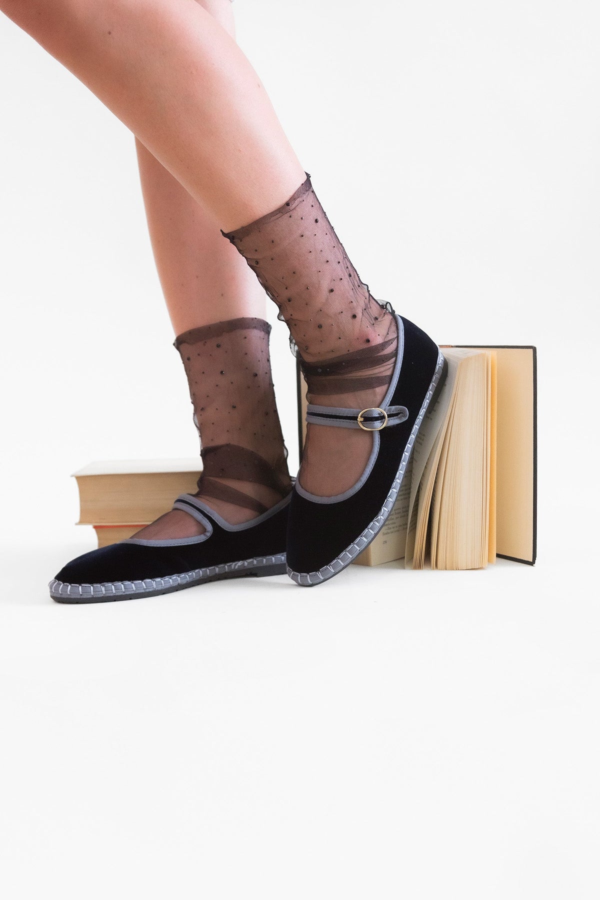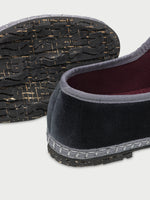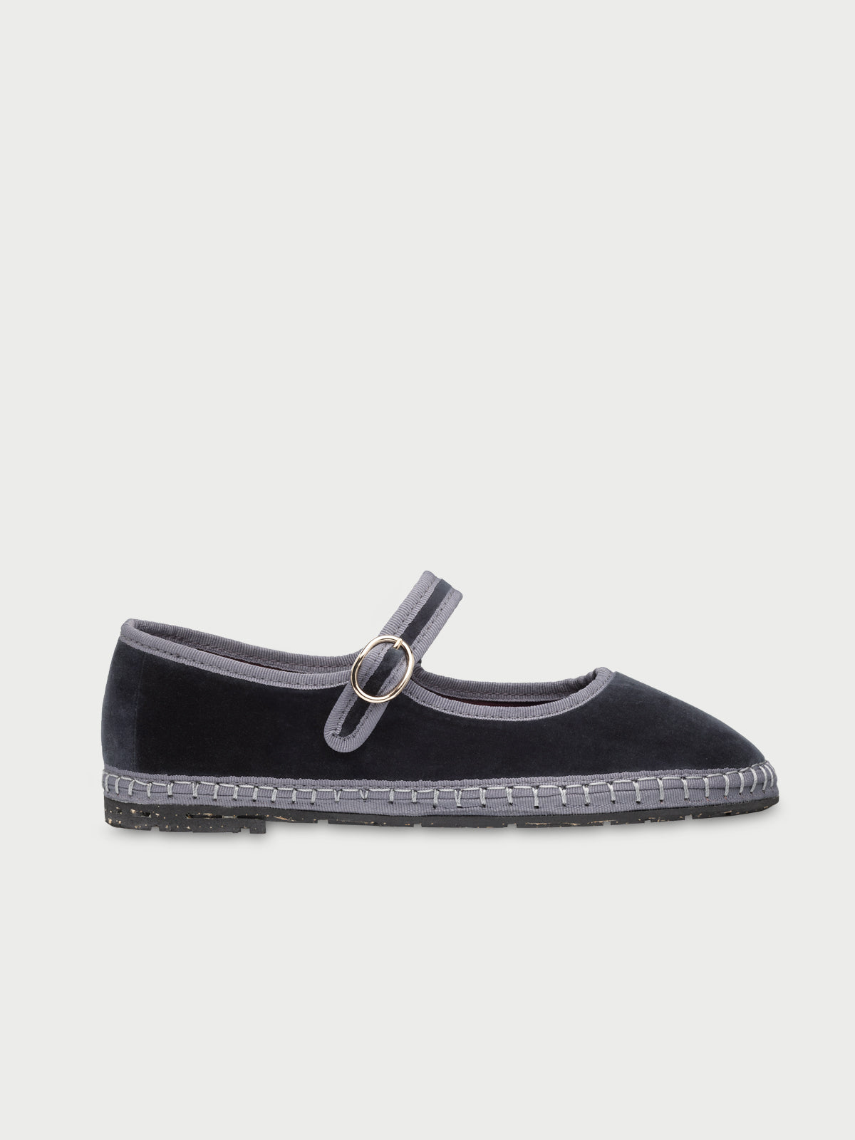 - Velvet mary jane in dark grey with grey piping and buckle closure.