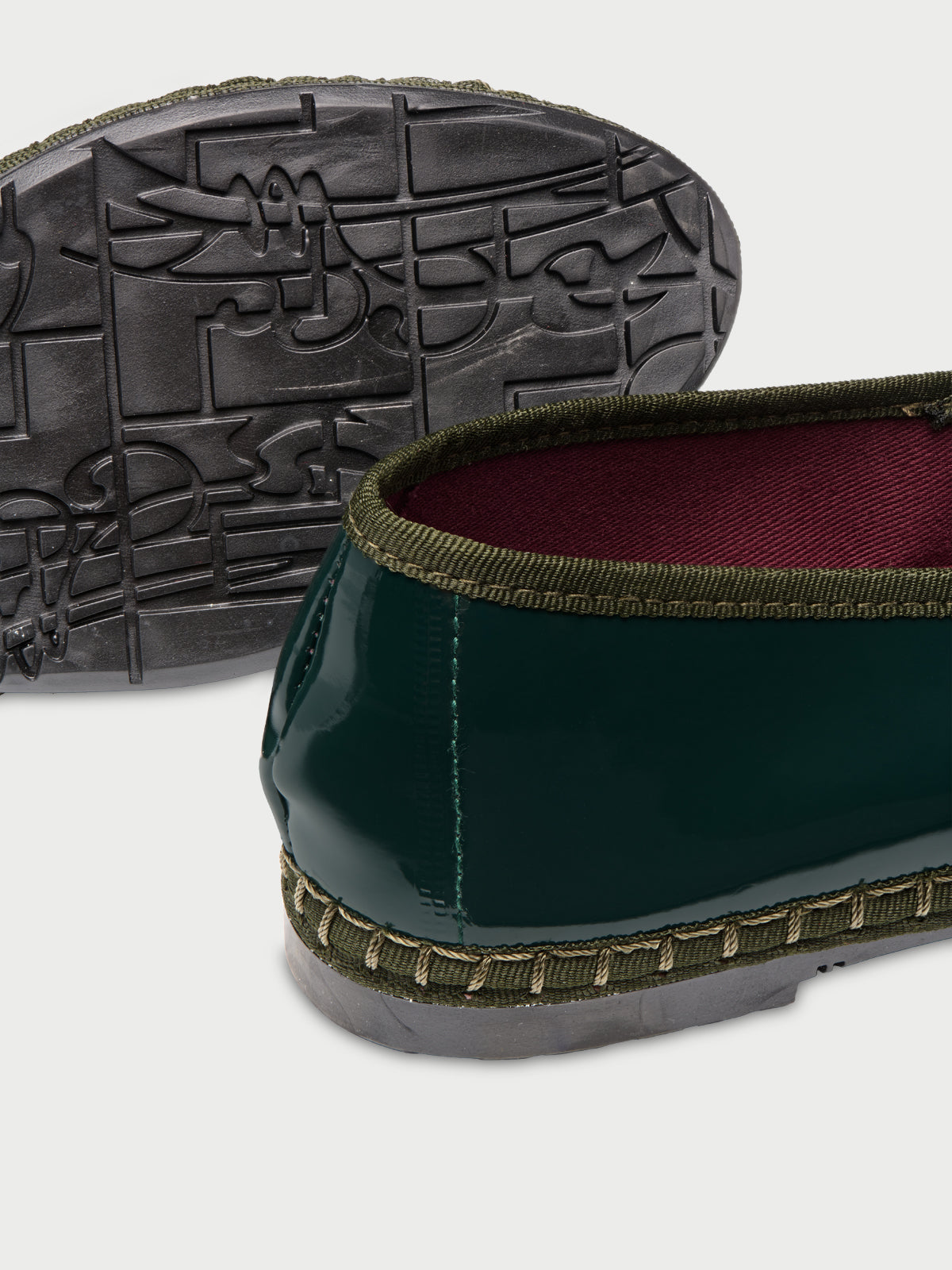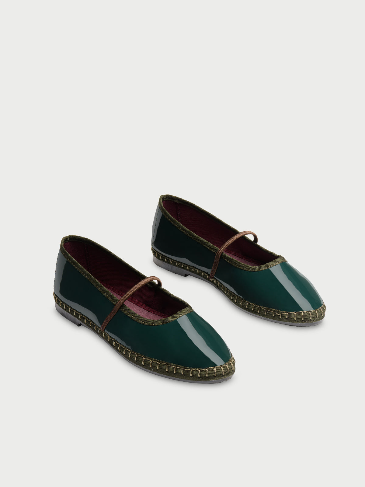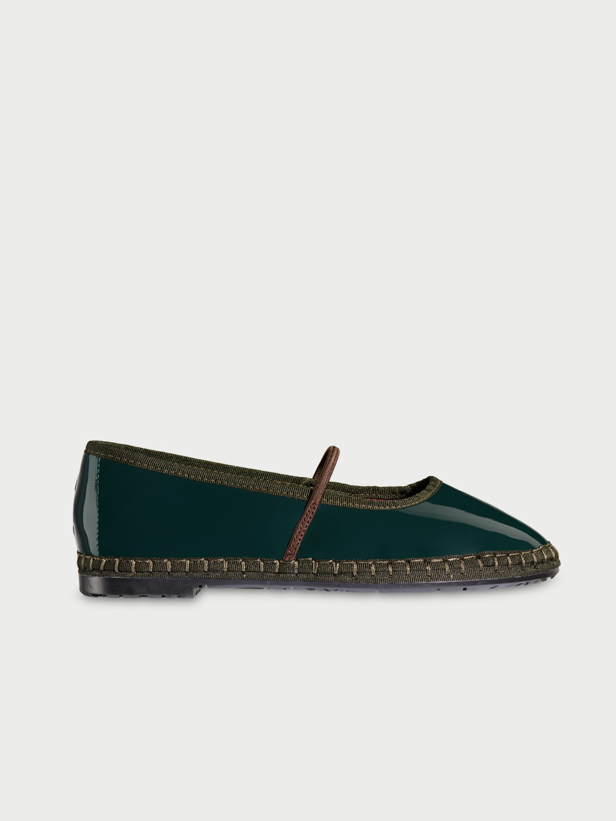 - Patent leather mary jane in dark green with dark green piping with an elastic brown band.