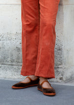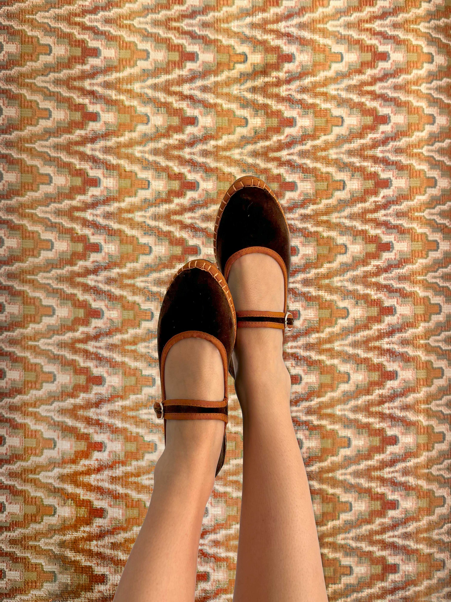 - Velvet mary jane in dark brown with brown piping and buckle closure.