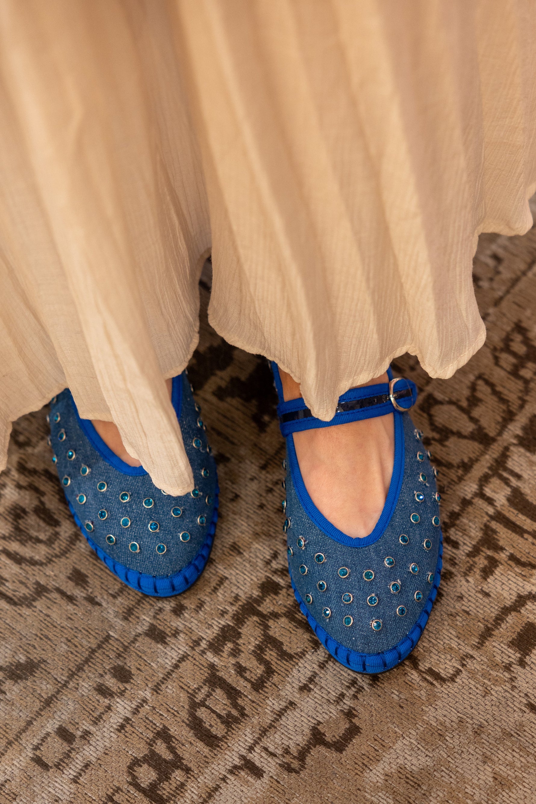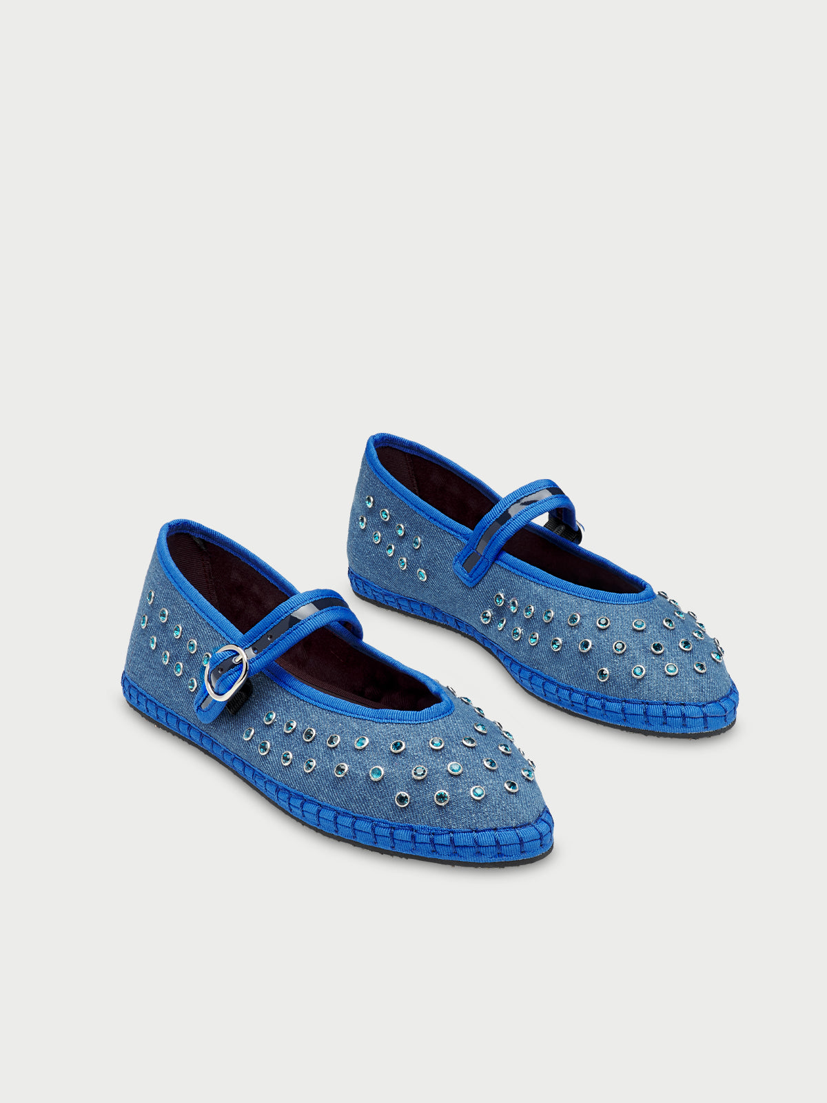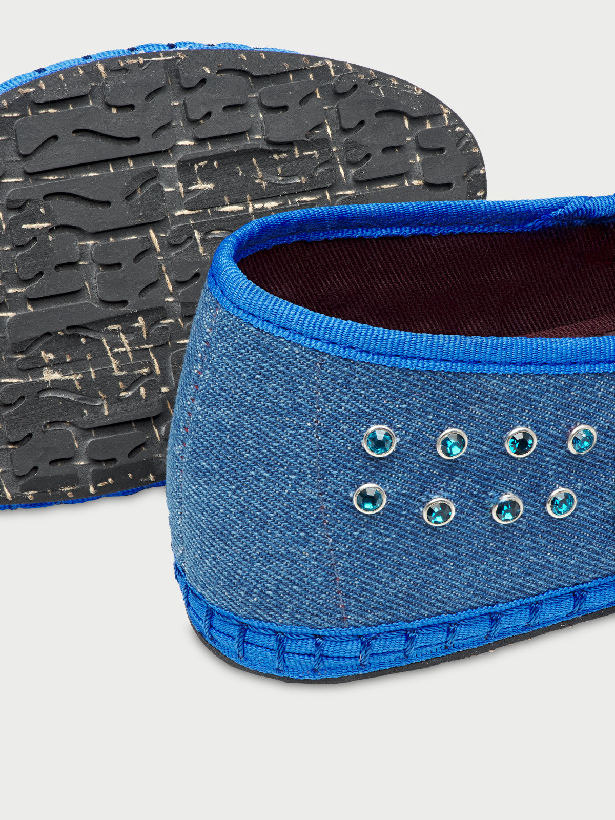 - Denim ballerina v-hole in blue with blue piping and blue crystal studs.
