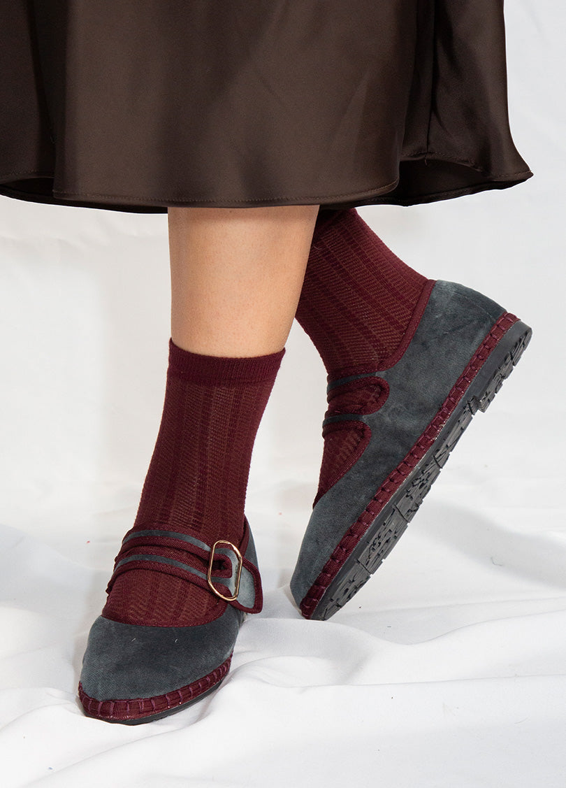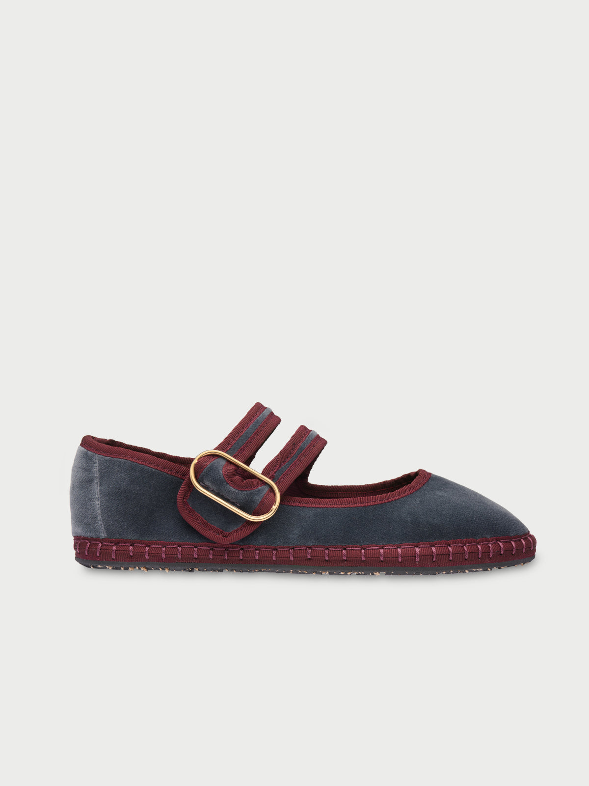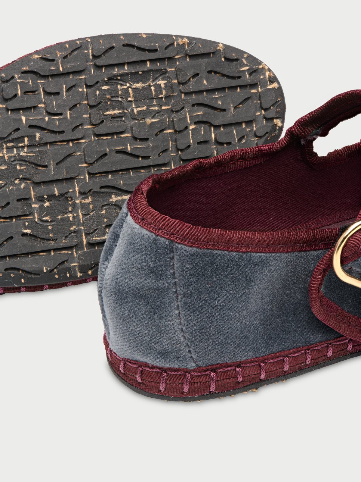 - Two strap velvet mary jane in grey with burgundy piping and a fake buckle.