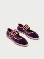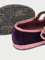 - Two strap velvet mary jane in purple with pink piping and a fake buckle.