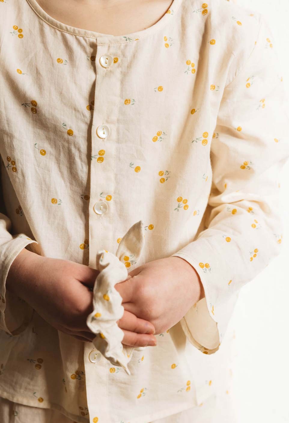 Deux façons de porter ce chouchou blossom safran en gaze de coton, pour deux fois plus de style : dans les cheveux ou au poignet.