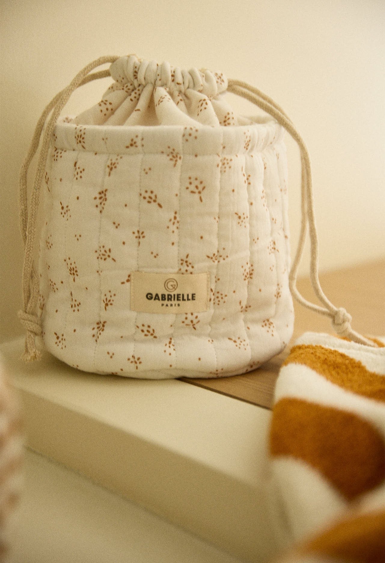 100% gaze de coton biologique (certifié label GOTS & Oeko-Tex standard 100) Intérieur : ouate 100% polyester Nos produits sont « AZO FREE » (exempt de colorants de classe AZO, nocifs pour la peau et l'environnement) Dimensions : D15 x H16 cm Refermable par lien de serrage sur le dessus Lanières en coton