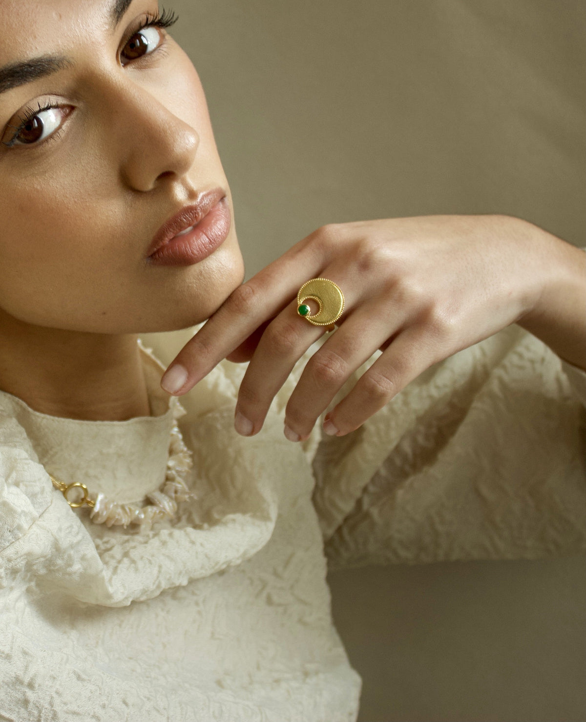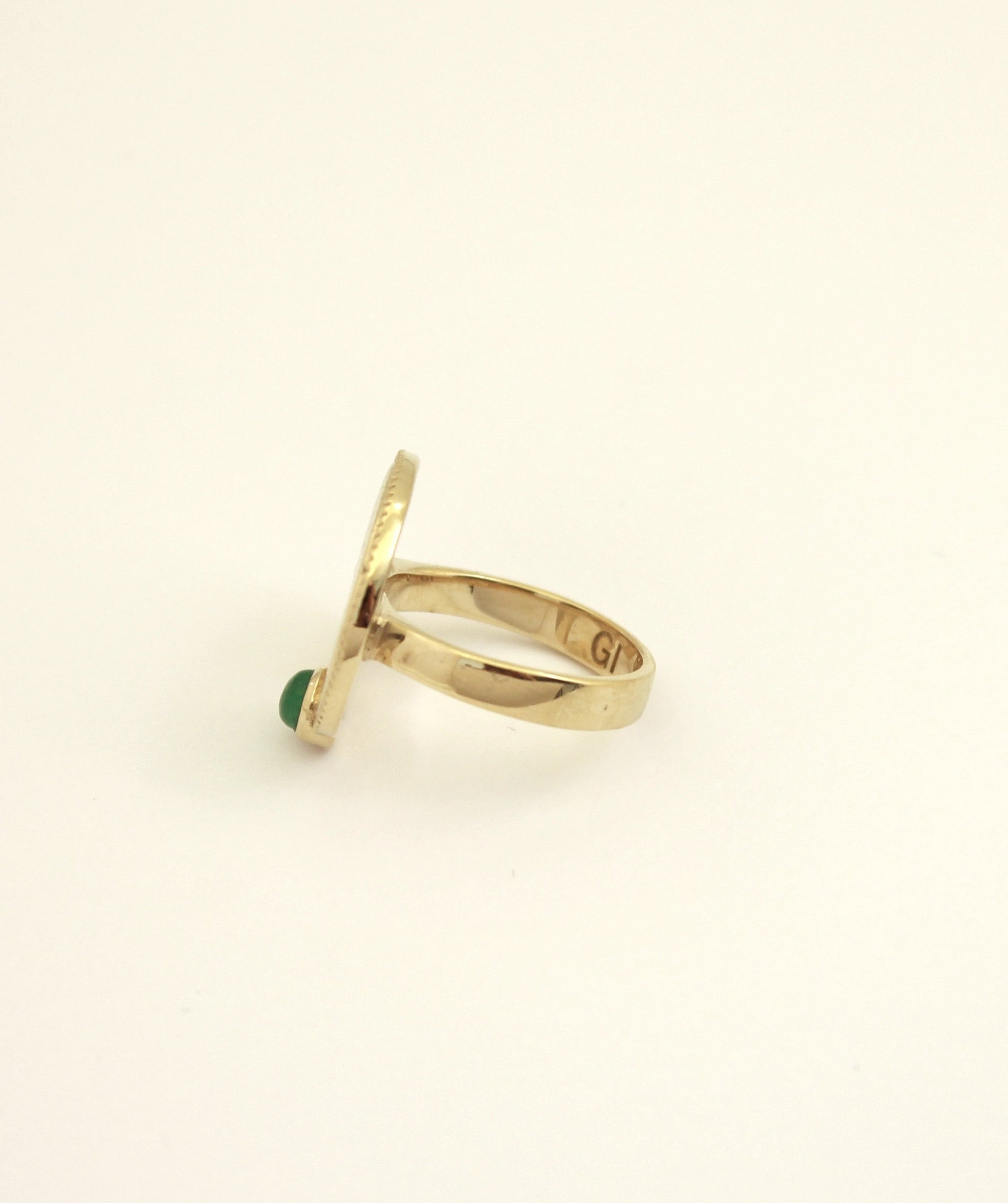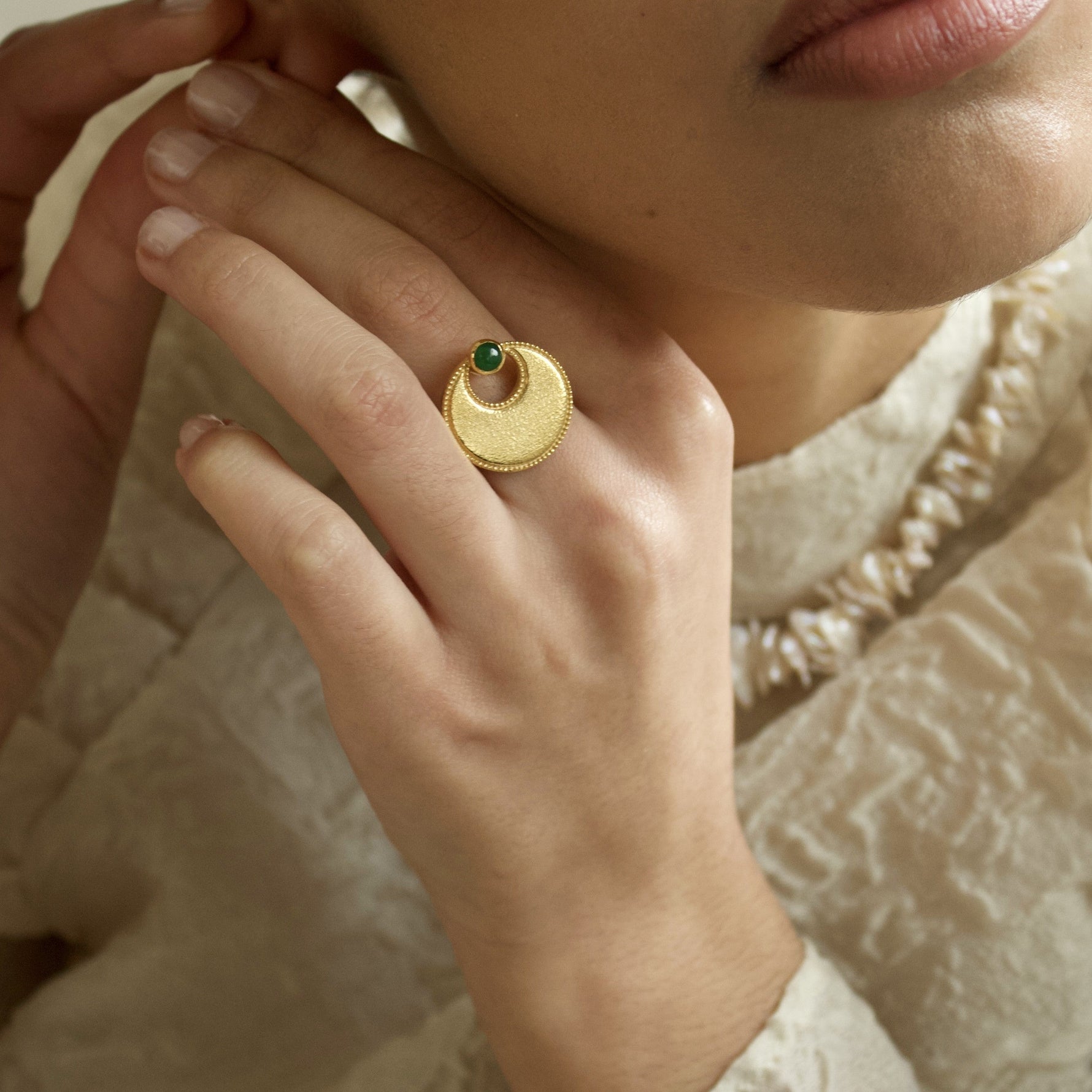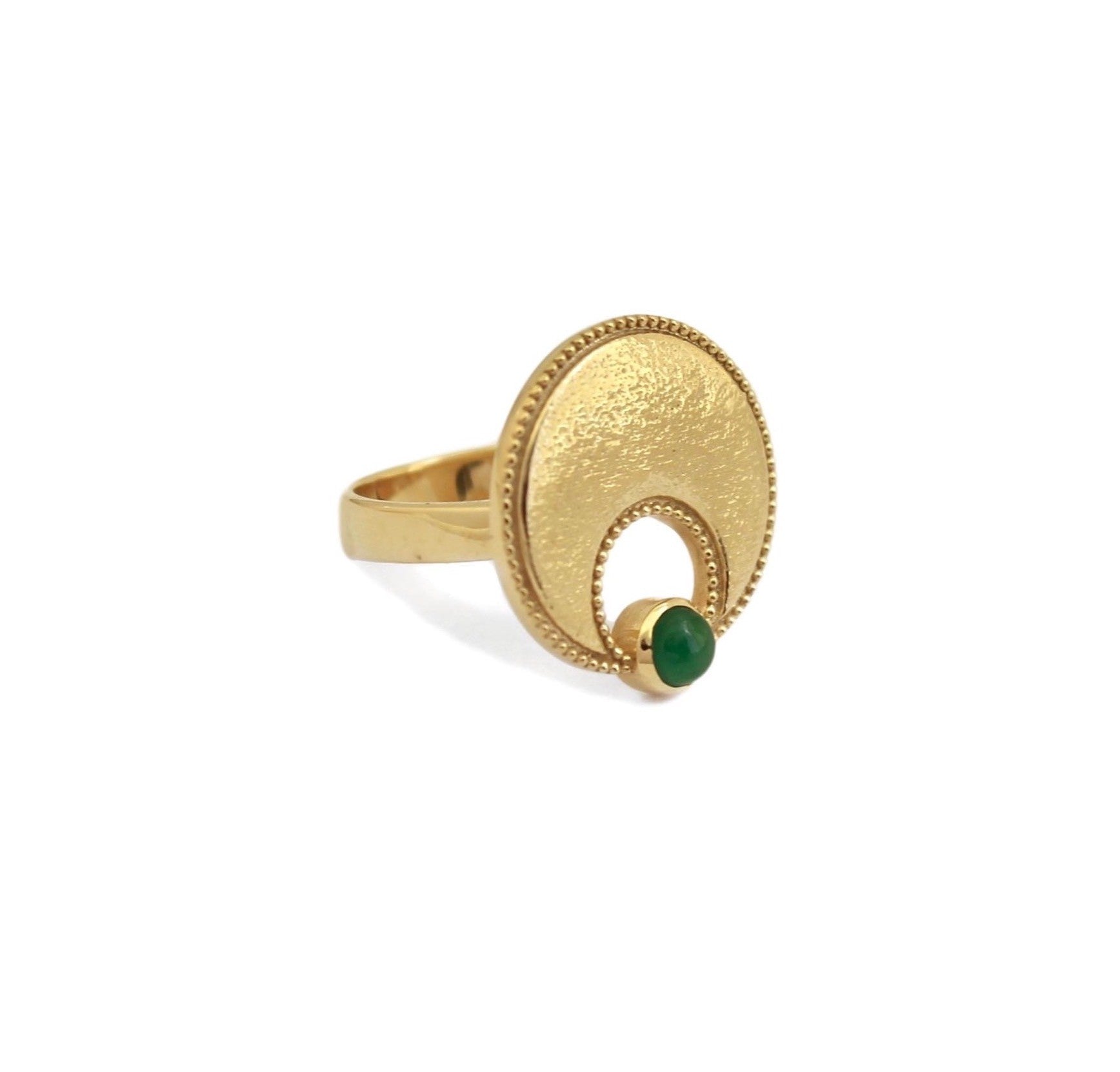 La bague Harmonie est inspirée de symboles anciens de la lune. Elle est sertie d'une délicate pierre semi-précieuse d'Aventurine verte.