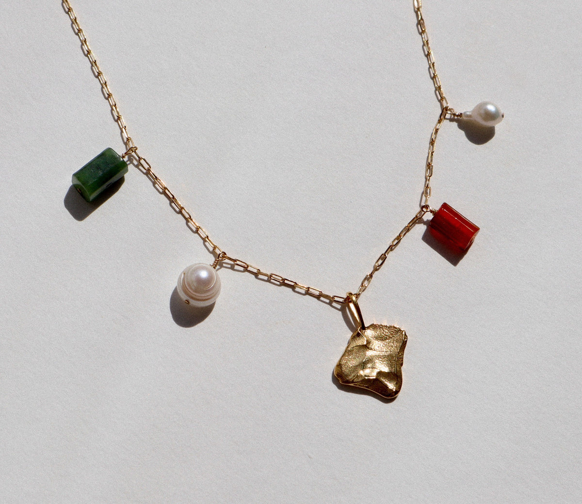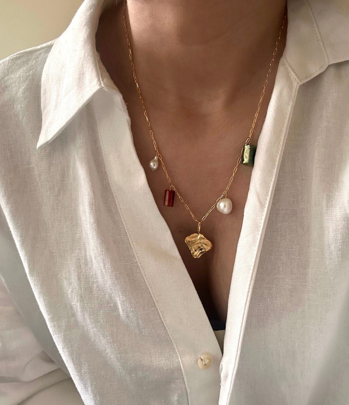 Le collier Marla est orné de délicates perles naturelles baroque et de pierres d’Agate. Son pendentif texturé lui apporte puissance et chaleur. Le parfait mélange pour un bijou solaire et estival.