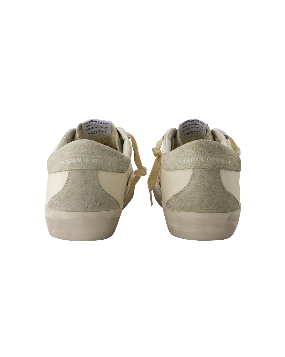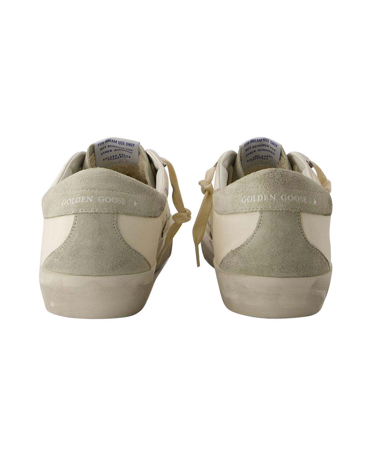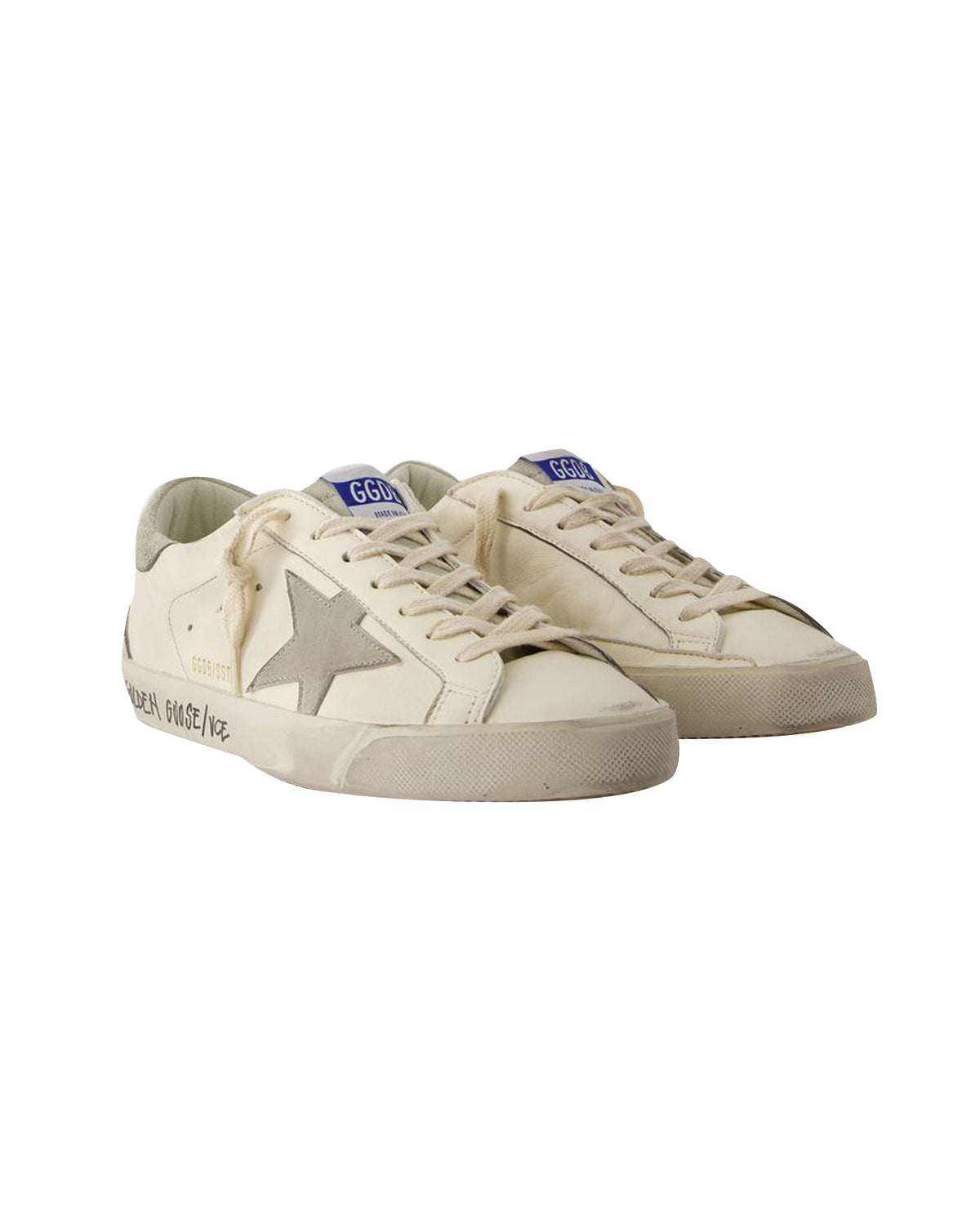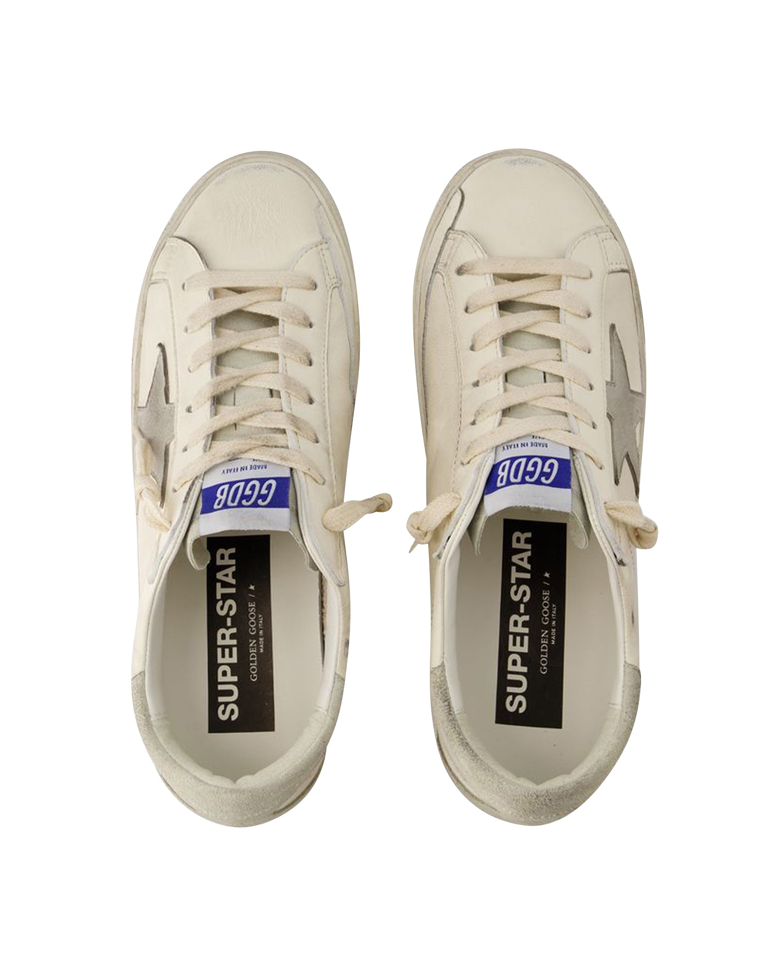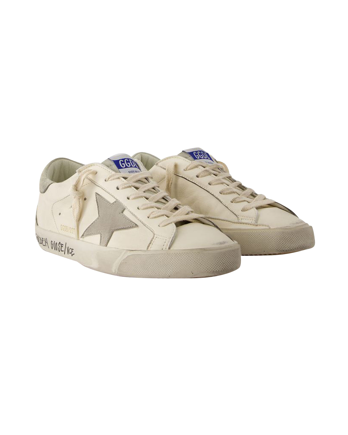 Baskets Super Star - Golden Goose Deluxe Brand - Cuir - Blanc. Adoptez un style urbain chic avec les baskets Super Star de Golden Goose Deluxe Brand, disponibles chez Monnier Paris. Ces baskets iconiques, au caractère unique, sont la base idéale pour un look à la fois décontracté et élégant. Associez-les à un jogging ajusté et un t-shirt graphique pour une tenue athleisure résolument tendance. Laissez les détails usés de ces baskets apporter une touche d'originalité à votre look, que ce soit pour faire des courses ou prendre un café entre amis. Sublimez votre style urbain avec les baskets Super Star – un mélange de confort et de mode, en exclusivité chez Monnier Paris. Coloris : Multicolore - Blanc/Gris glacé. Matière principale : cuir de veau lisse. Semelle : caoutchouc. Doublure : cuir. Fermeture : lacets. Bout : rond. Pointure : conforme à la taille européenne.