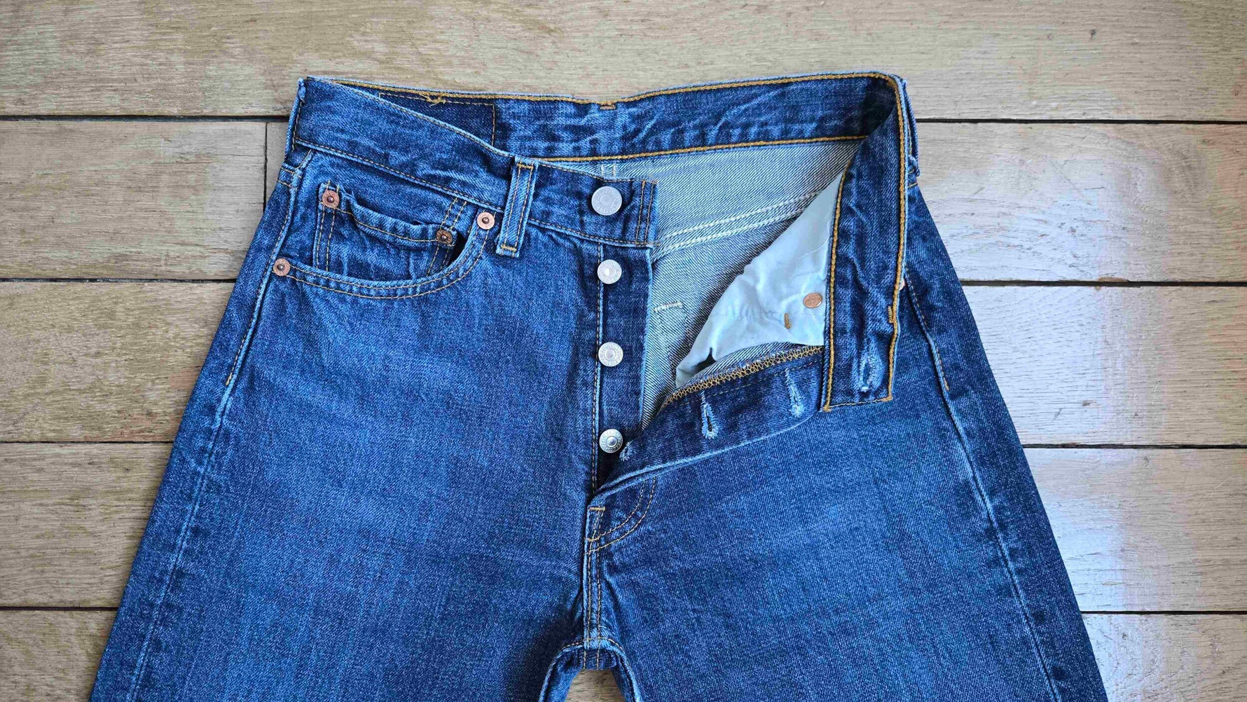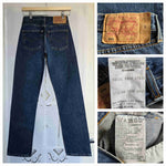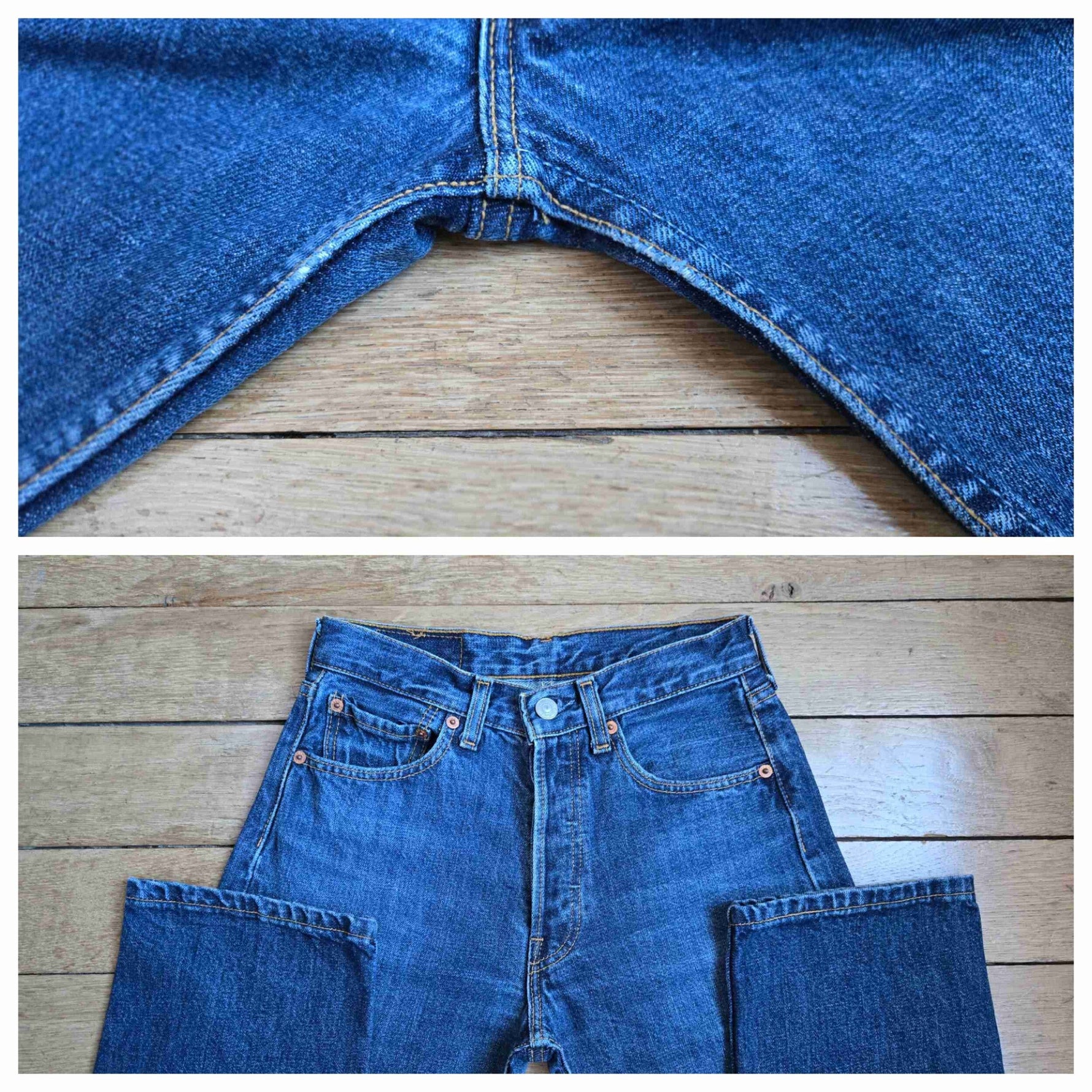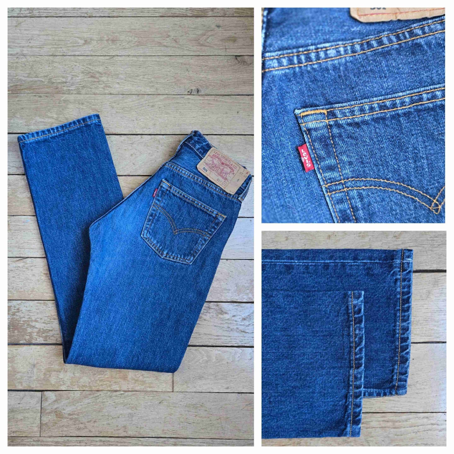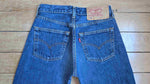 Unit price perLevi's jeans, W27L32, medium-dark blue. Original hems. 100% cotton. Made in Spain. Outer leg length 102 cm. Inseam 26 cm.