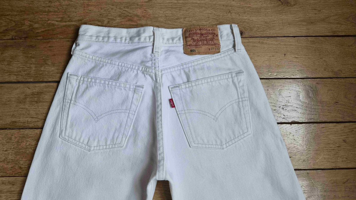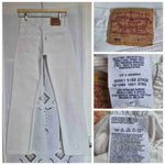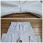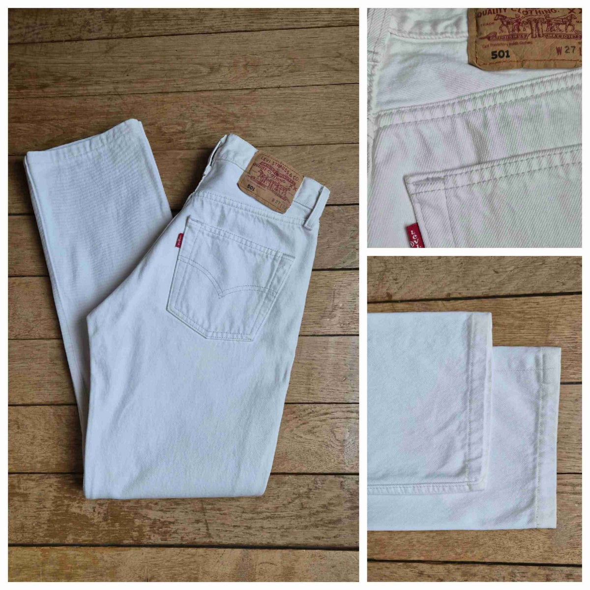 Unit price perWhite Levi's jeans, size W27L32. Hem not original. 100% cotton. Outer leg length 98 cm. Inseam 26 cm.