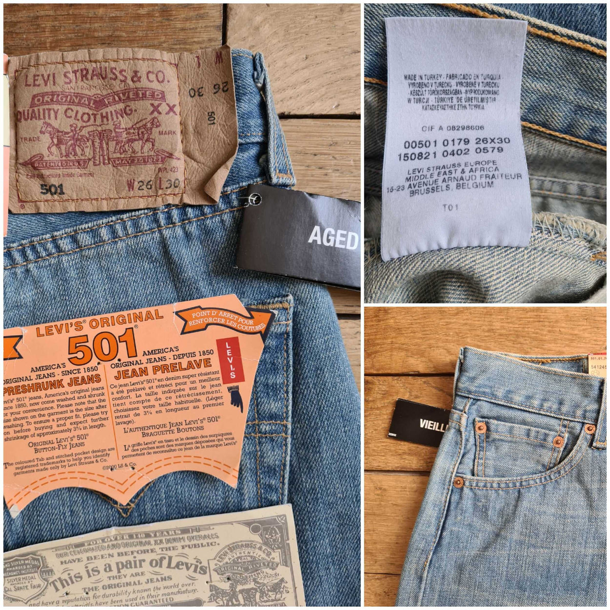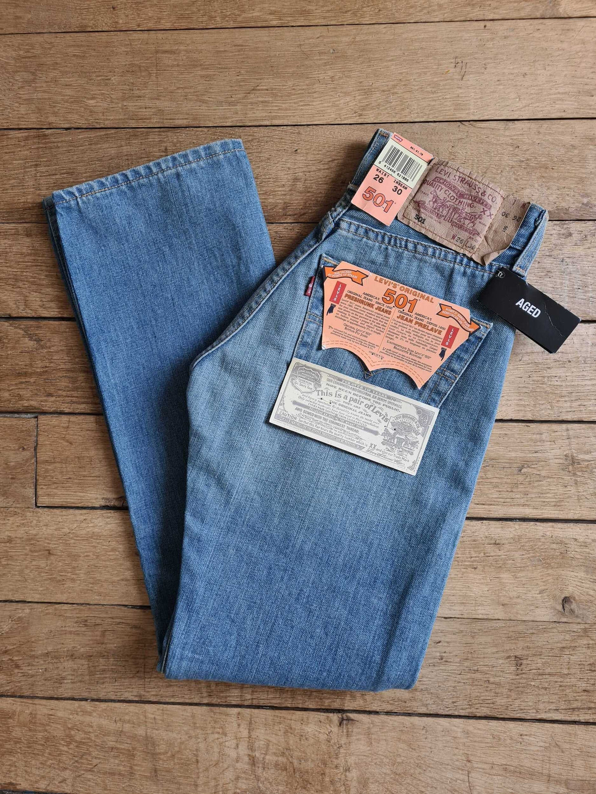 Unit price perLevi's 501 jeans, W26L30, fairly light blue, "aged" series. Deadstock 2002. Original labels are no longer present on the jeans. Please check the measurements carefully; the size corresponds to a current size 32. Outer leg length 98 cm.