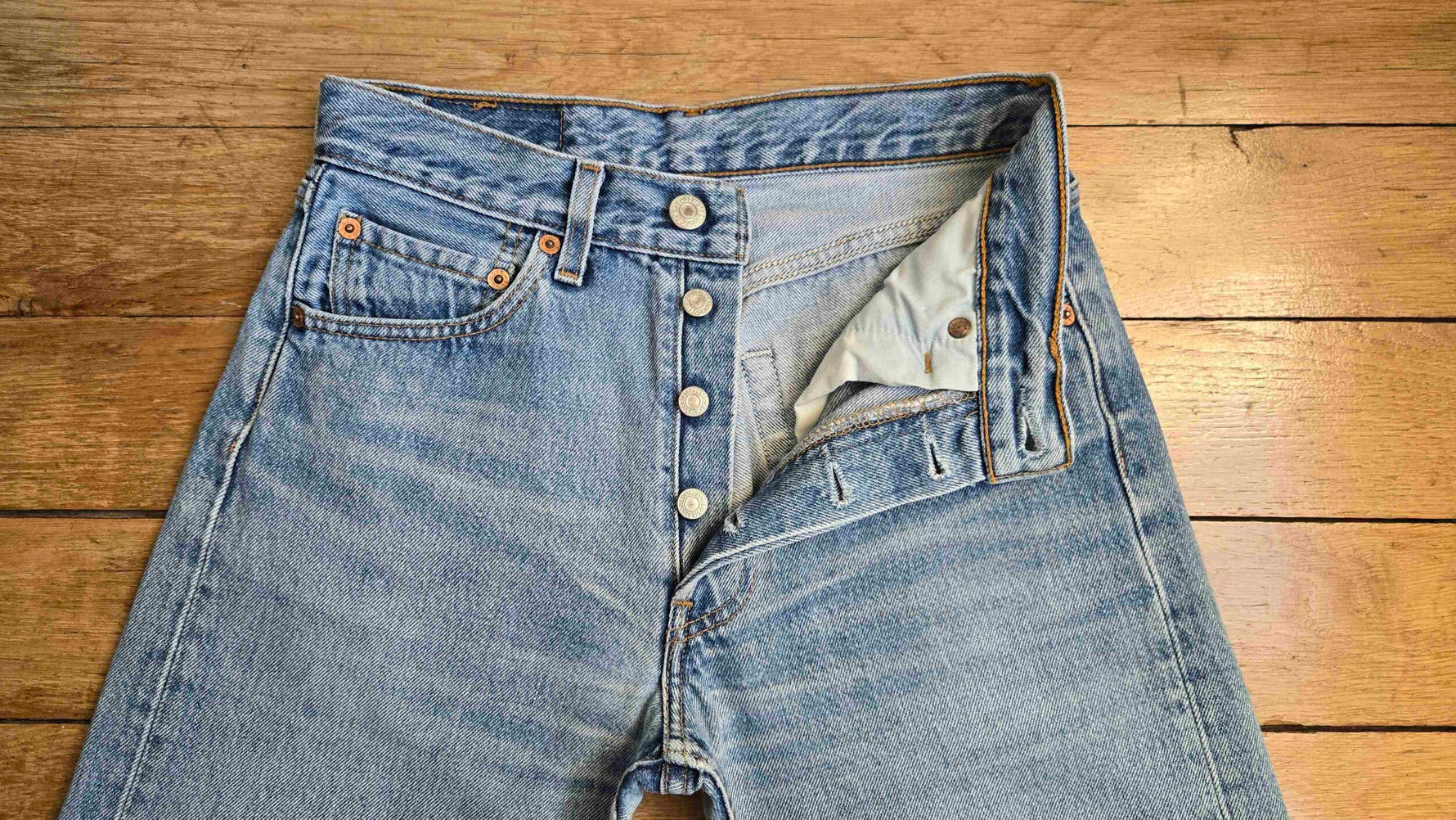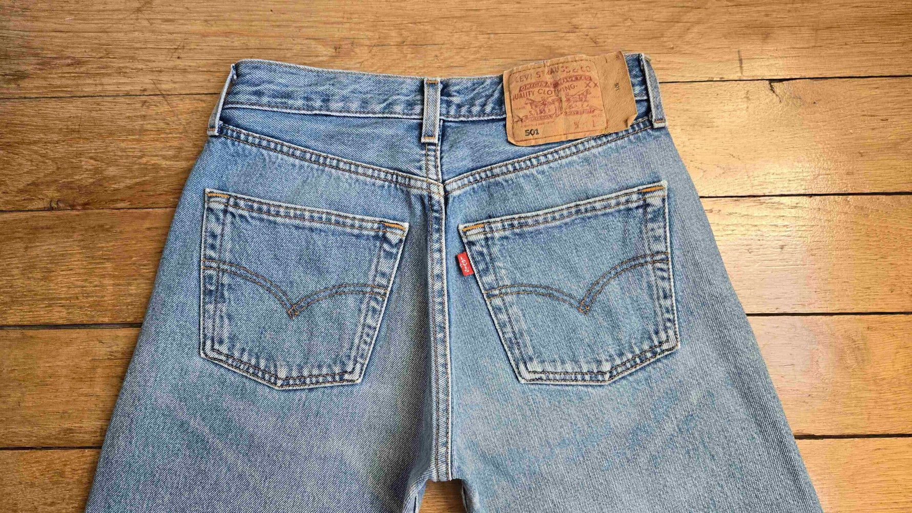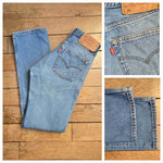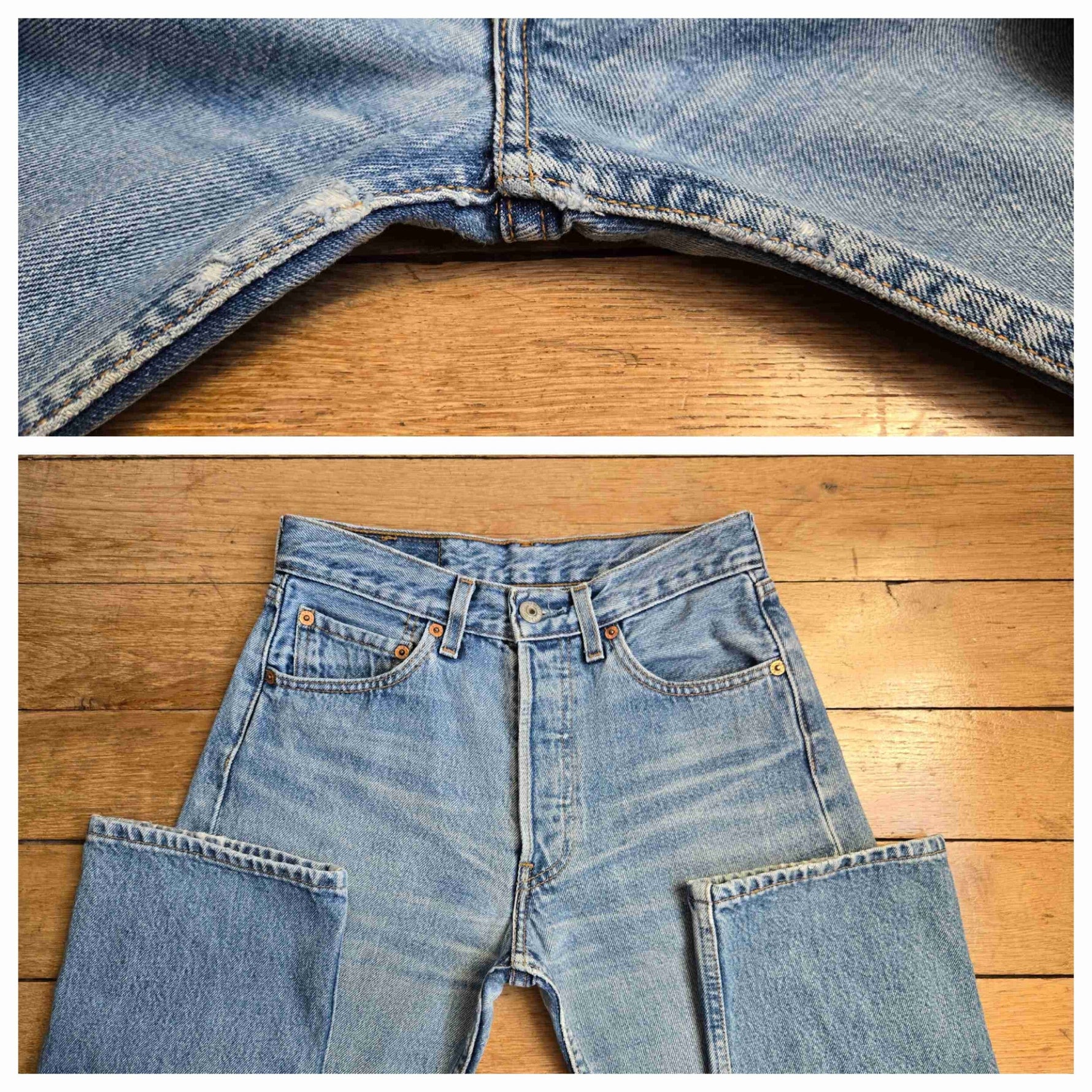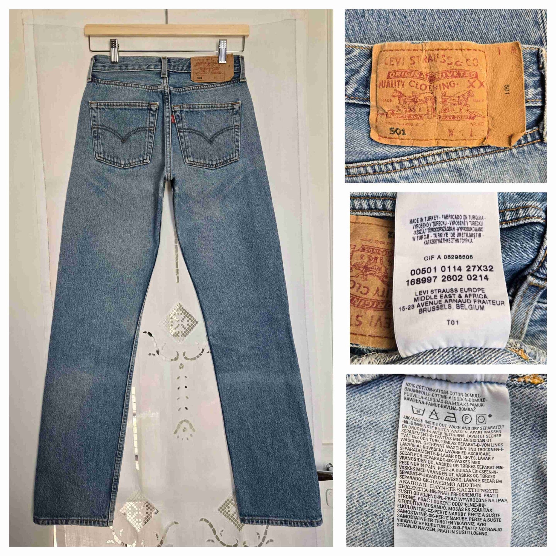 Unit price perLight blue Levi's jeans, size W27 L32. Original hems. 100% cotton. Outer leg length 102 cm. Inseam 26 cm.