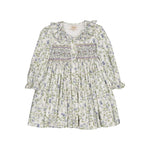 Adeline, robe à smocks, en imprimé romantique avec des fleurs bleues