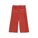Pantalon à jambes évasées en velours côtelé rouge brique. Deux poches plaquées sur le devant avec leurs jolis boutons marbrés - bordures dorées.
