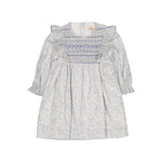 Léa-Rosa, robe à smocks imprimé feuillage dans les tons bleus