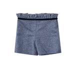 Short en laine chevronné marine et orné de son ruban de velours. Il s'associe parfaitement avec une jolie chemise à imprimée.