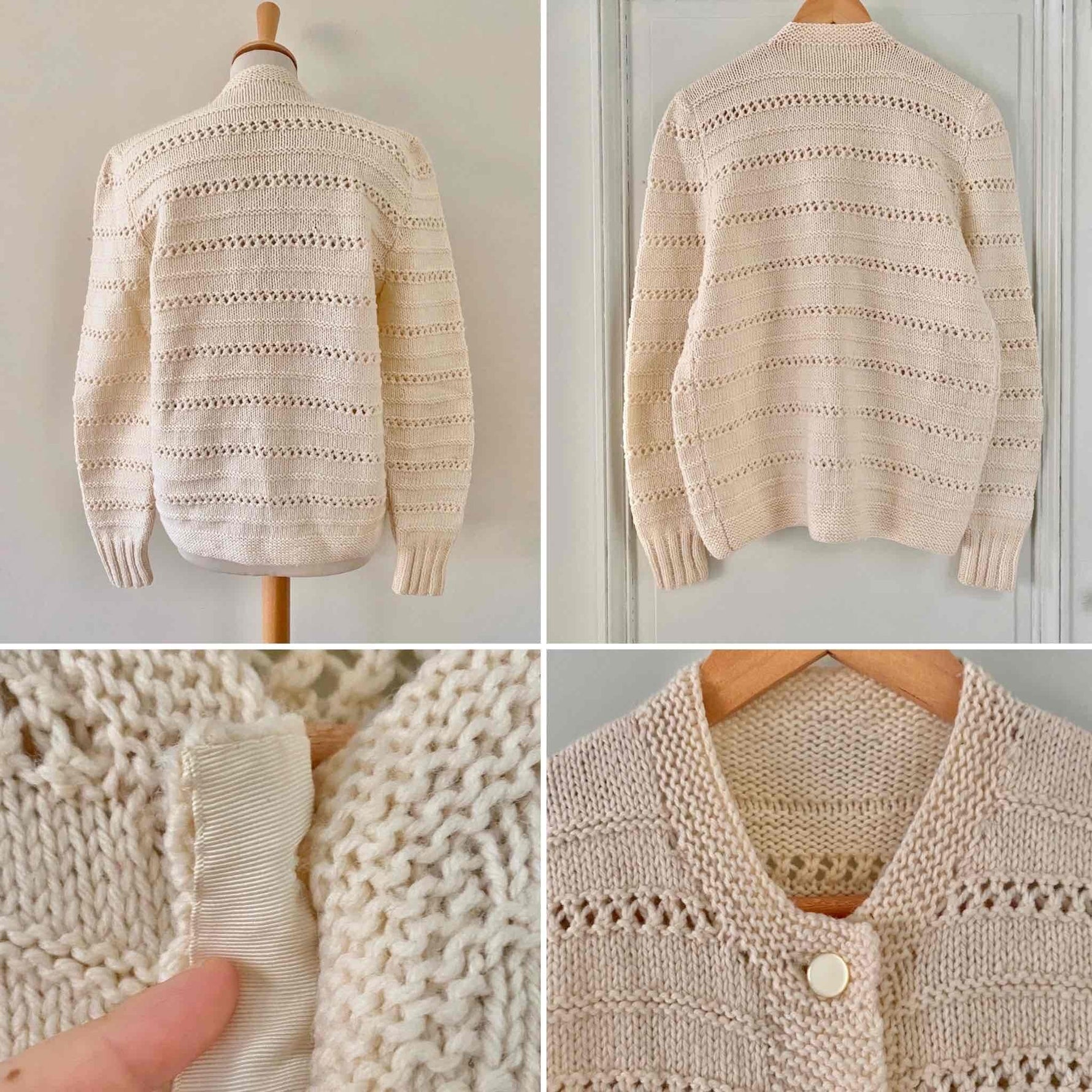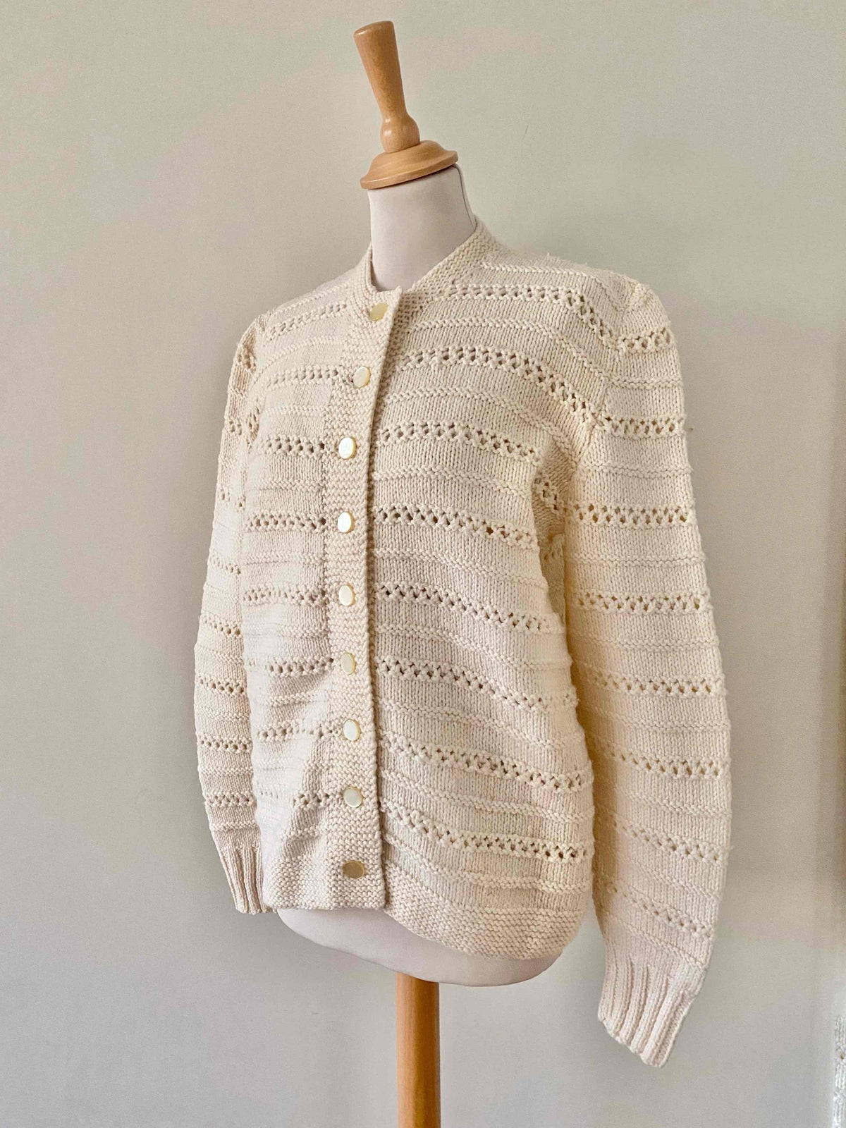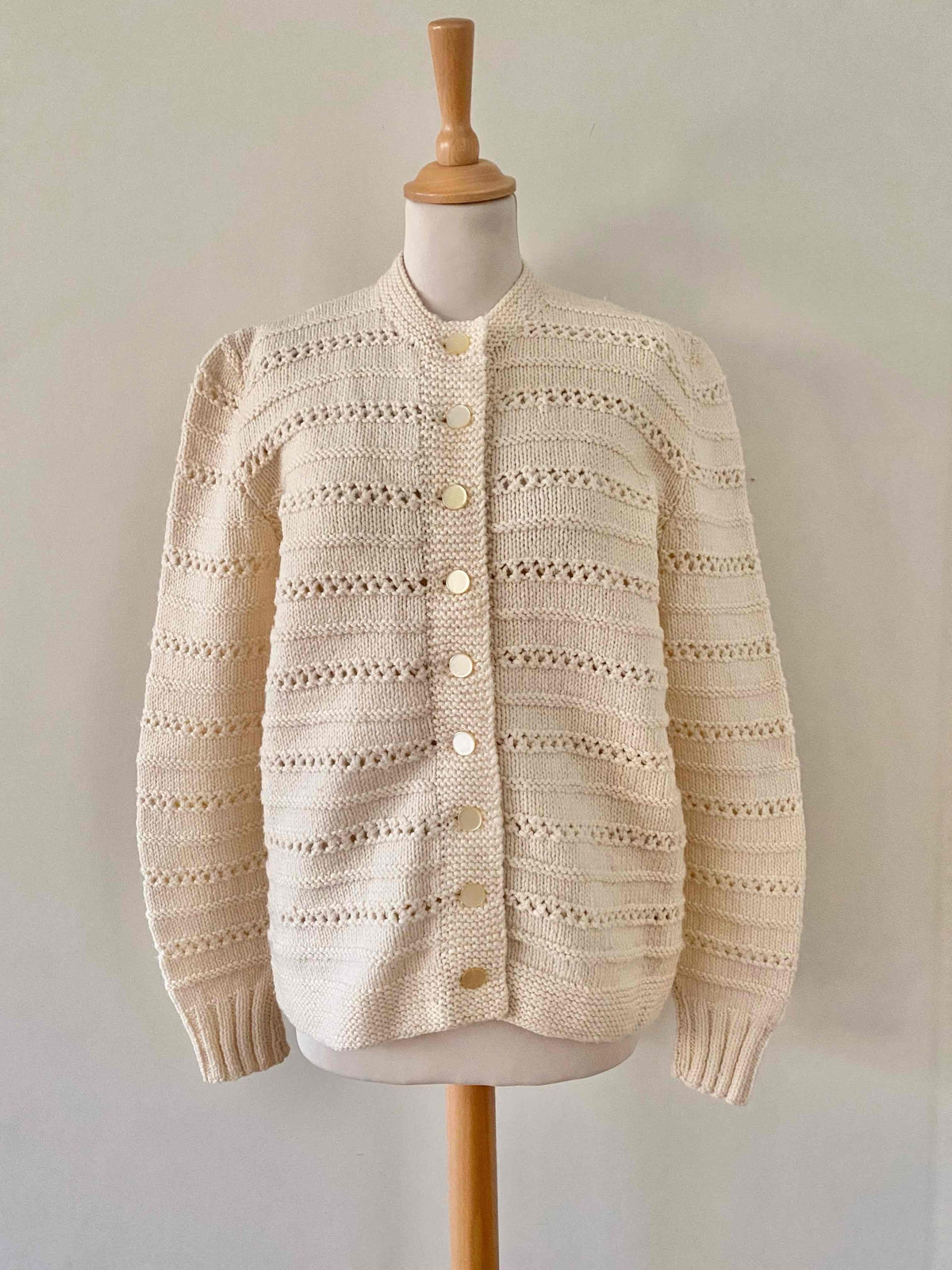 Unit price perAustrian cardigan in pure cream-colored wool, with openwork pointelle knit, balloon sleeves, and mother-of-pearl mirror buttons, hand-knitted.