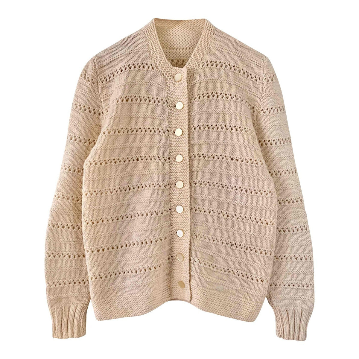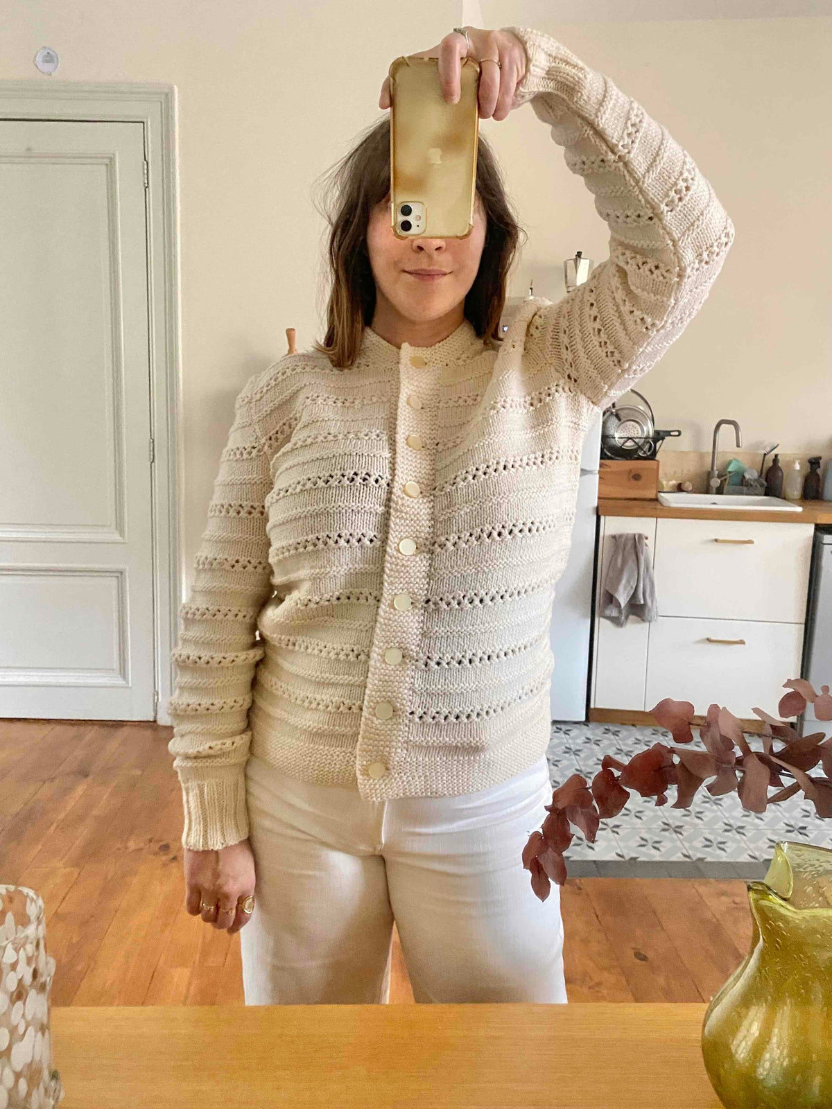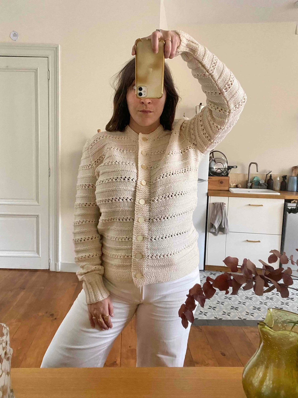 Unit price perAustrian cardigan in pure cream-colored wool, with openwork pointelle knit, balloon sleeves, and mother-of-pearl mirror buttons, hand-knitted.